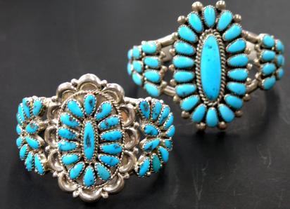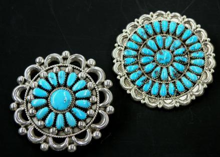Zuni and Navajo turquoise cluster pins. Very similar, but do show slight differences. The Zuni pride themselves on stone work and they do not like to show lots of matrix, the Navajo piece shows lots of matrix. Also, remember the silver, the Zuni piece (on the left) has that nice open design, the Navajo piece has the heavier silver look.