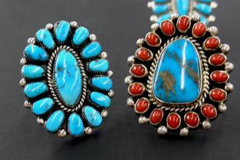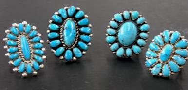 Cluster rings can be very difficult, because you just can’t get a bunch of stones or silver into the piece. The two on the left are Zuni, the stones show a little less matrix. The middle right ring is the easiest to identify because the stones are just a style you find in Navajo, usually purchased already cabbed where the other pieces have been shaped by the artist.