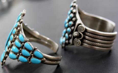 Navajo on the left, Zuni on the right. A very subtle clue is the stone work, notice the Zuni work matches color and size a little better. Also, the Navajo artist just can’t help but add more silver to the work, heavy around the stones.