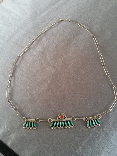 This is a Zuni necklace made by Bernard Peina. It is not going to be very old. Bernard is probably in his early 50s. The material is sterling silver, turquoise and coral. We get buyers from around the world who come to Gallup, New Mexico to buy Native American art. Hope this is the information you are looking for.