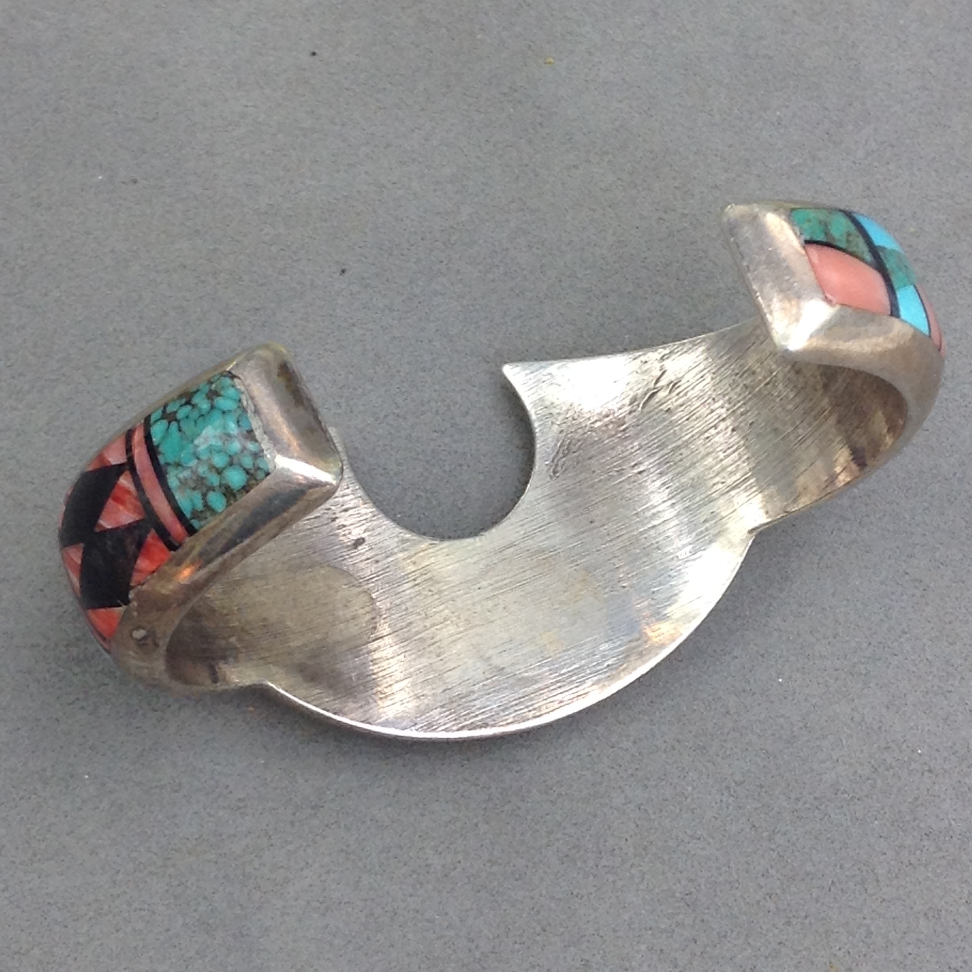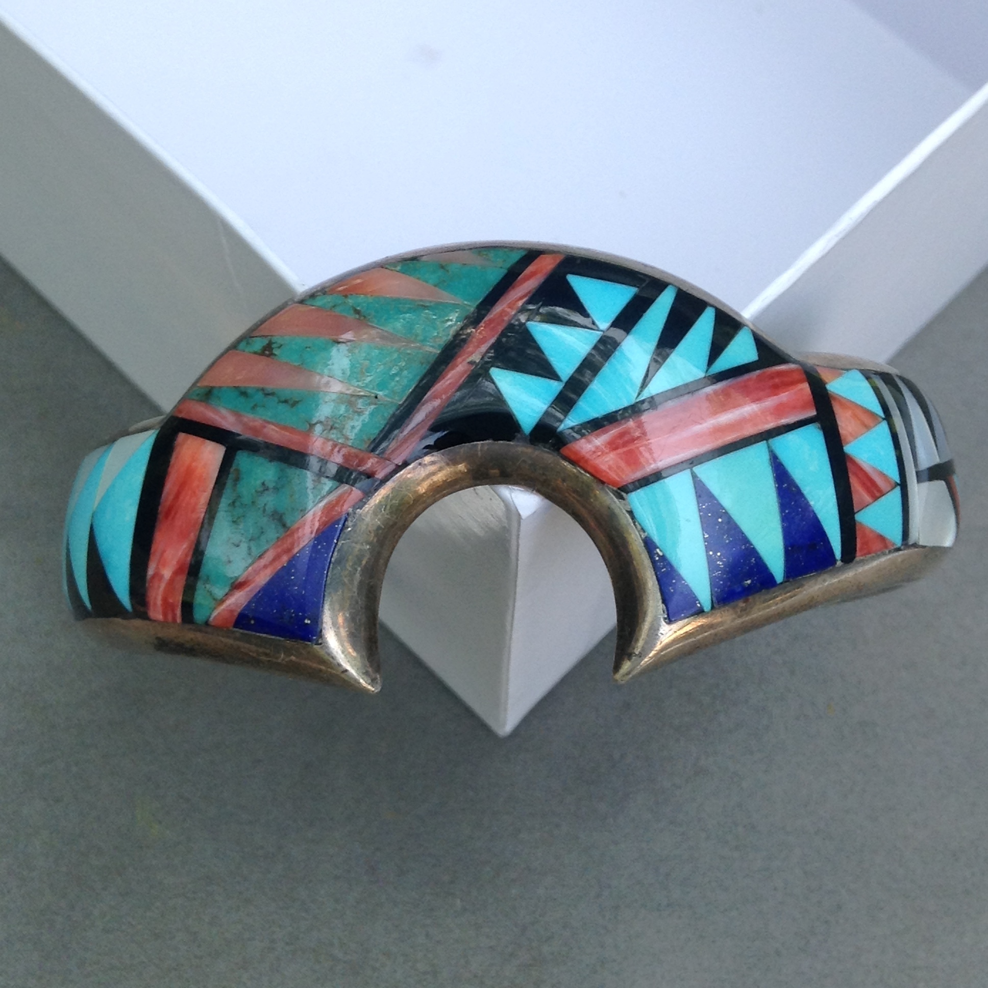 I would be very interested in any thoughts on who/what tribal affiliation might have made the inlaid cuff in the attached photos. The inlay is beautifully done and has a slight curve to it, in other words it is not flat in the mounting.