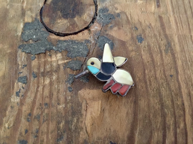 It seems that most inlaid pieces are of Zuni origins, I hope mine are authentic. Wondering what the yellow shell is on this unmarked sterling hummingbird pin/pendant is? Mother of Pearl or maybe oyster?