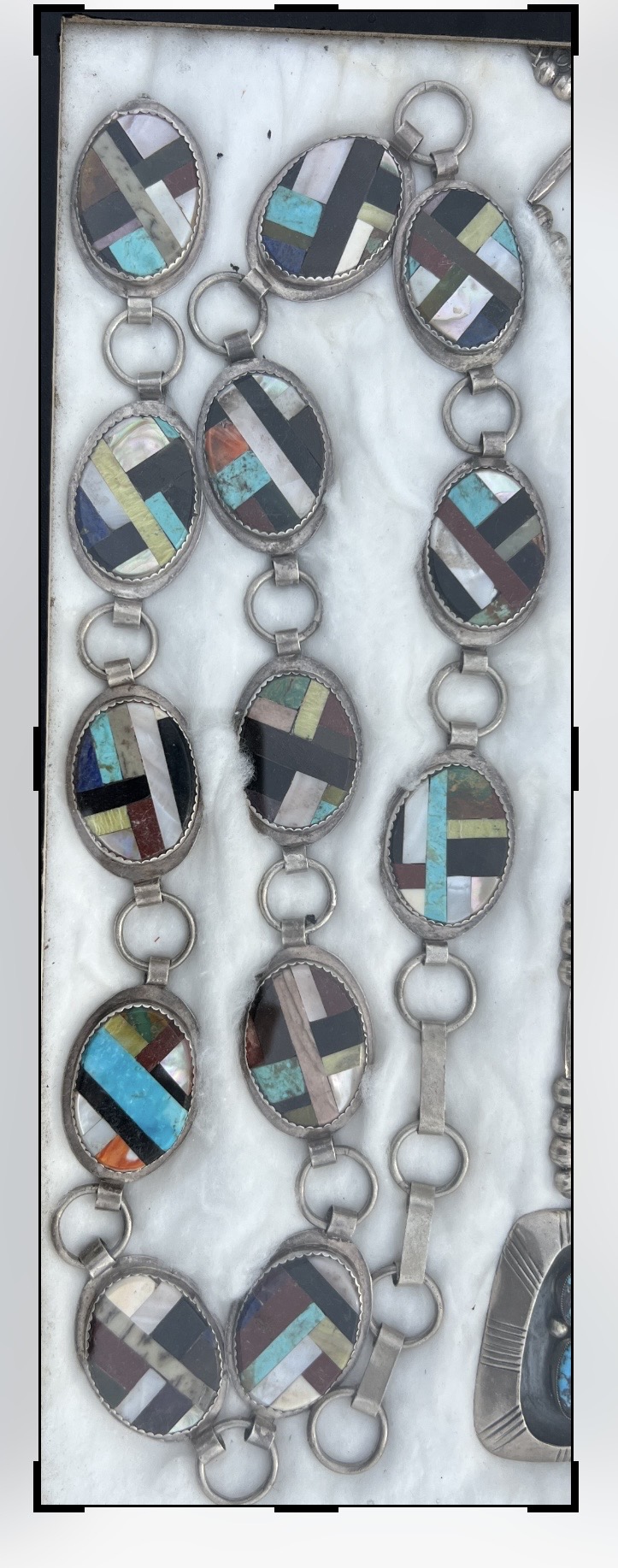 I’ve seen Zuni link belts with conchos consisting of butterfly and Sunface inlay, but yours is a bit more modernist/abstract. A quick search yielded this one made by Calvin Begay and Orlando Spencer. I’m not saying it’s a comparable example, as it is hallmarked by two well known artists, but it may be a nugget to aid in your search.