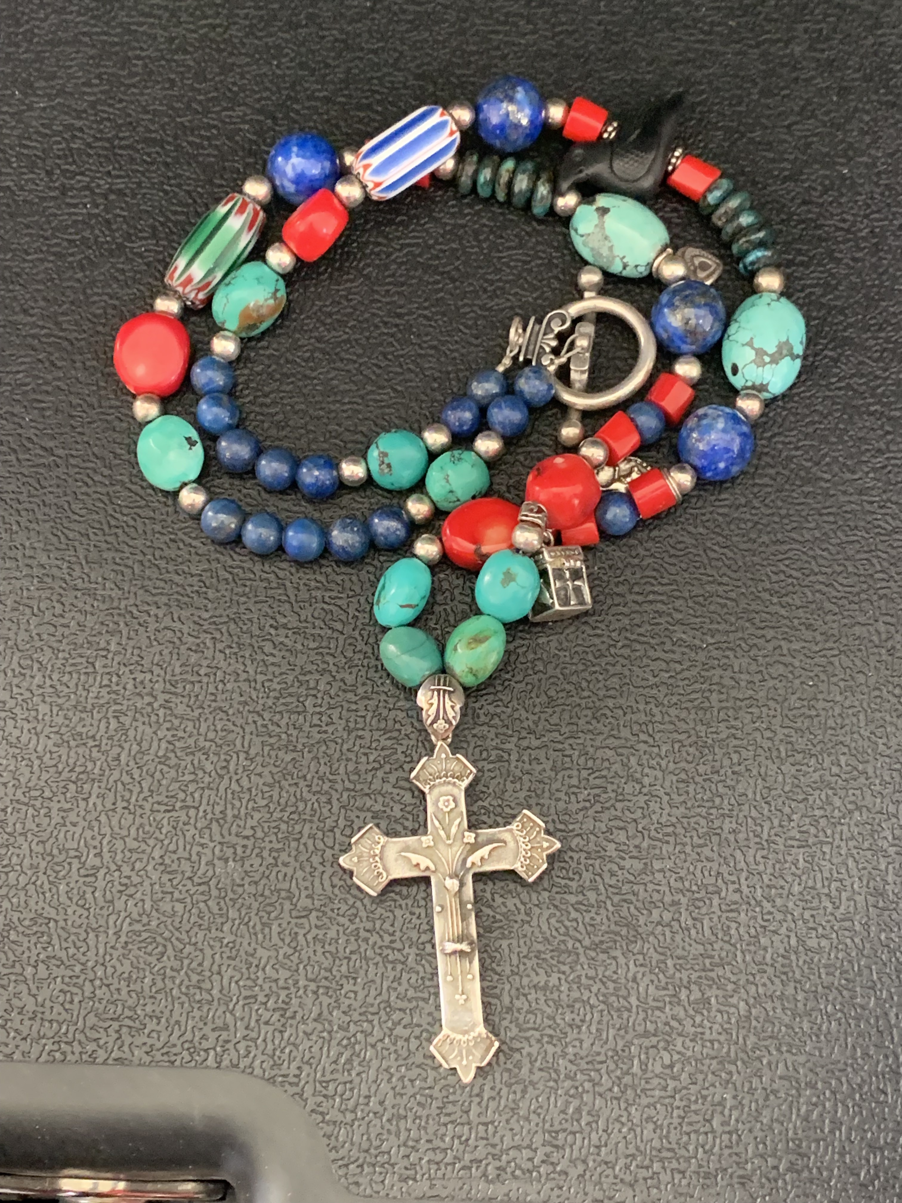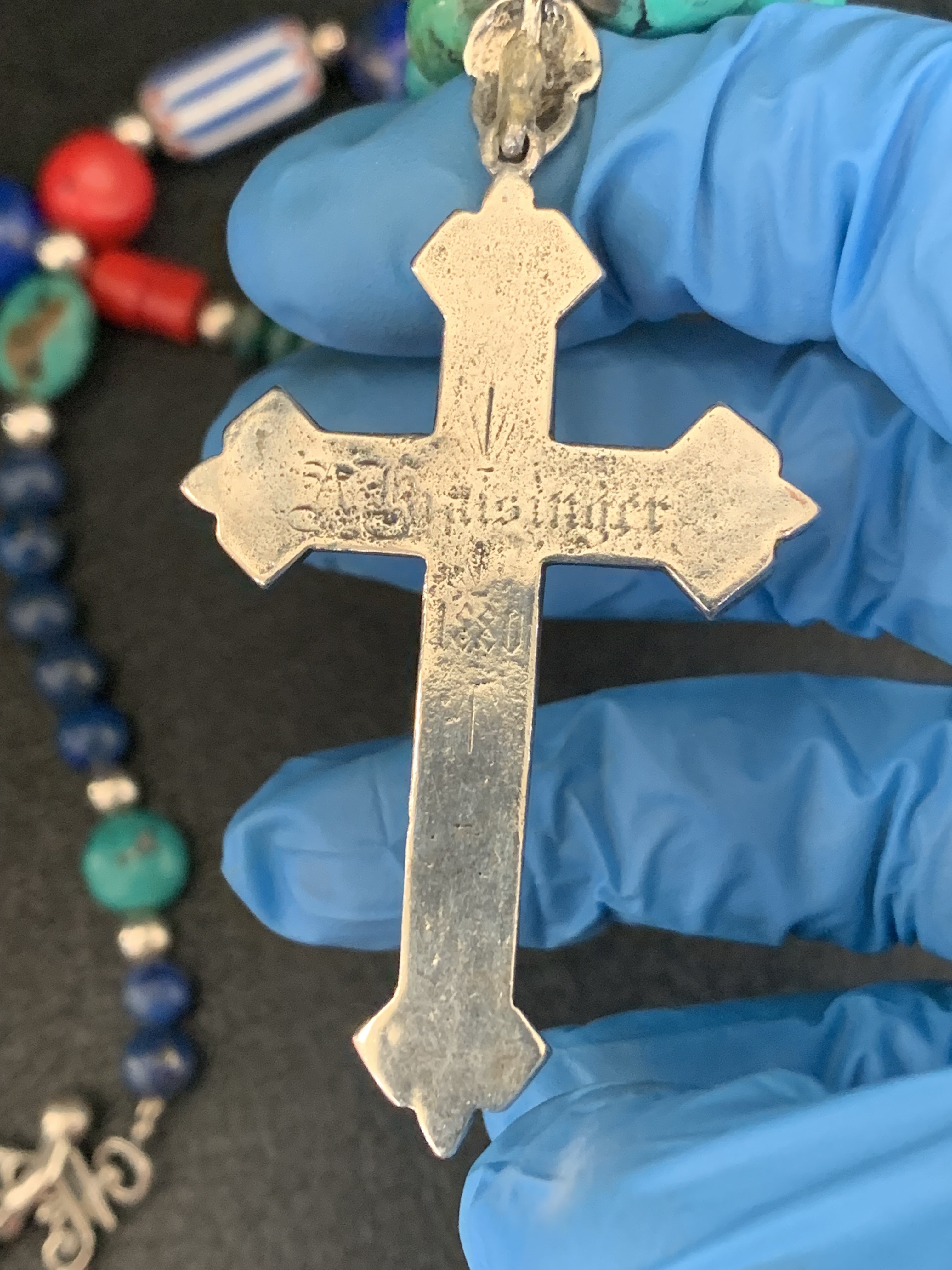 Really nice! The dark blue beads look like Lapis Lazuli if you ask me. And is that the year 1880 inscribed on the back of the cross?