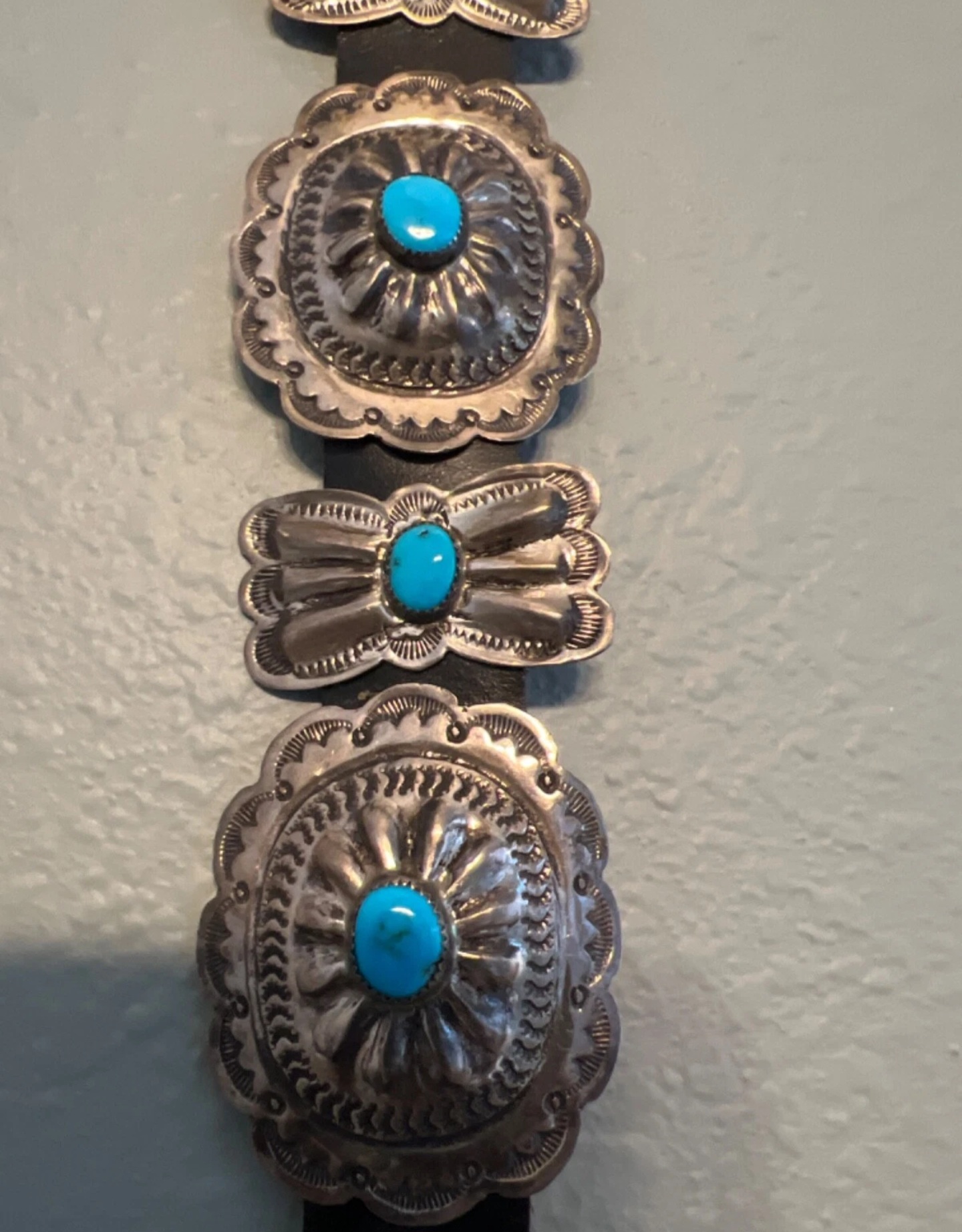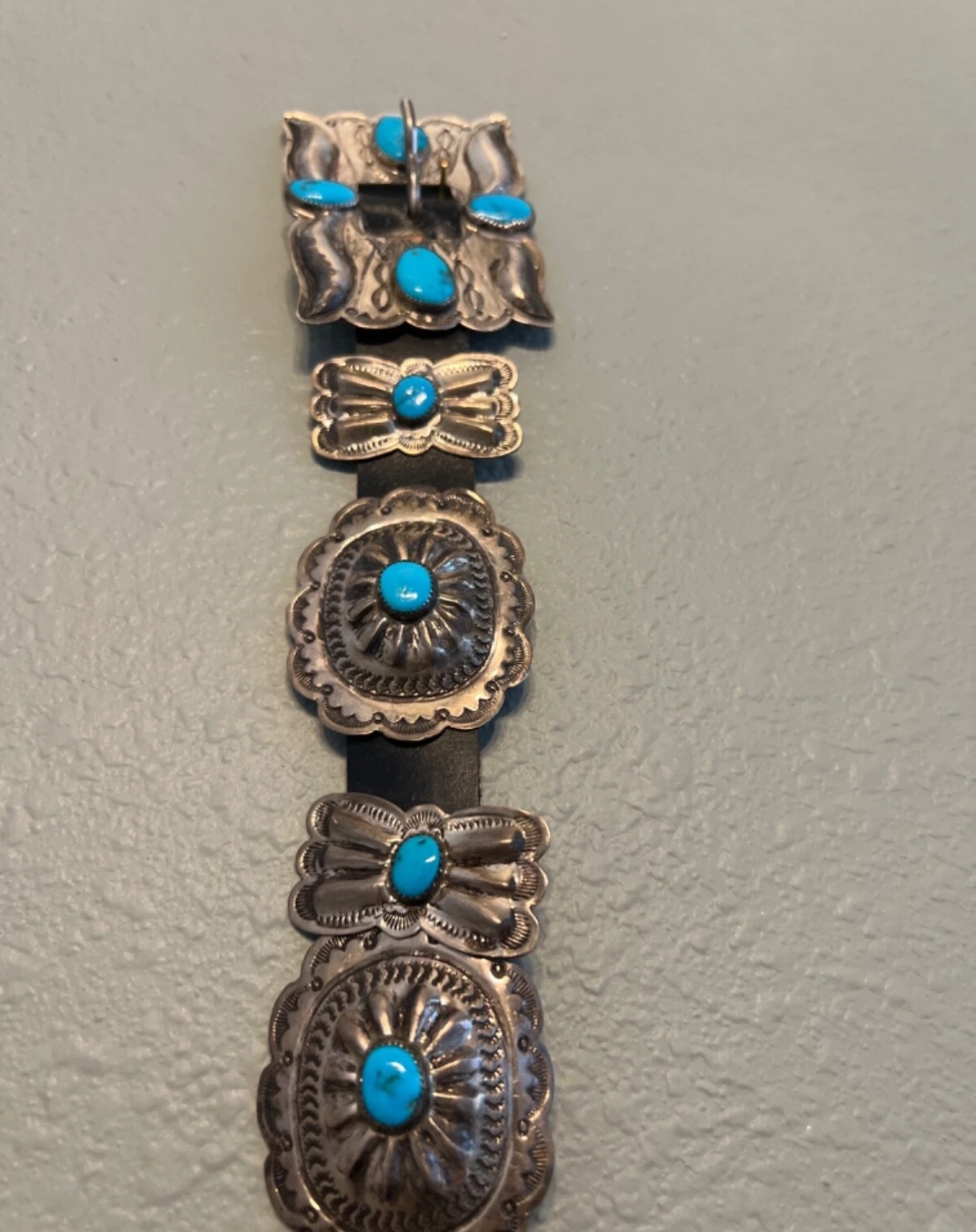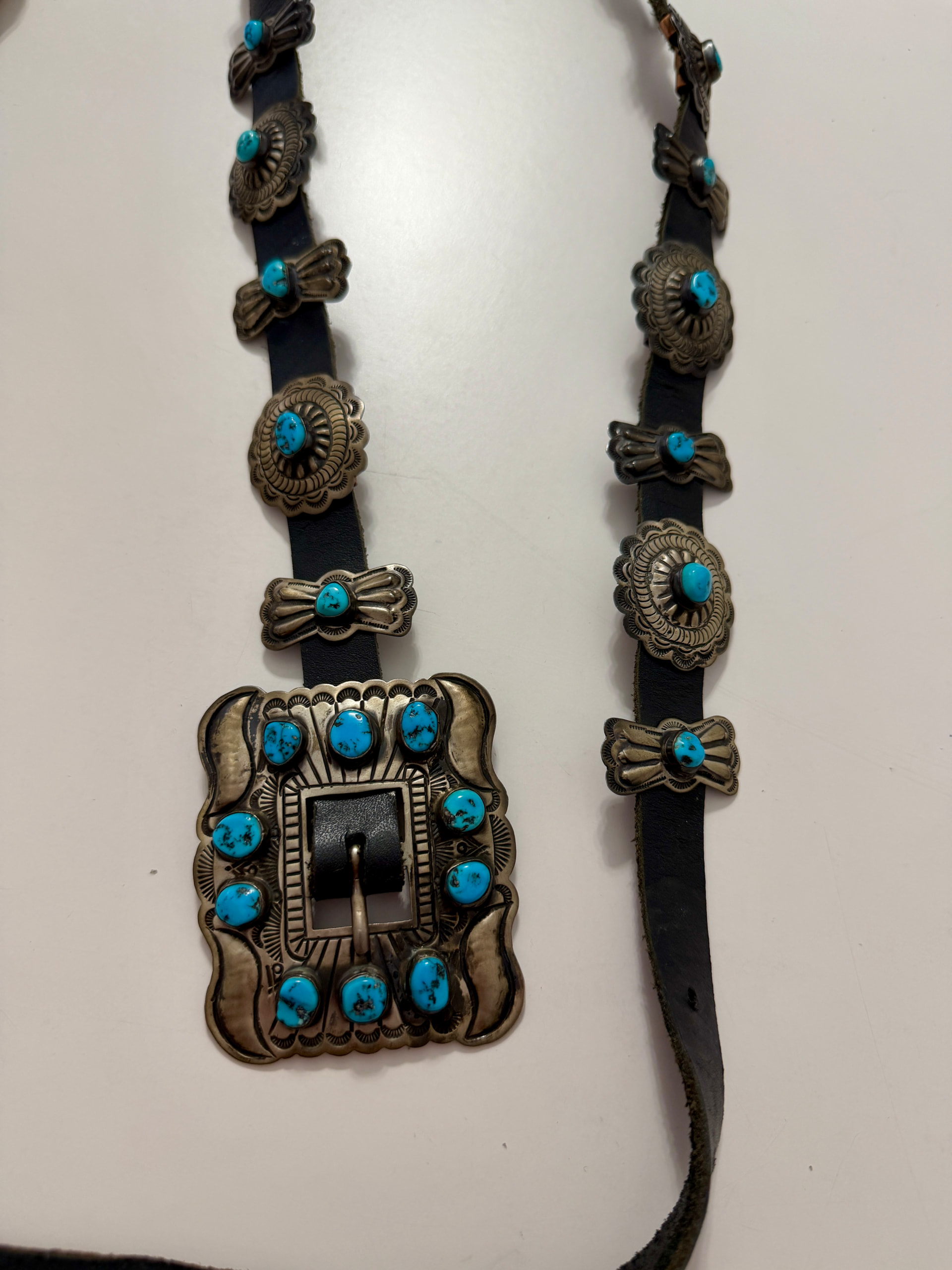 I have been the only owner of this Concho belt purchased in Gallup New Mexico circa 1990. It has a beautiful buckle and crusted with natural turquoise. There are 21 turquoise stones. The buckle is big but not too big. It is 3" x 2 1/2”. The bia Conchos are 2” x 2" and a half oval. The small Conchos are 2" x 1" oblong. Each one comes with a unique Bezold stone. This is trulv one of a kind piece. Purchased off the reservation and only worn once. The leather probablv needs to be Fit to your size but it’s easy to have done. It’s exquisite.
