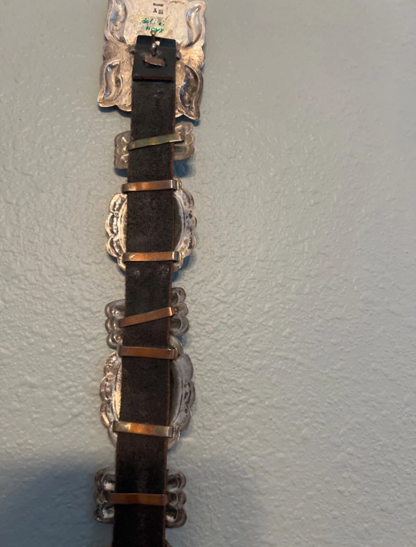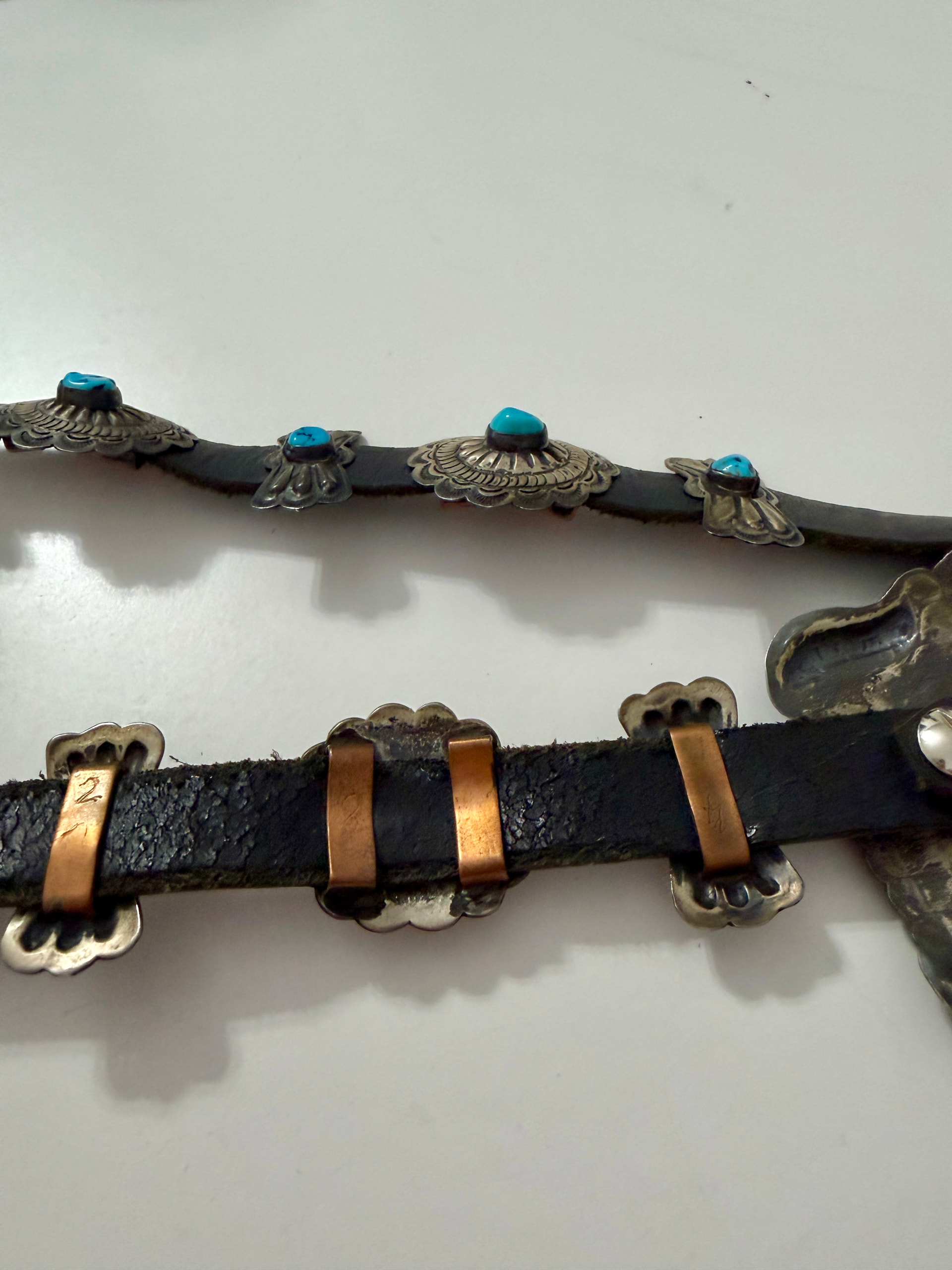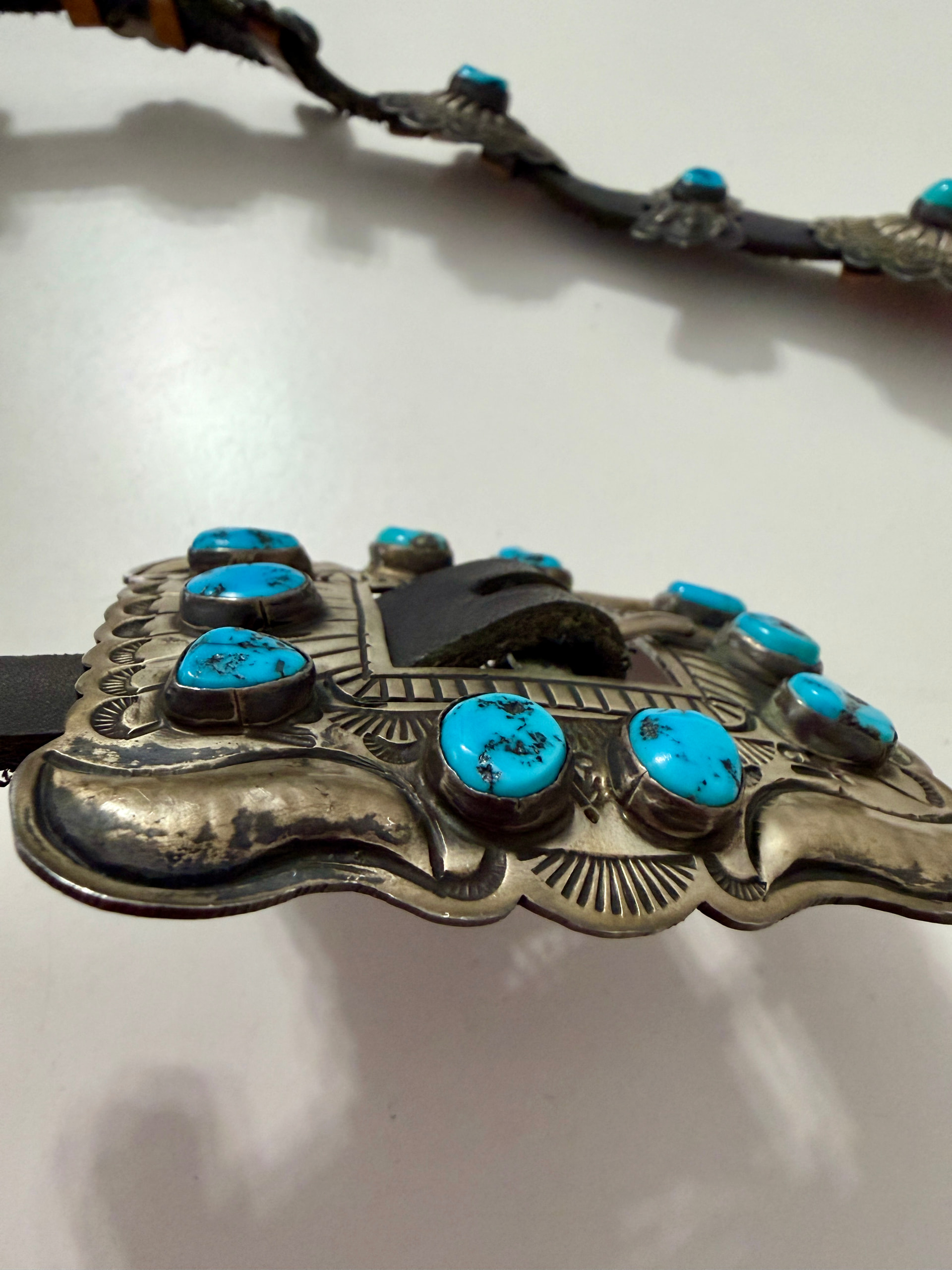 I have been the only owner of this Concho belt purchased in Gallup New Mexico circa 1990. It has a beautiful buckle and crusted with natural turquoise. There are 21 turquoise stones. The buckle is big but not too big. It is 3" x 2 1/2”. The bia Conchos are 2” x 2" and a half oval. The small Conchos are 2" x 1" oblong. Each one comes with a unique Bezold stone. This is trulv one of a kind piece. Purchased off the reservation and only worn once. The leather probablv needs to be Fit to your size but it’s easy to have done. It’s exquisite.