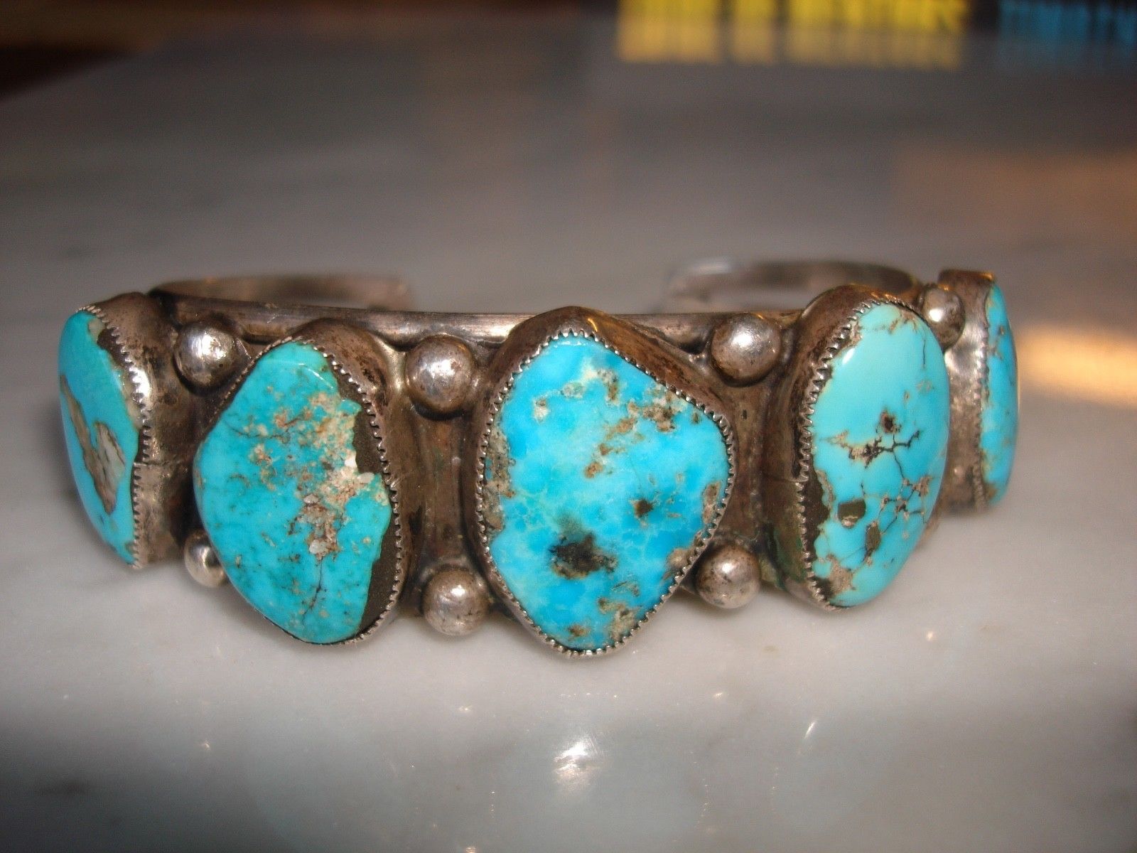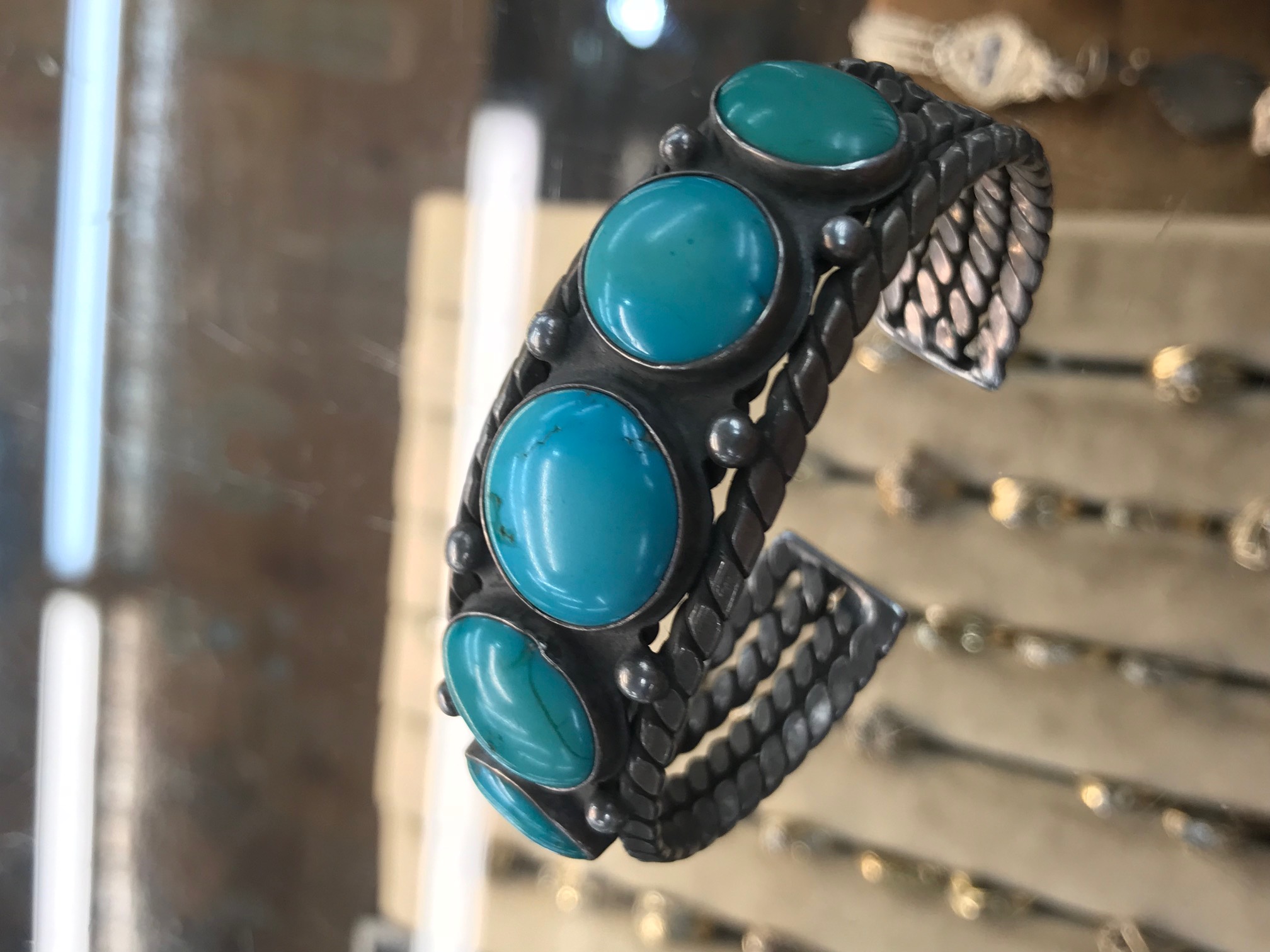 I’ve come across this lovely old cuff (circa 1930-40’s) but can’t tell in the photo whether the black on the sides of the stones (particularly 2nd and 4th stone) are part of the turquoise matrix or some epoxy filler/backing. Any opinions? What do you think is fair value for the bracelet, based on your answer.