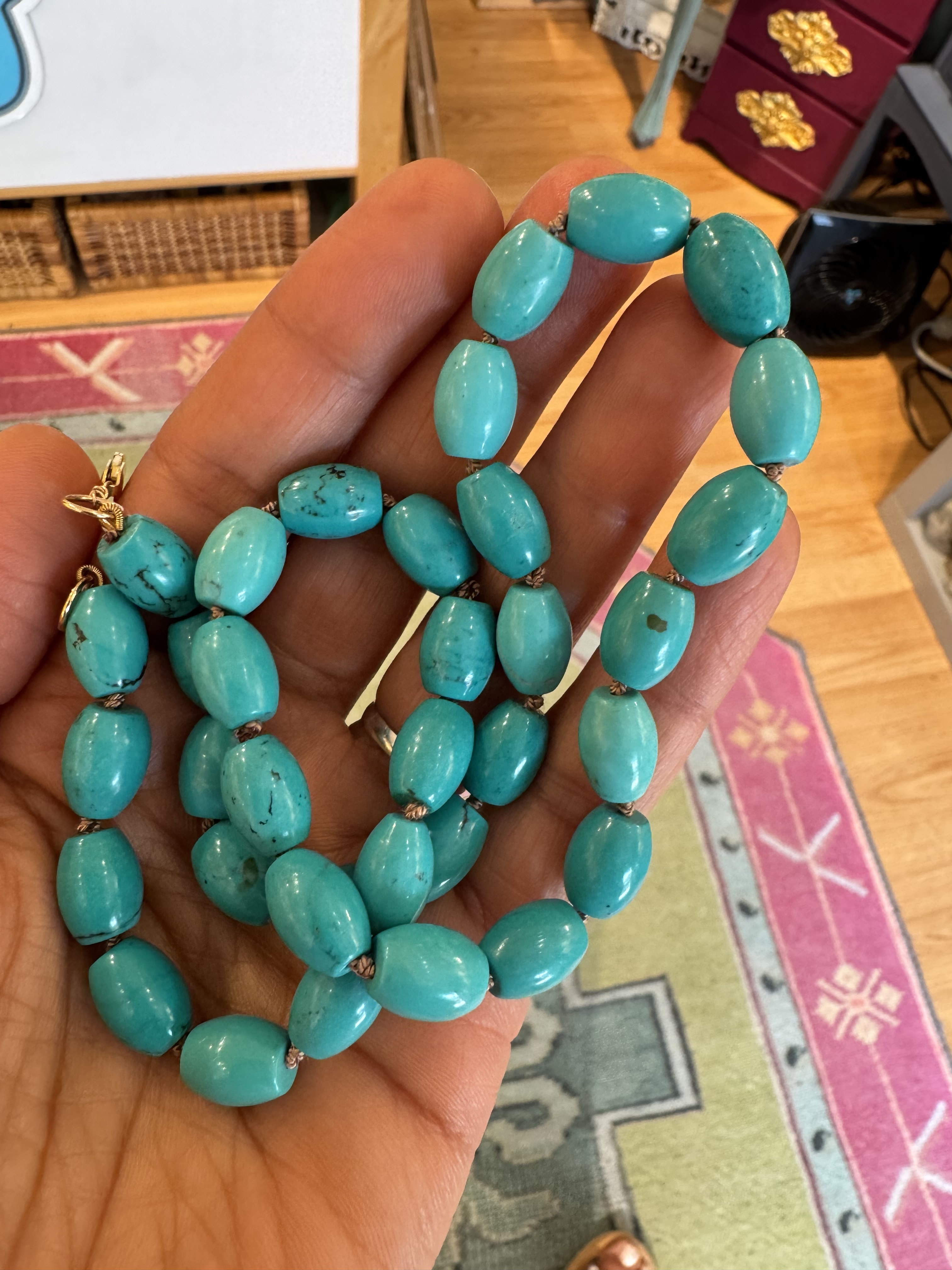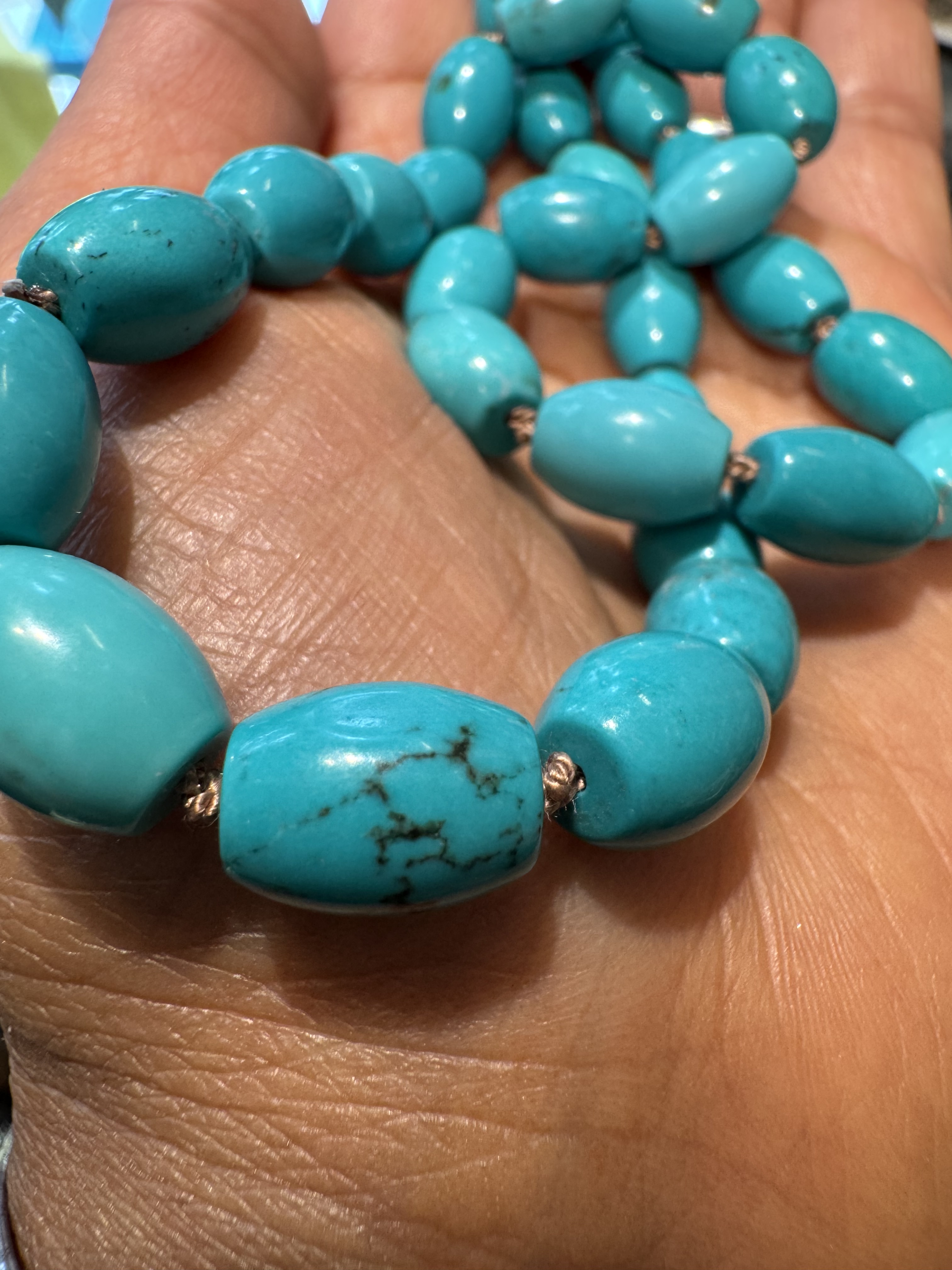 I bought this strand of turquoise from a local shop in Maryland. The seller said she bought the beads in the 90s from her trusted gem supplier, she can’t remember the source but thinks that it’s Chinese turquoise. Personally, the beads remind me of Persian turquoise, and I’m curious what your thoughts are. I’m also hoping that I didn’t buy high quality plastic beads. The color of the beads vary slightly, some beads have a thin black vein.