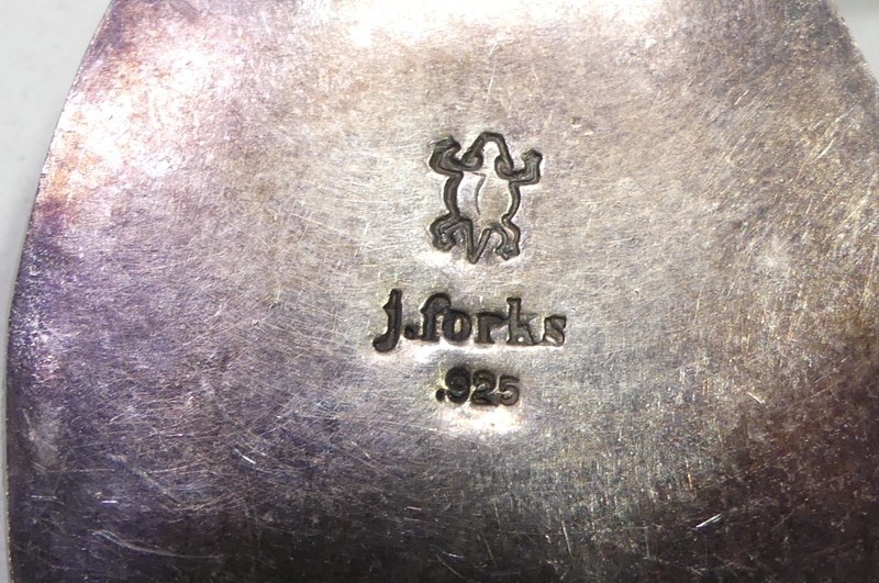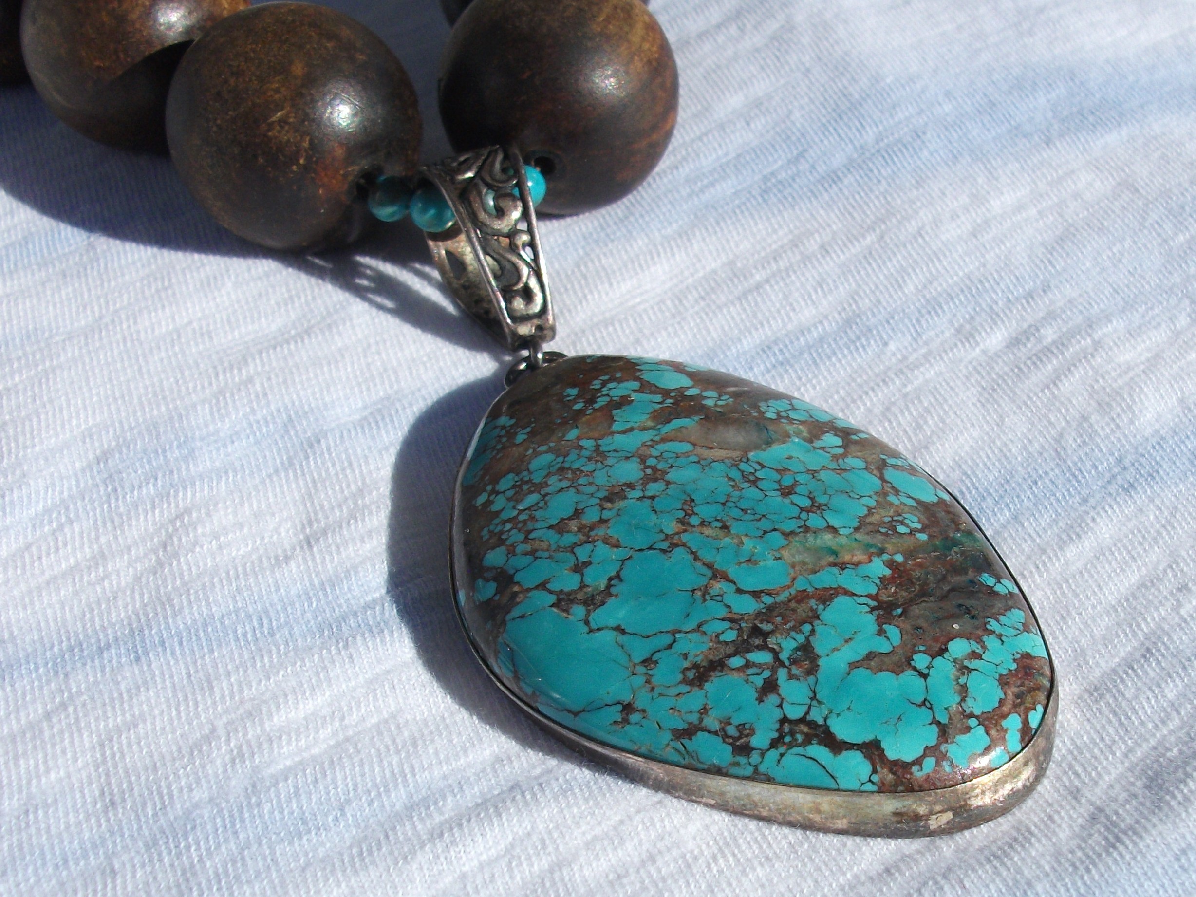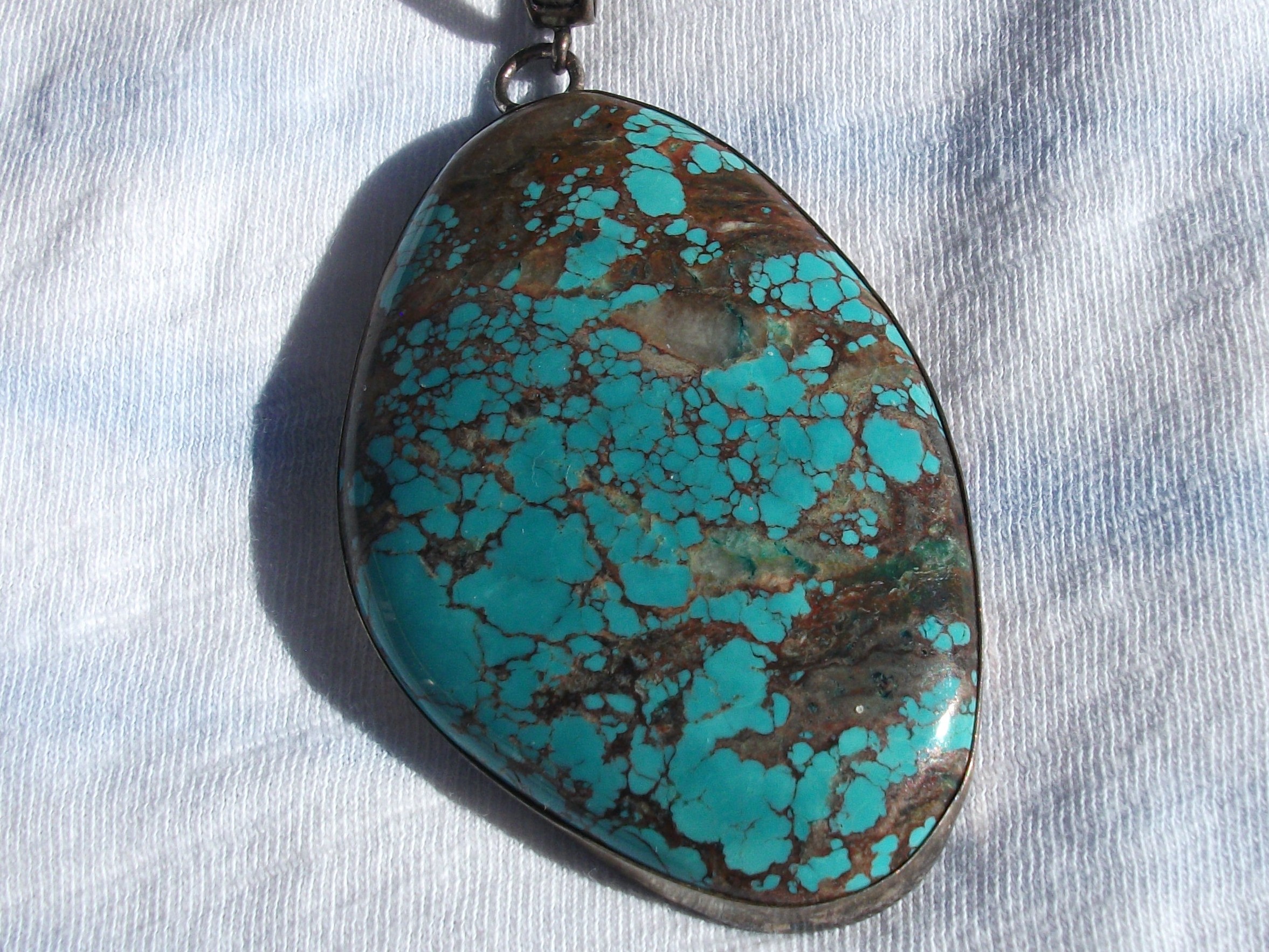 Necklace weighs 200.5 grams- pendant measures 2.5" x little over 1.5" made by J.Forks Designs established in 1999 located in Boerne, Texas. Their website says their necklaces often feature North American turquoise. The turquoise, as well as the brown matrix areas, passed the hot needle test. Having not heard back from their customer service department in regard to what stone this may be, thought I’d ask for your thoughts. Thanks.