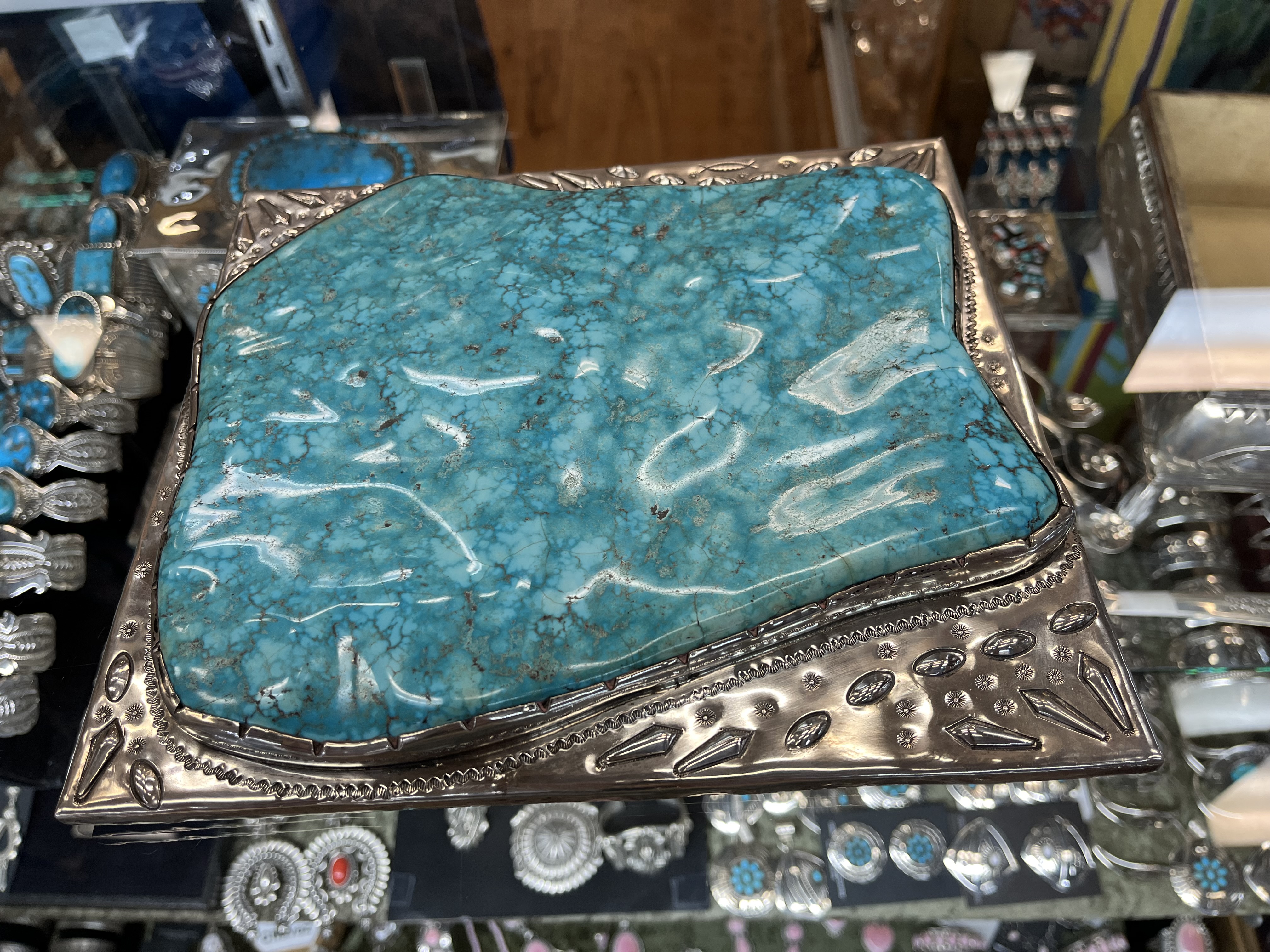 Good point @Stracci…I’d love to have this box! And I agree with @Ziacat, the huge Morenci stone is not my favorite… but you never see spectacular stones (ie, the spiderweb we all love, or other higher end turquoise) this size. So, I’m assuming she used what was available.