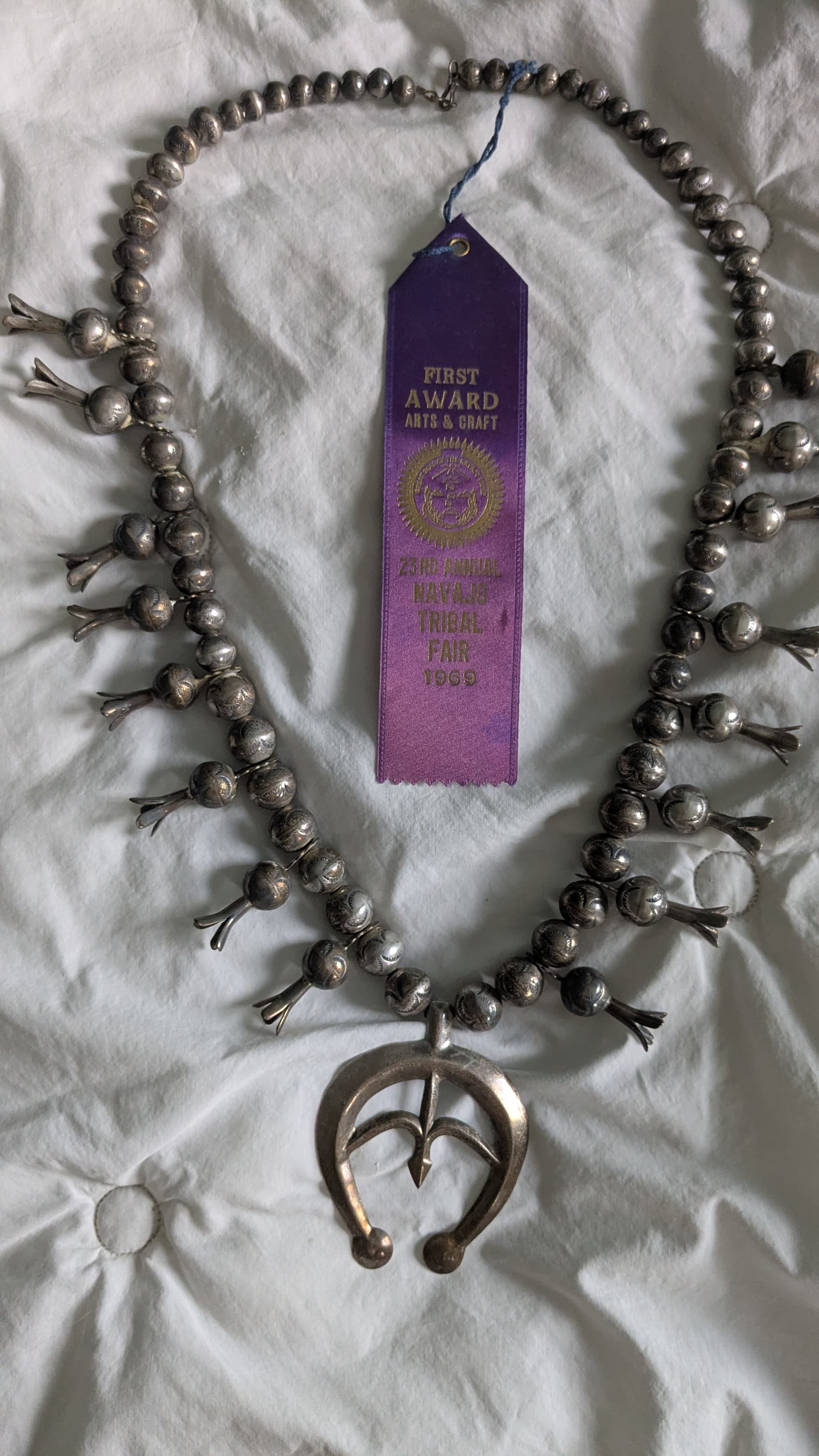 That’s a beautiful all silver squash blossom and it’s an added bonus that you have provenance and a ribbon to go with it. Most of us here don’t feel very comfortable giving value opinions but I can give you some recommendations for appraisers if you are interested.