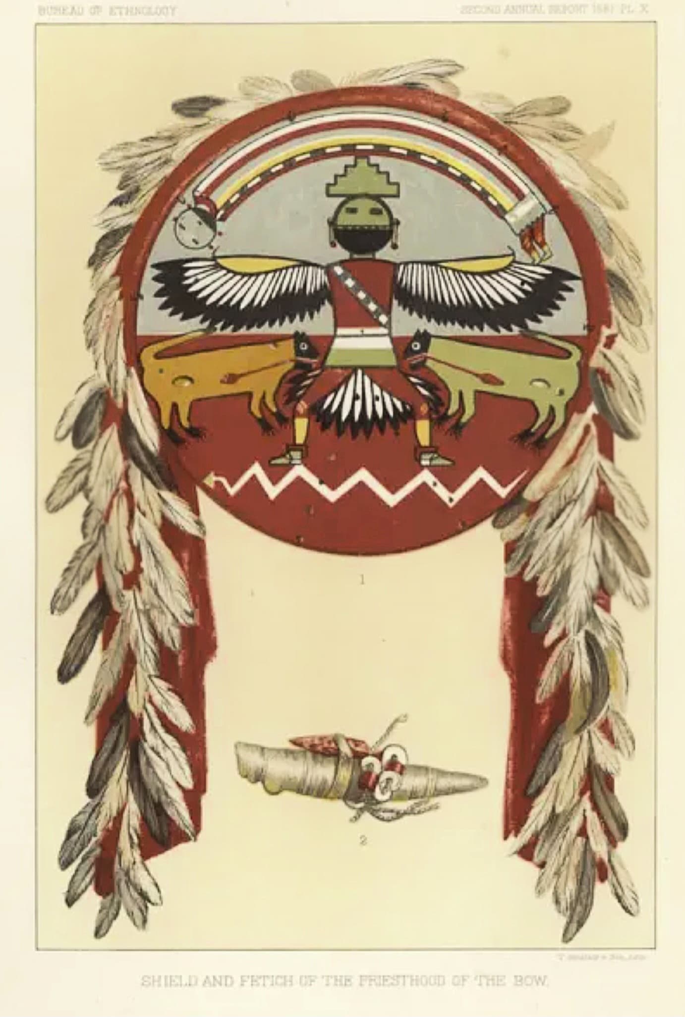 Shield of the Priesthood of the Bow. The composite of bird, snake, and man on this Zuñi shield embodies imagery from all three worlds. Drawing by Frank Hamilton Cushing, c. 1880.