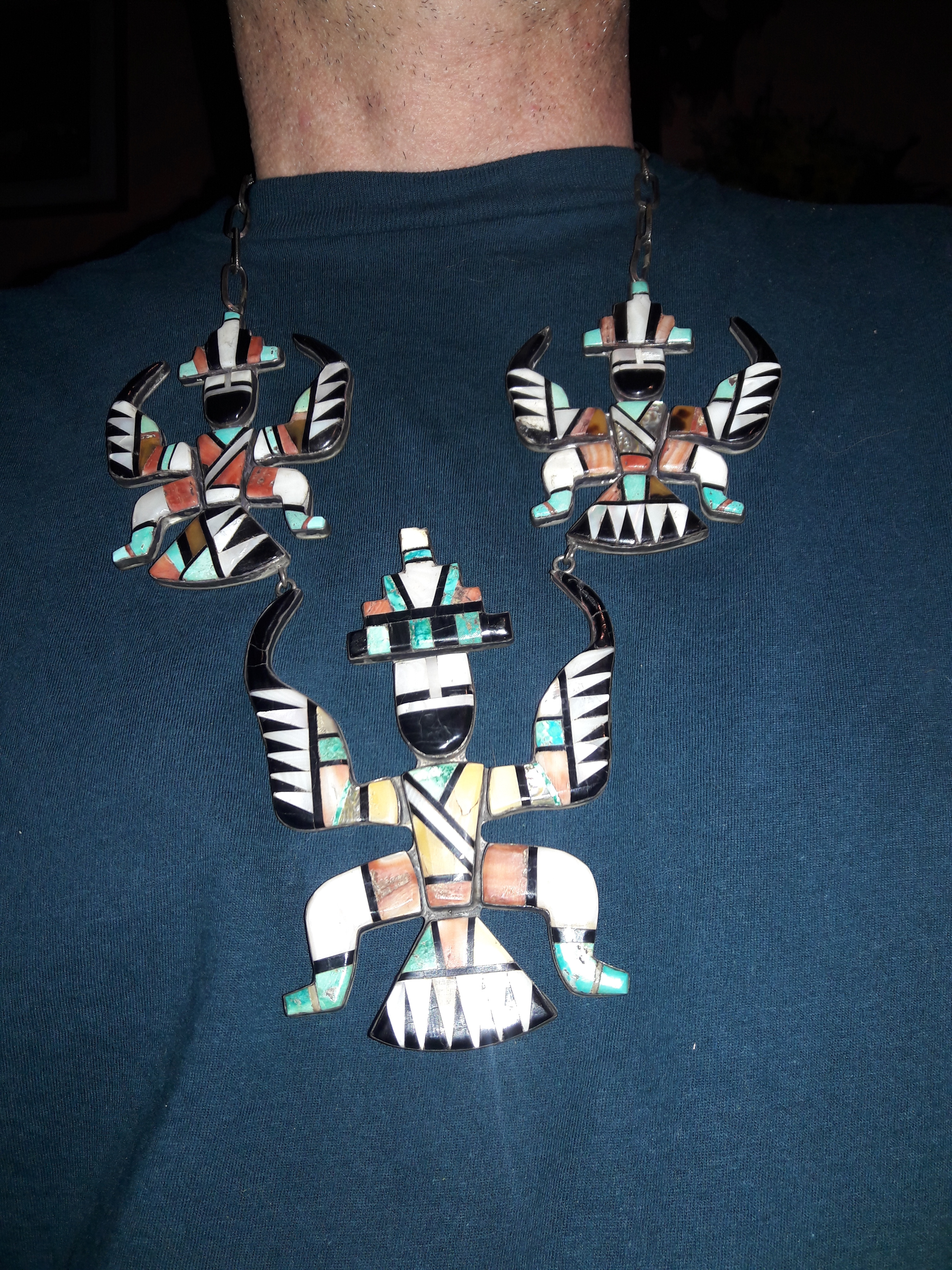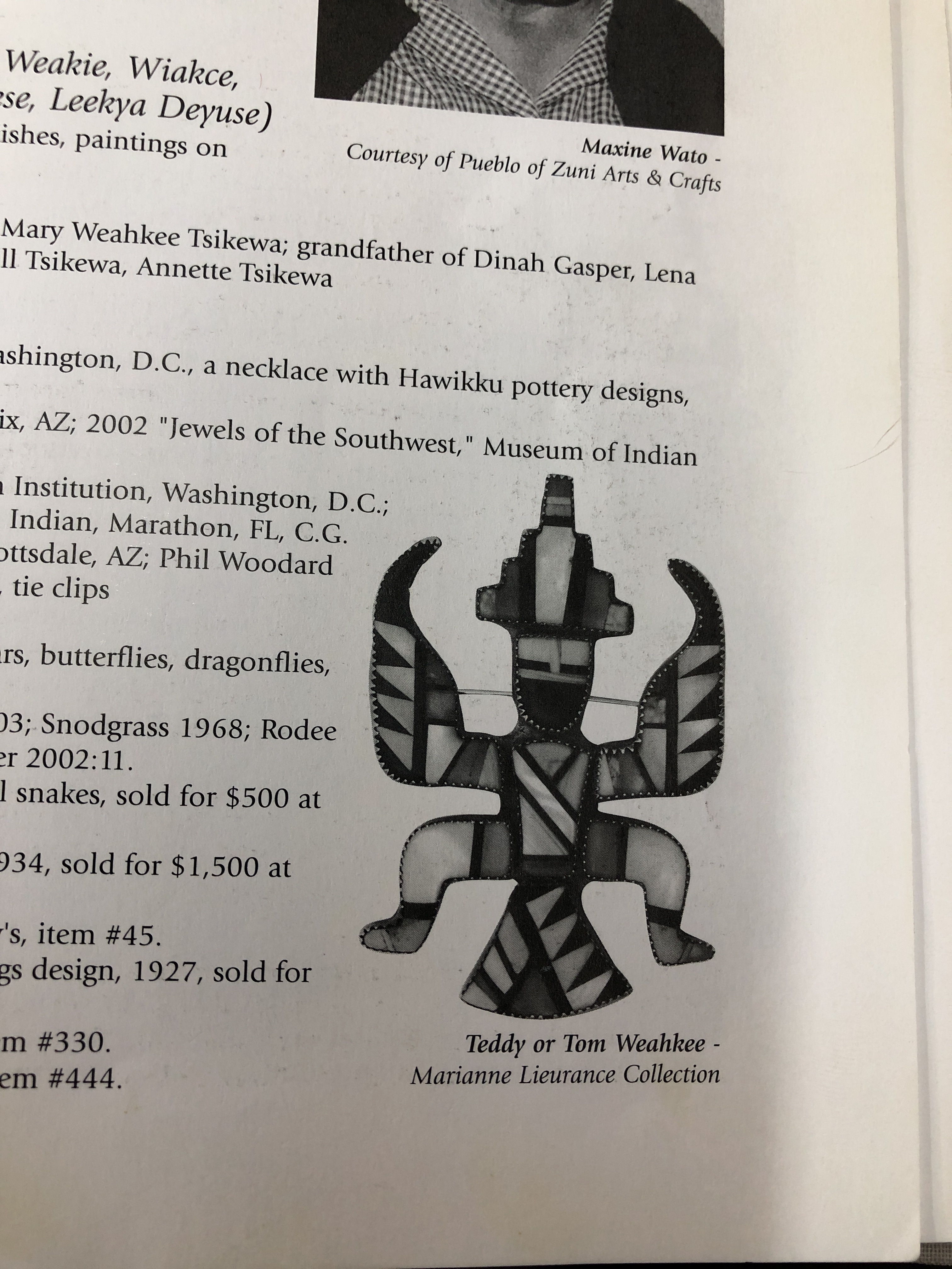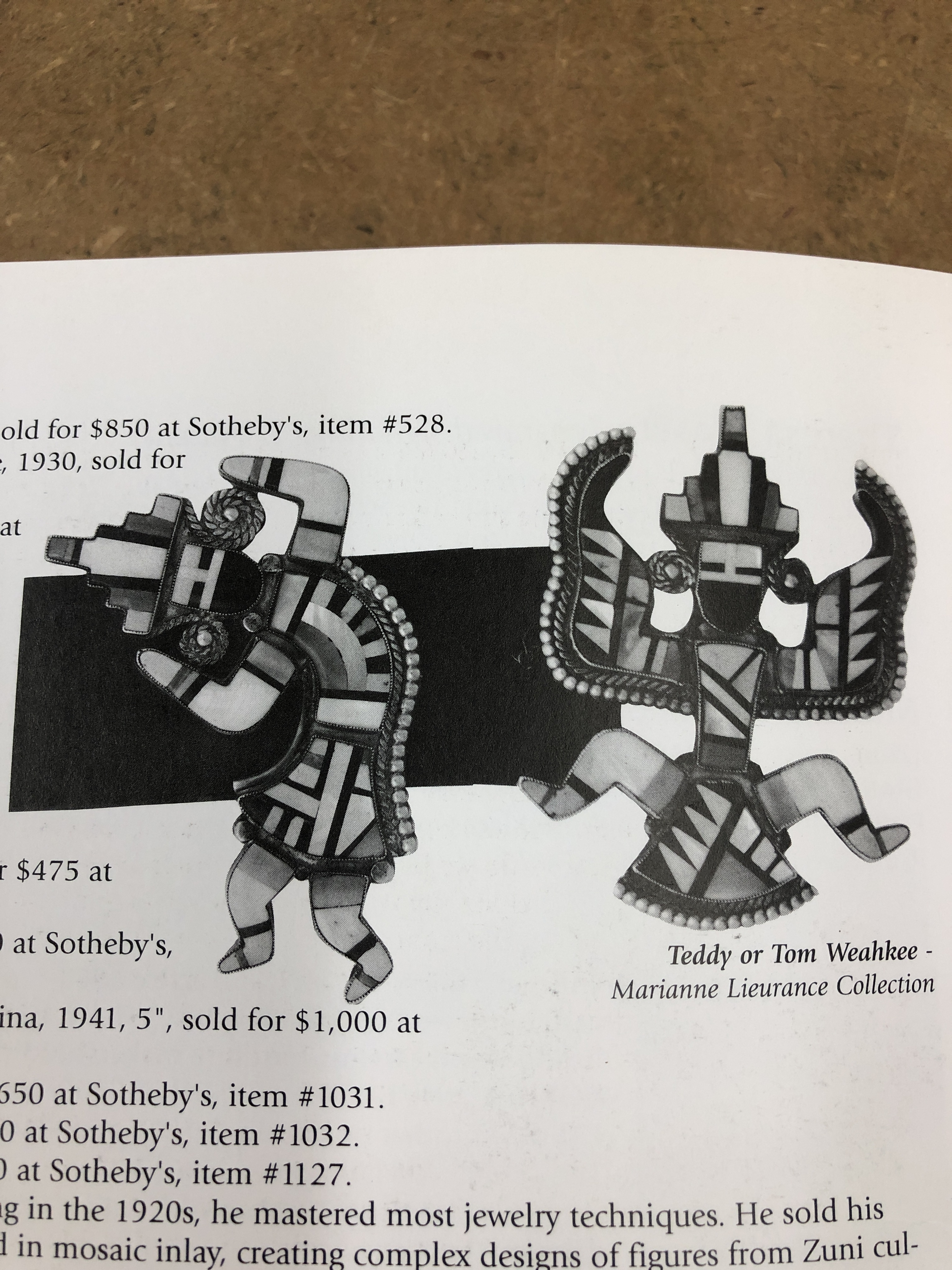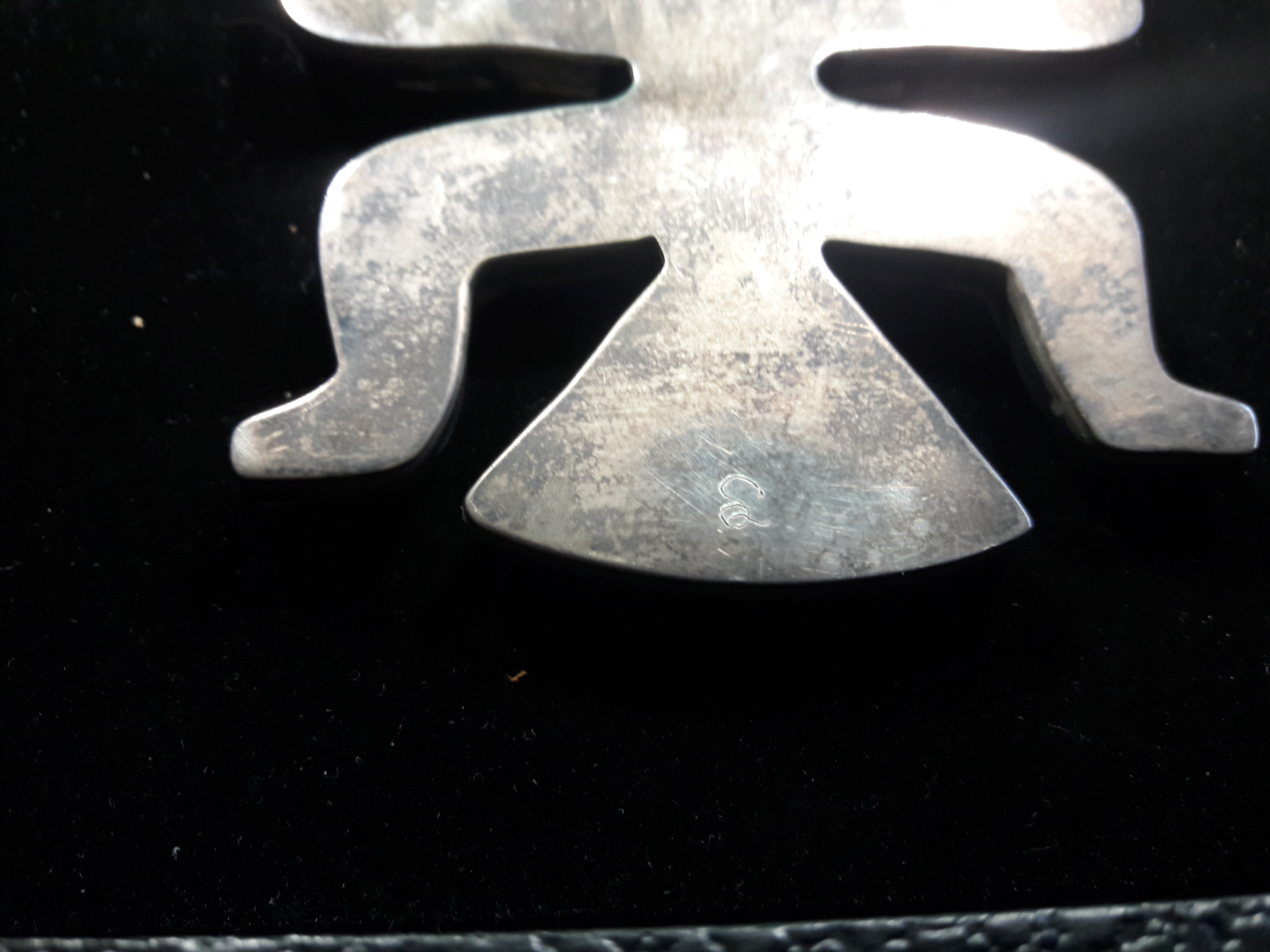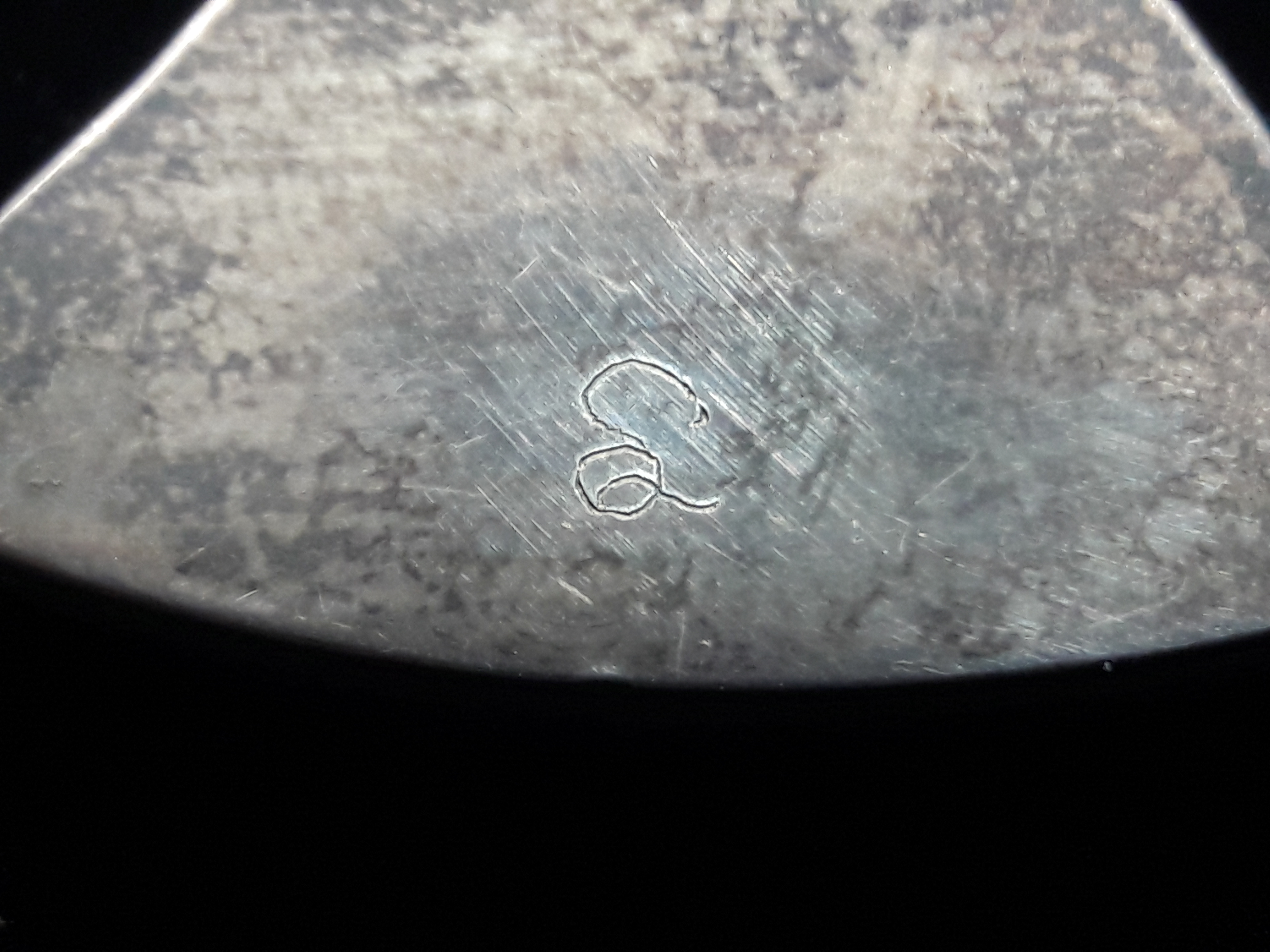 This is the third piece of the three that I bought recently from a coin dealer. I am looking for confirmation that this is the work of Teddy Weahkee. It was not sold as such and I almost didn’t buy it due to some slight damage on it. However, now that I have it and have been able to compare it to others it’s showing a strong resemblance to Teddy Weahkee’s work or at least to work that’s been attributed to him. There seems to be a hallmark but I’ve never seen it and don’t find it in any of the books I have. It looks to me like it could even be a coiled snake. The abrasions to the patina over the hallmark are from me rubbing my thumb over it…oops!