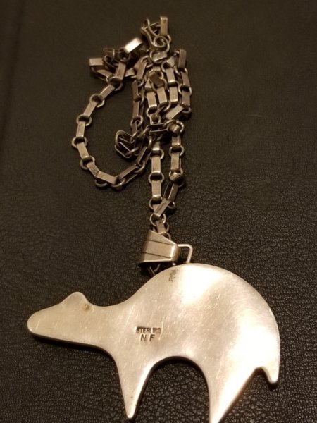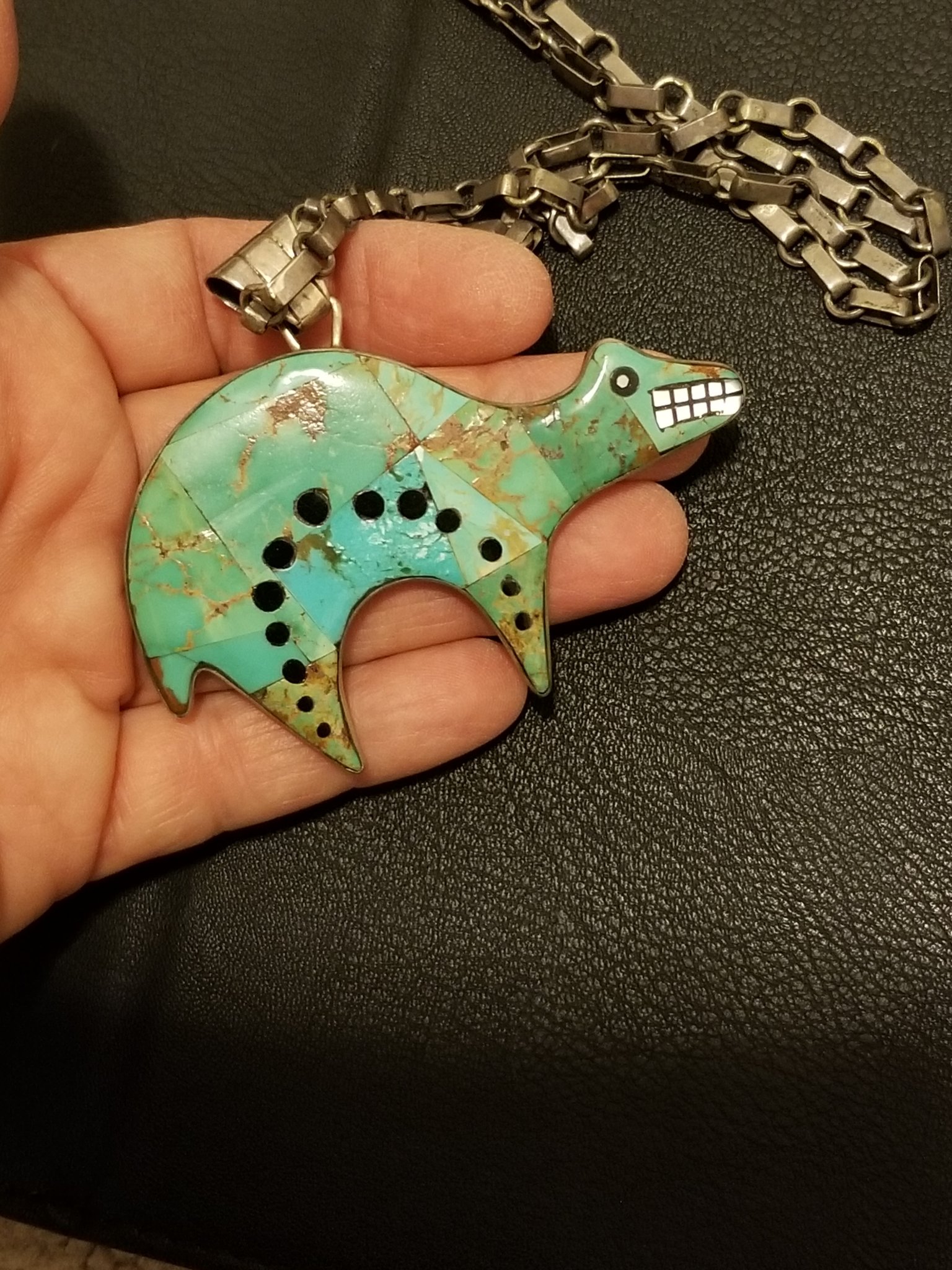 This is a really popular style. https://www.google.com/search?q=turquoise+inlay+navajo+bear+pendant&source=lnms&tbm=isch&sa=X&ved=0ahUKEwi3k4G77PfdAhXBITQIHeNmAgQQ_AUIDygC&biw=1680&bih=884#imgrc=sGQq6dV2deM7GM: Many times this is made in a manufacturing setting, where one artist constructs the silver and another does the inlay. Your piece is very nicely done and seems to have some age? It is a very similar to the shape that Alvin Yellowhorse uses, https://www.google.com/search?biw=1680&bih=884&tbm=isch&sa=1&ei=ANS7W4CiM_Sq0PEPusCmqAs&q=alvin+yellowhorse+inlay+navajo+bear+pendant&oq=alvin+yellowhorse+inlay+navajo+bear+pendant&gs_l=img.3...801078.803857..804015...0.0..0.99.1582.17......1....1..gws-wiz-img.hc3DwWvV_48. Maybe this is one of his students.
