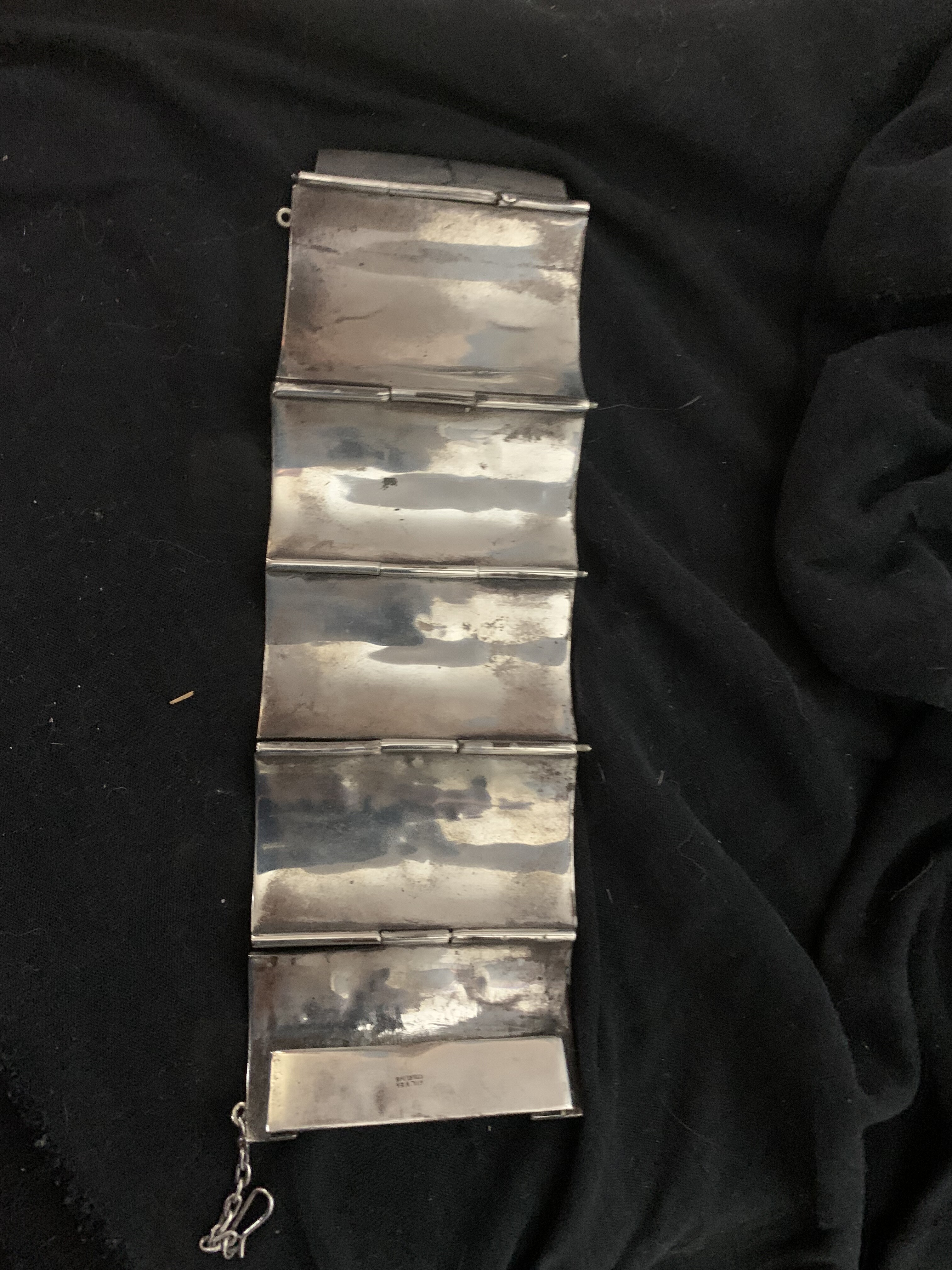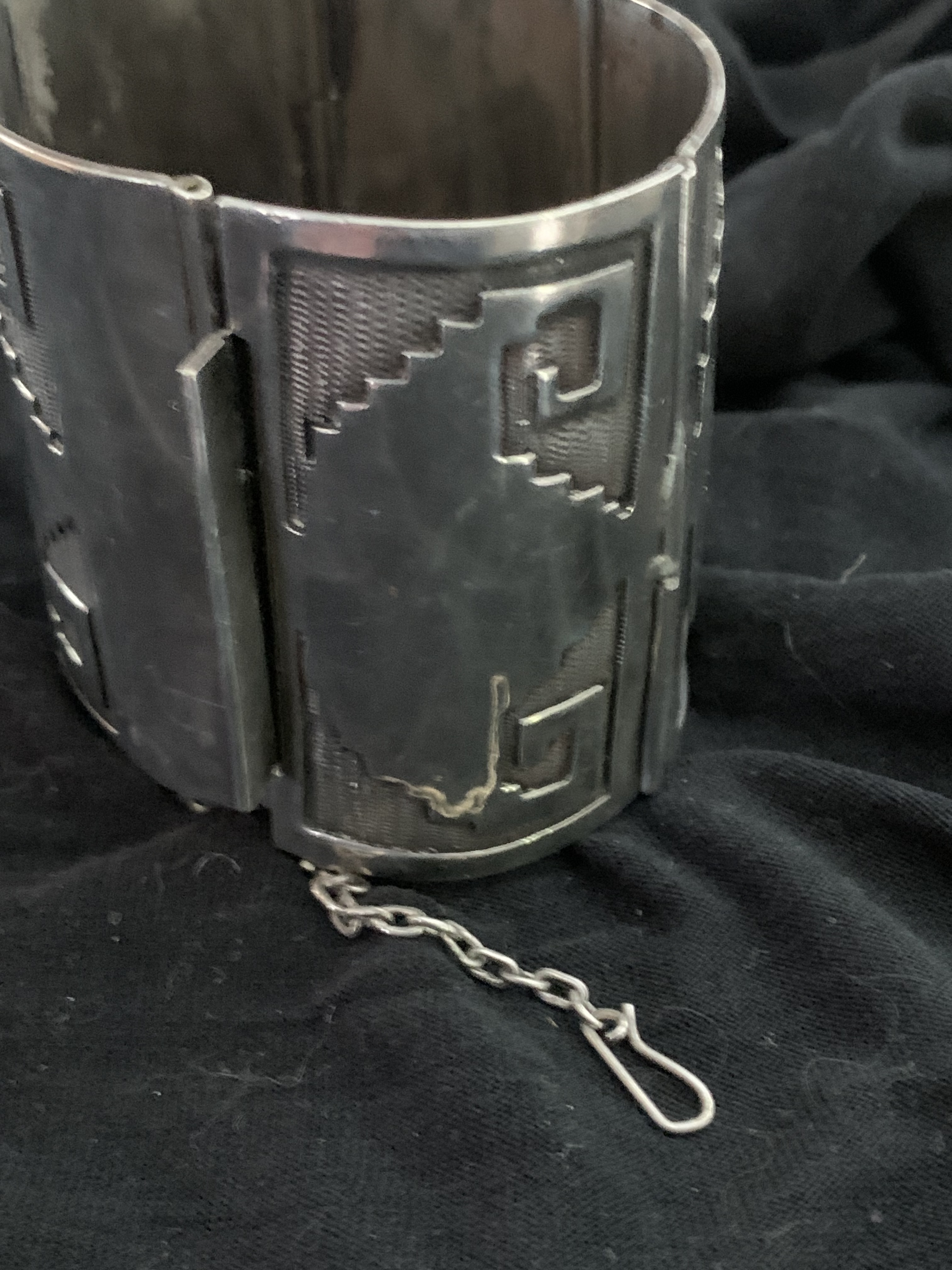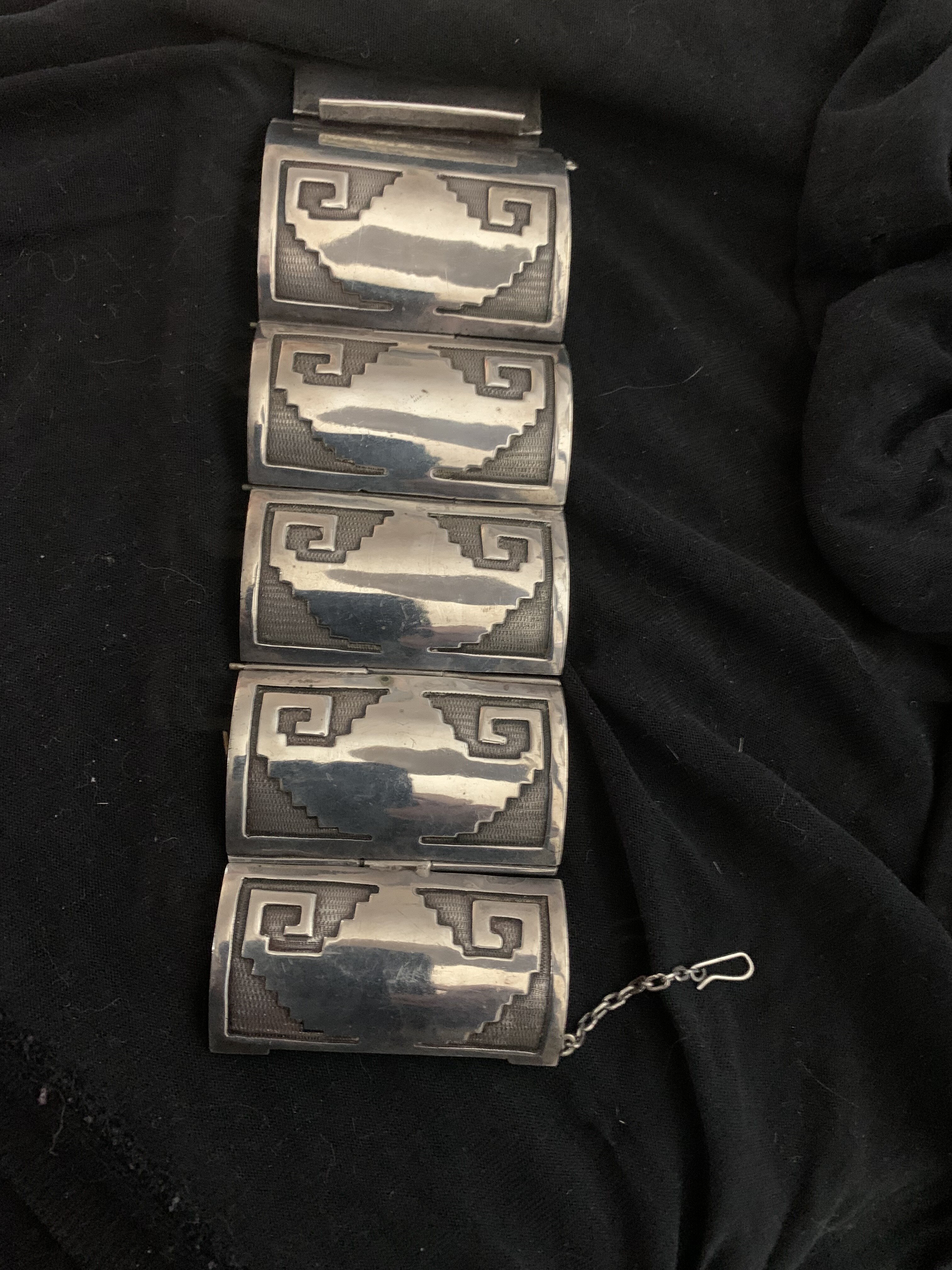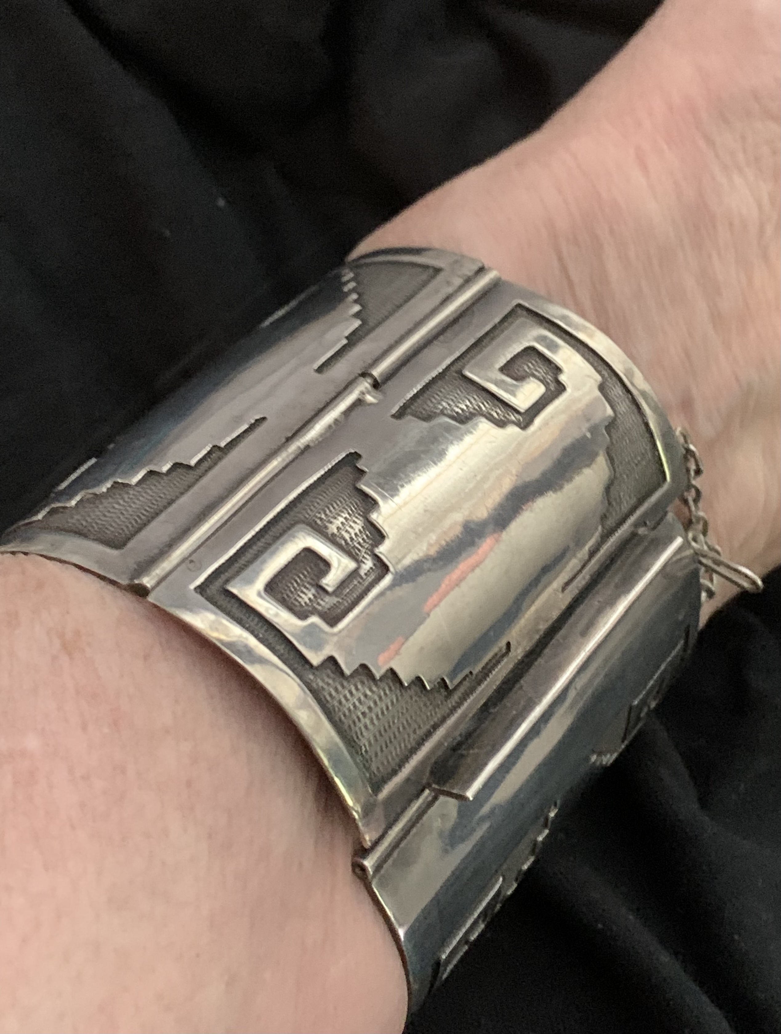 I’m in love! And it fits my large 7-1/2” wrist! Marked simply “SILVER STERLING”, and is very heavy. Truly Hopi overlay? Or Navajo in Hopi style? Just hoping you have some insight. It’s quite a statement piece -