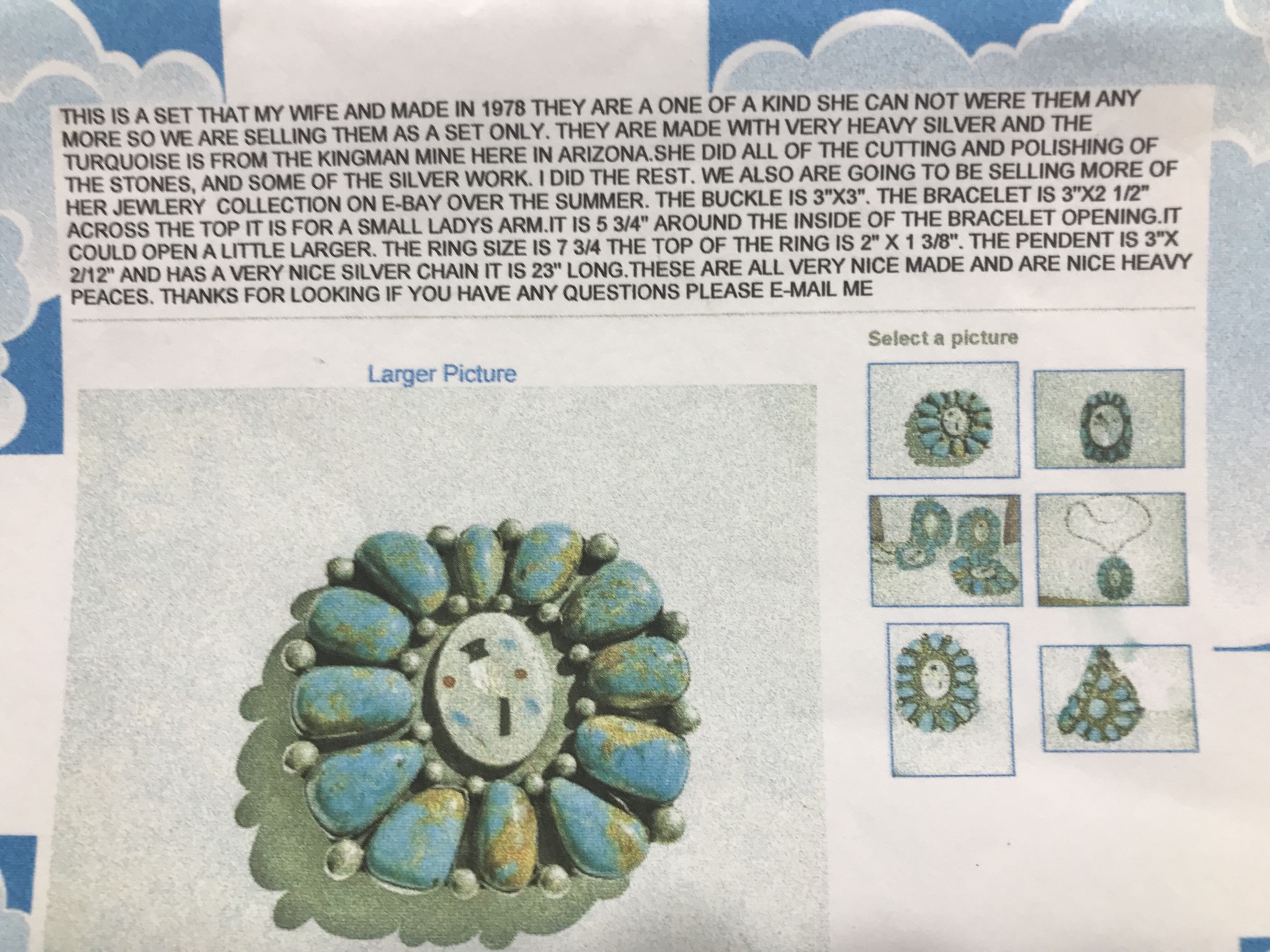 Hi @Jason , I bought this set in 2008 on eBay from that elderly couple in Arizona (he was 75 then) that made turquoise jewelry from the Kingman mine. I didn’t know them personally. They made this set in 1978. I posted their eBay add with my pics. I ended it early with Buy It Now for $250. I believed it was worth much more than that back then but I really don’t know. I’ve never had anyone look at it or the other pieces I bought from them. I just think they are beautiful! it’s my birthstone. I wish I owned a lot more!