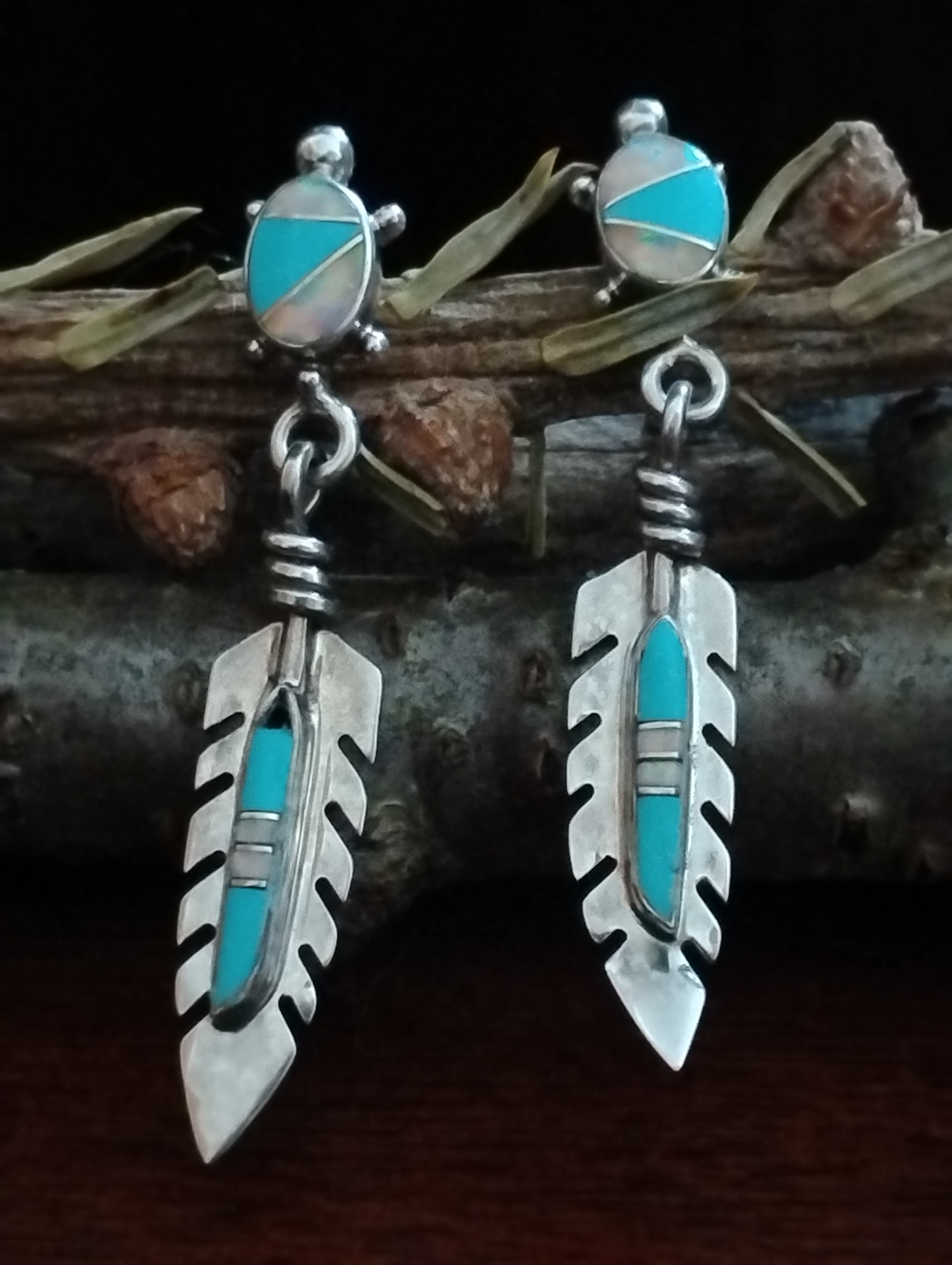 I’ve found similar earrings, but the stone details, with silver between - is all quite distinct from the turtle+feather work I’ve been able to find online.
