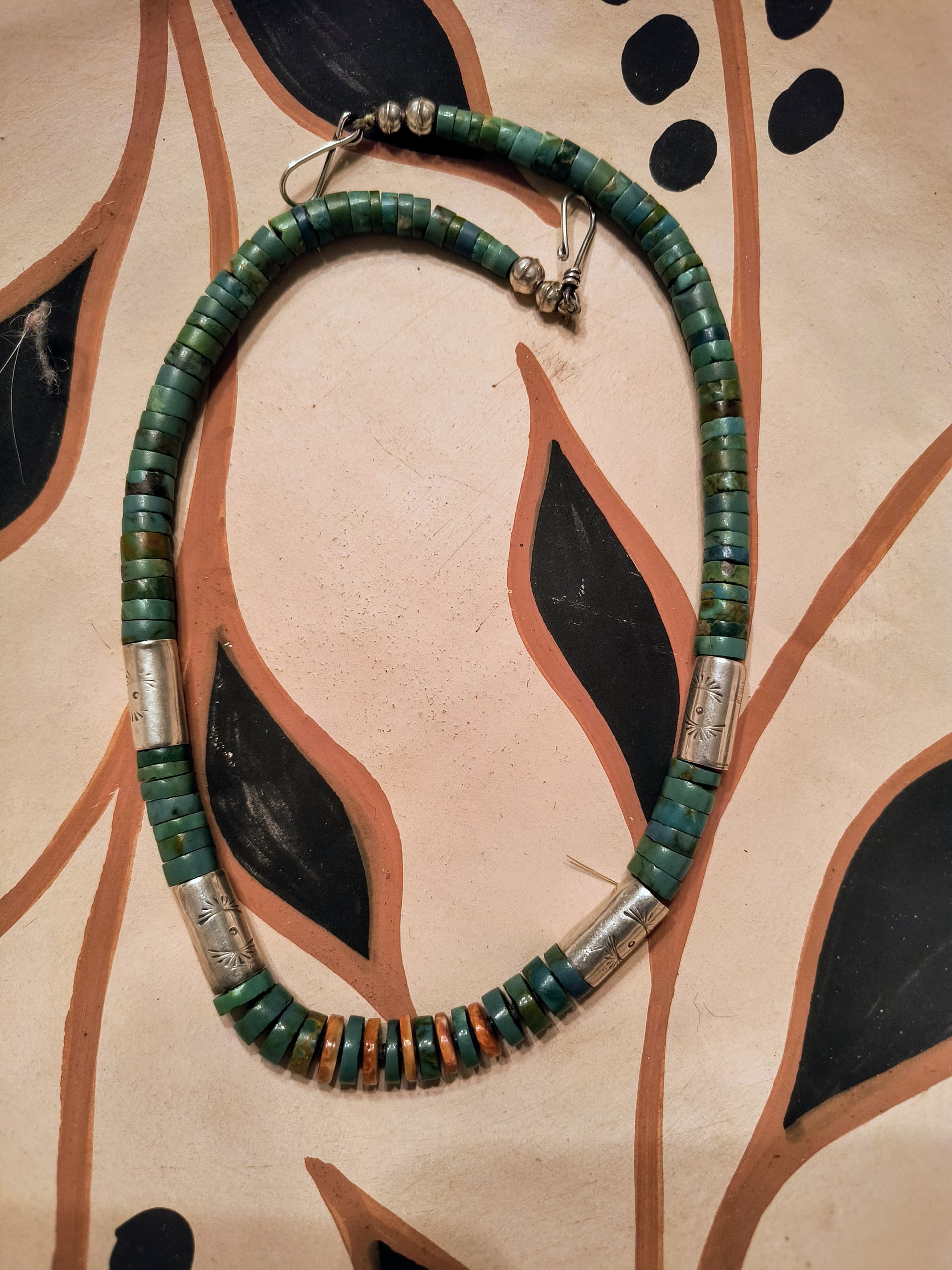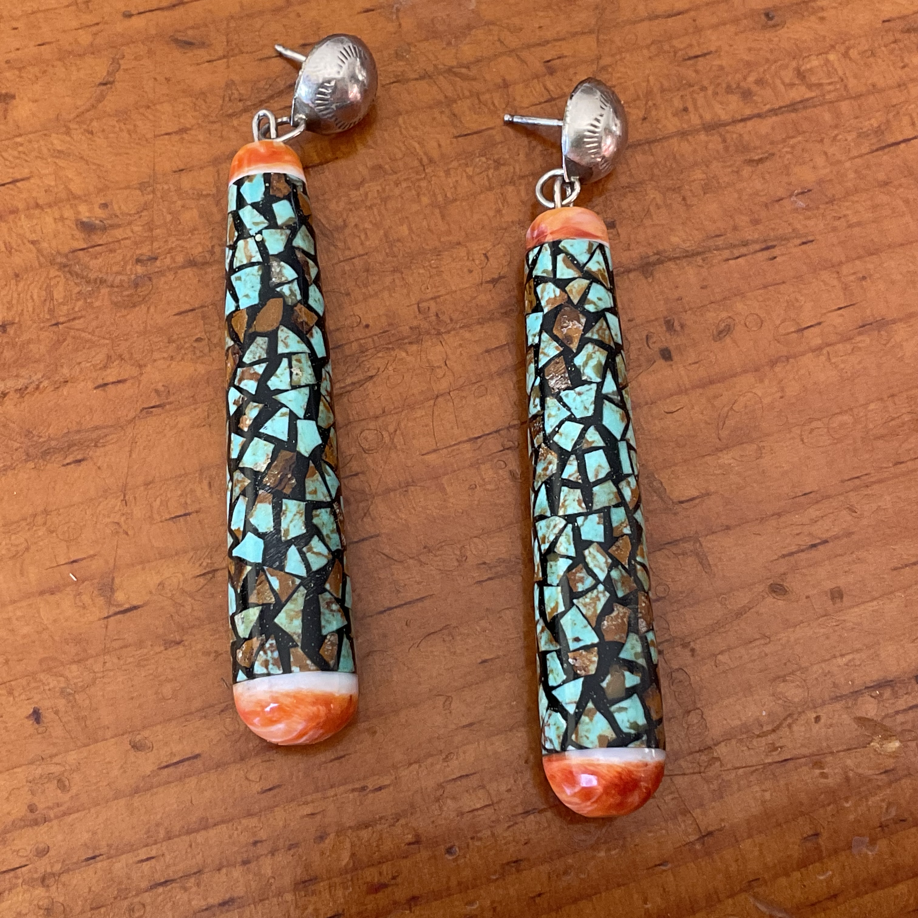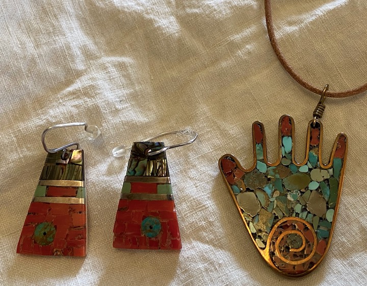 My treasured Mary Lovato items. I’ve had the earrings a long time, while the pendant is from 2020. Red coral, abalone, and turquoise.