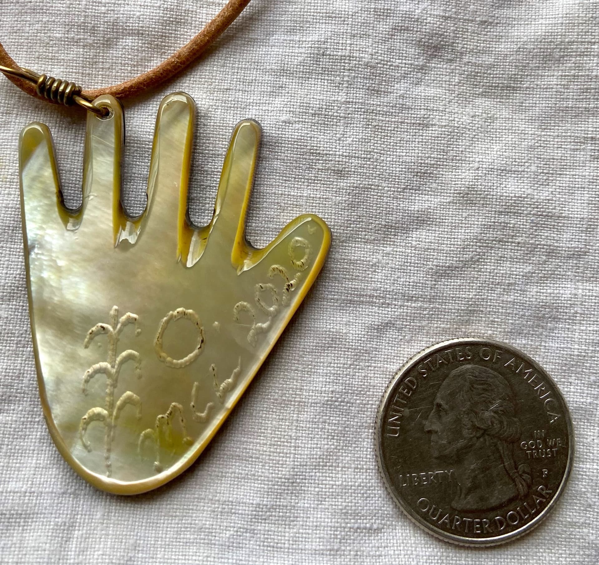 The hand is one of her key images, as many people know. As you see, it’s drilled to hang asymmetrically, and mine has the unusual feature of being set in brass instead of sterling, which I just love about it. The metal color imparts a special touch.