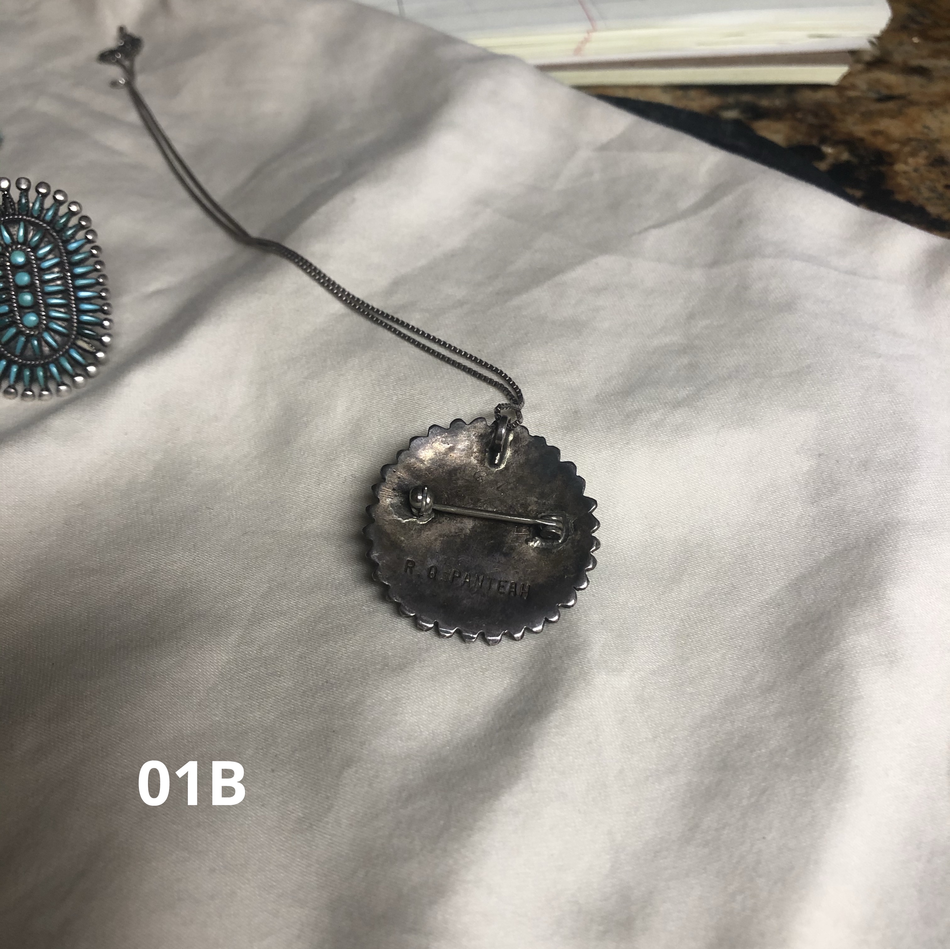 You have some really nice pieces there. The pin/pendant is marked R. Q. Panteah for Rosemary and Quincy Panteah, a Zuni couple that were active in the 70’s and 80’s. Quincy was governer of Zuni pueblo from 1982-83. I think he actually passed away around 1983 so your pendant would be no more recent than that.
