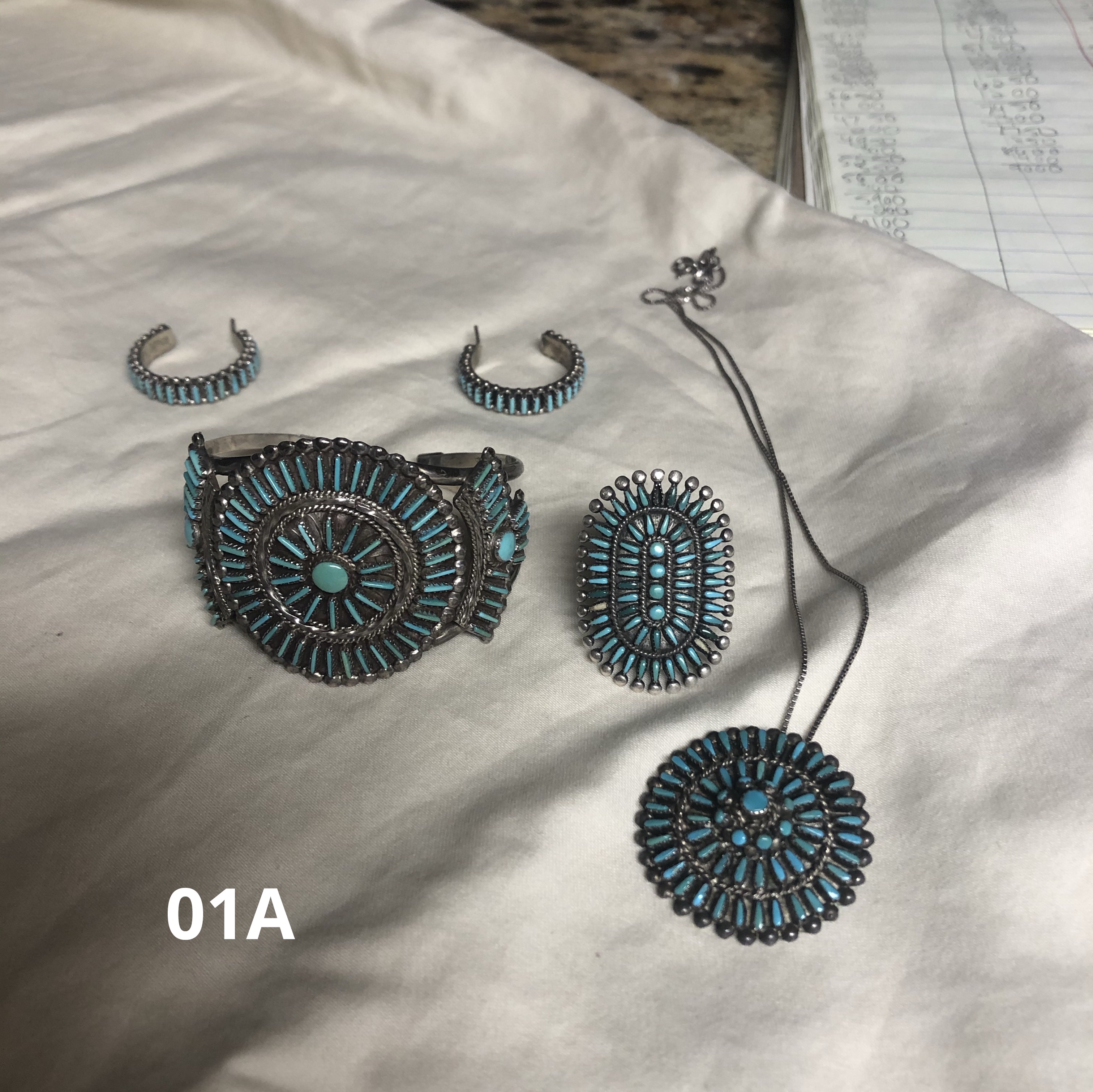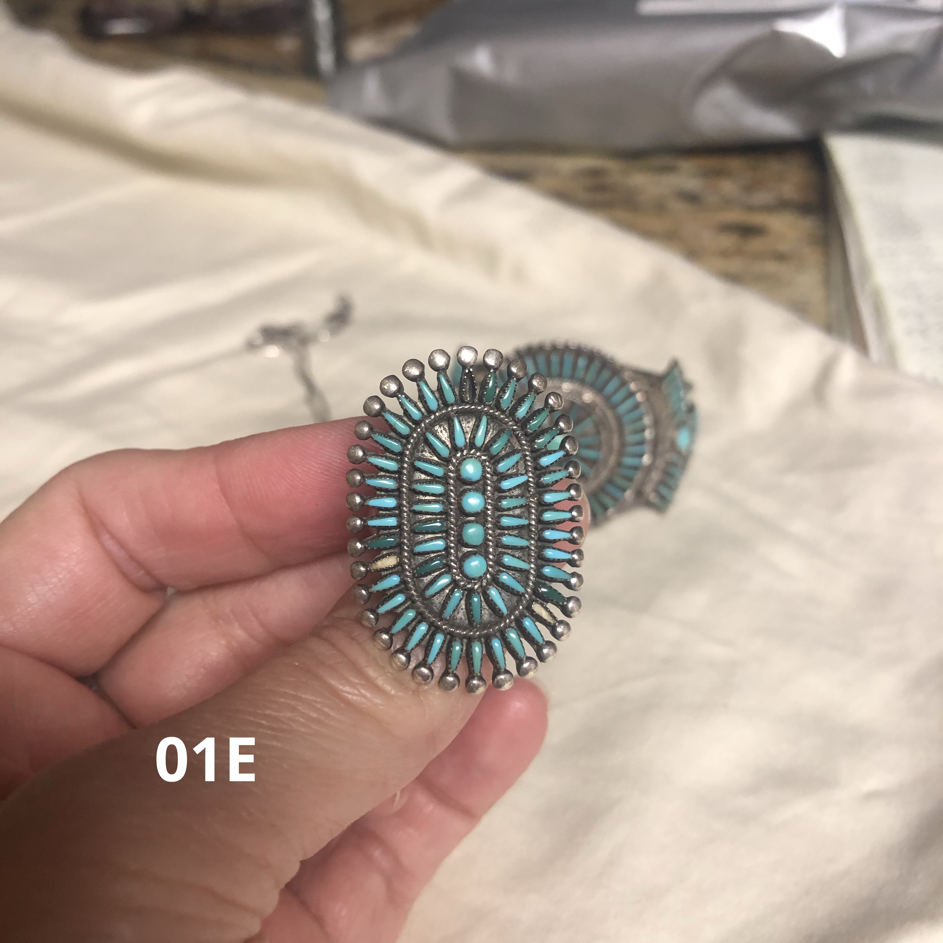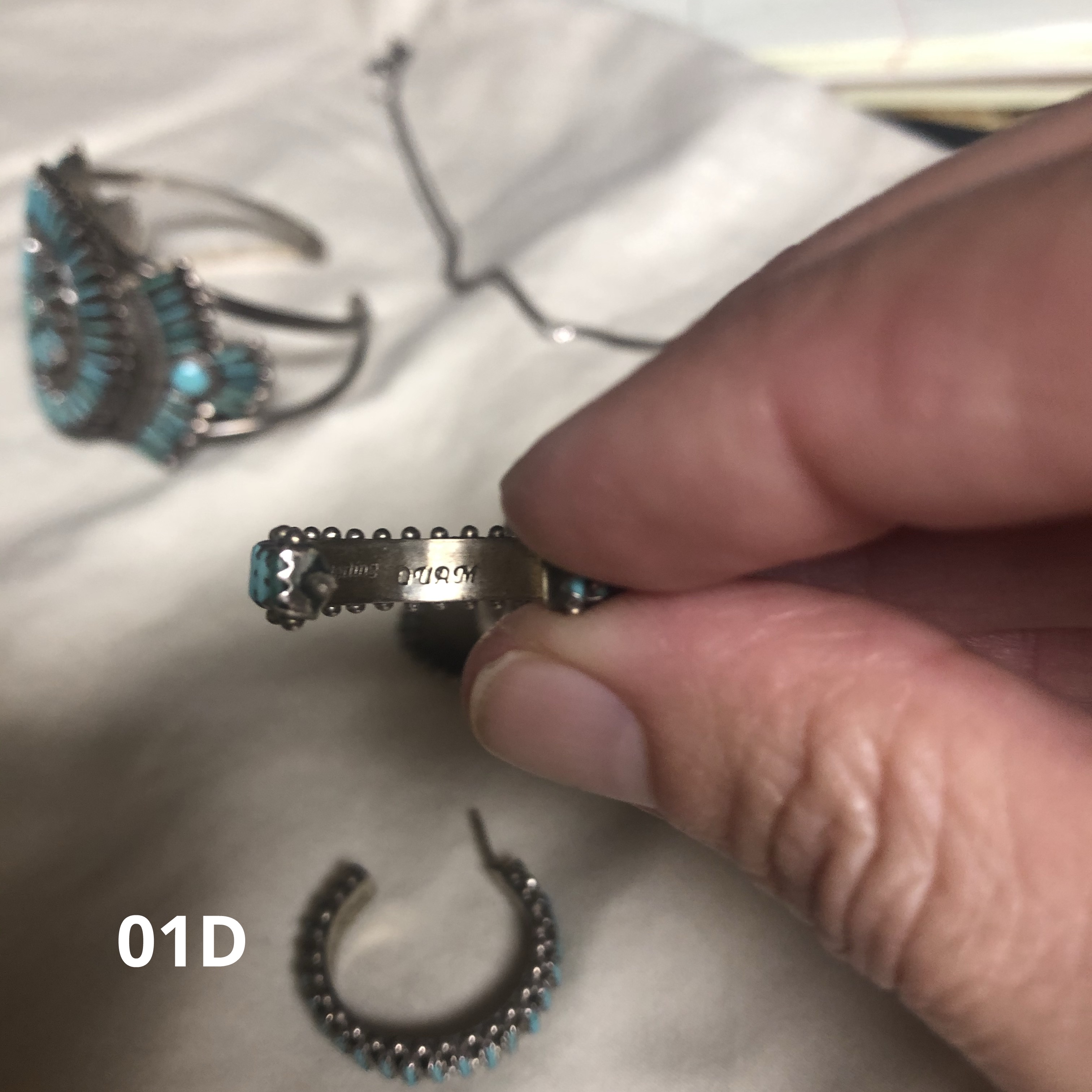 No expert here, just an observer. YOu have some treasures here! the needlepoint hoop earring looks like QUAM, which is a Zuni family name. I think there are a number of makers, I’m sure someone will come along to help figure out which of them made your pieces. they are gorgeous! The missing stones can be replaced.
