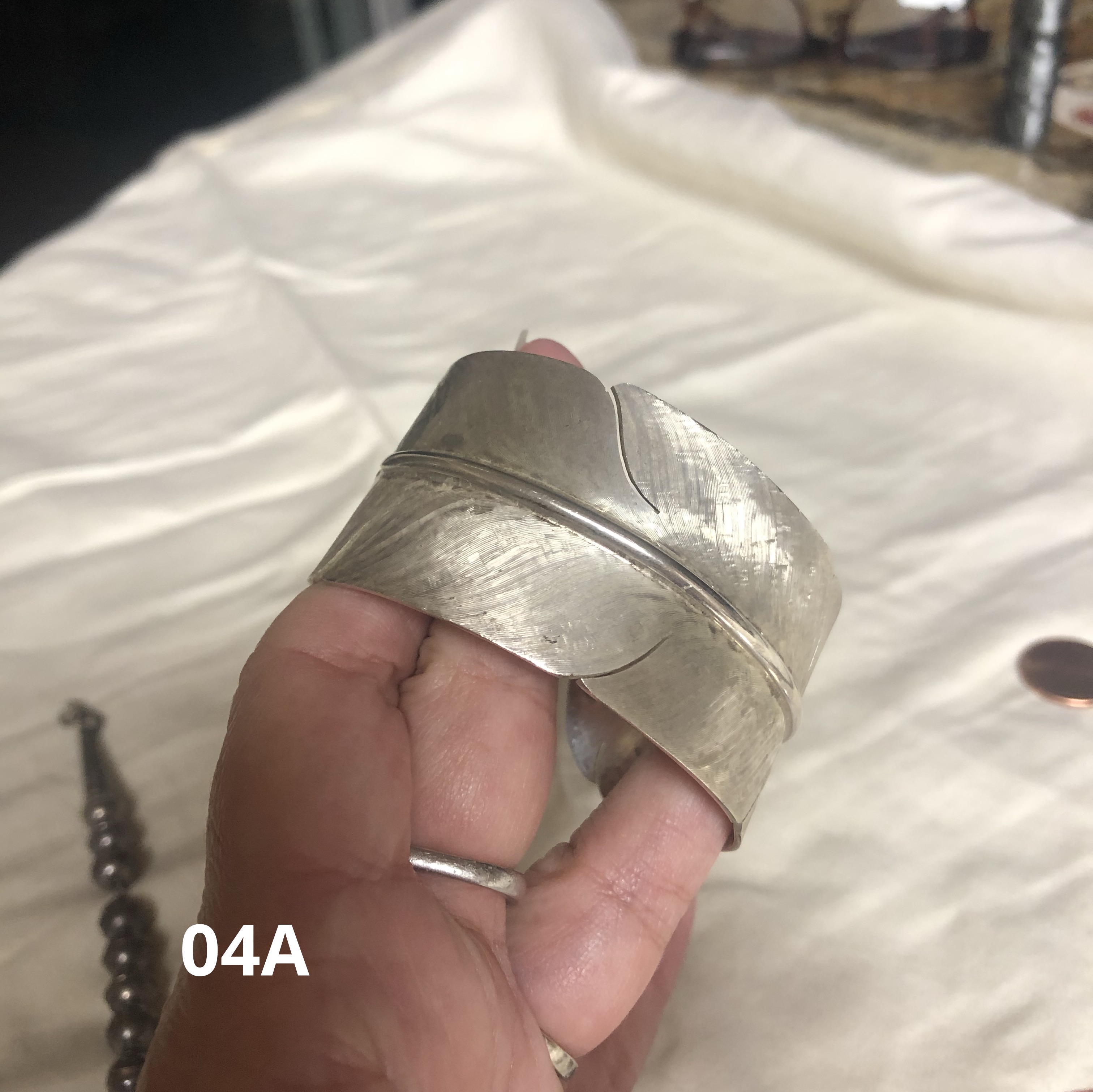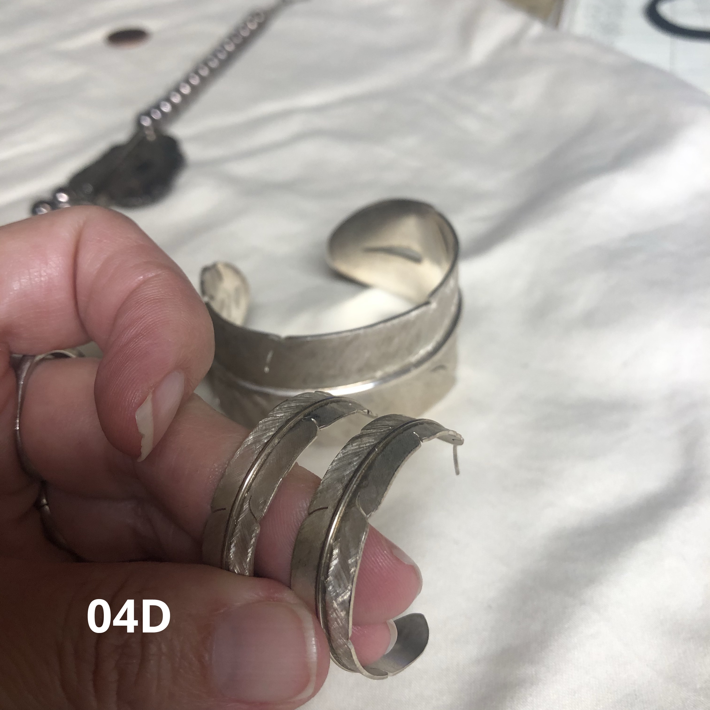 The bear turquoise bracelet she thinks she bought on a trip to New Mexico. The feather cuff she said she bought from a vendor at USET many years ago. She swears she didn’t buy the matching earrings with the feather cuff bracelet so if that’s true, it’s quite fortunate that she found the feather cuff earrings elsewhere.