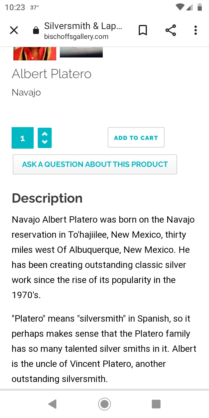 This is the first piece of signed NA jewelry I ever bought…pendant on silver wire by Art Platero. Bought in the early 70’s. Could anyone tell me about Art and give me a value on it?