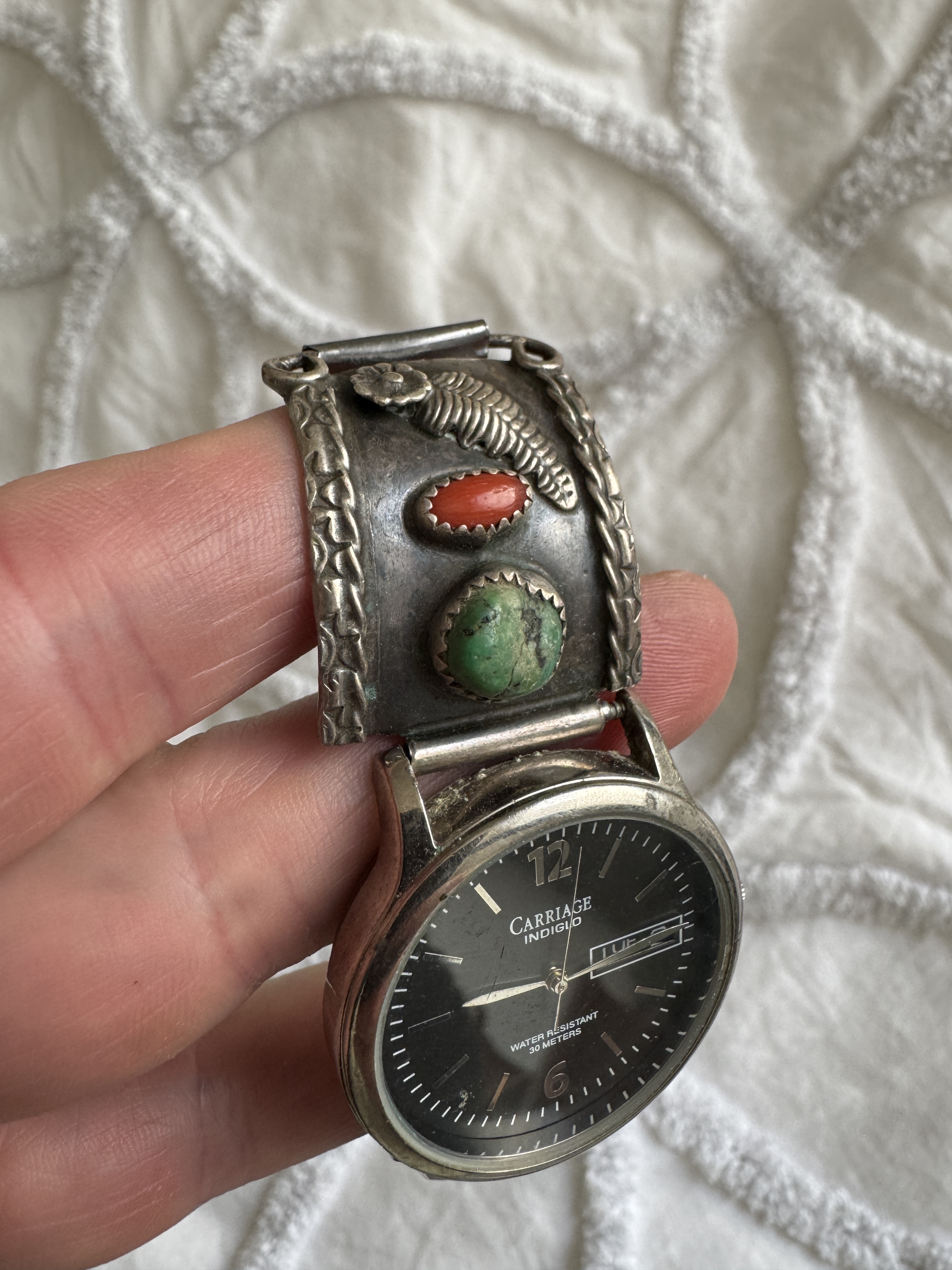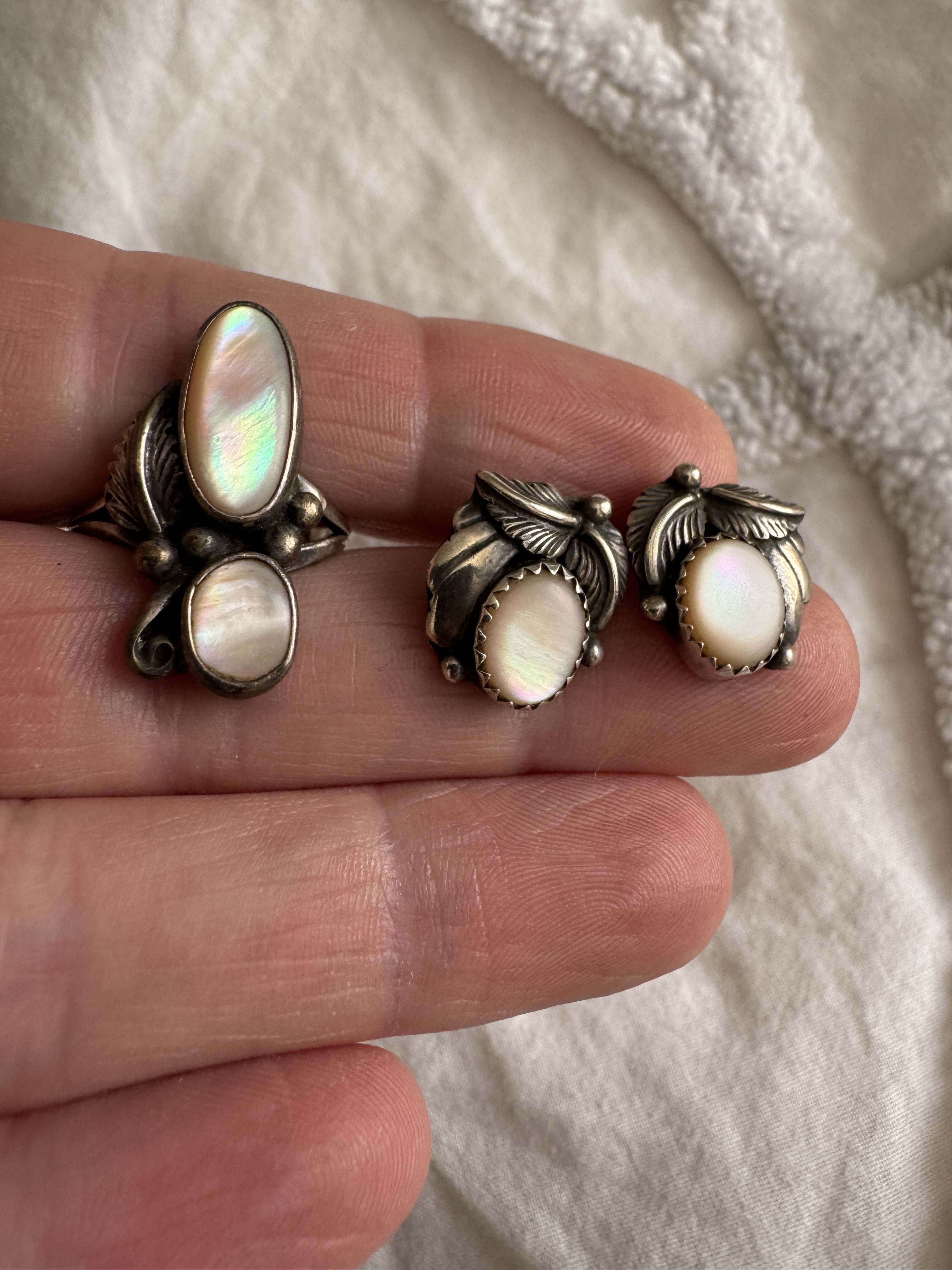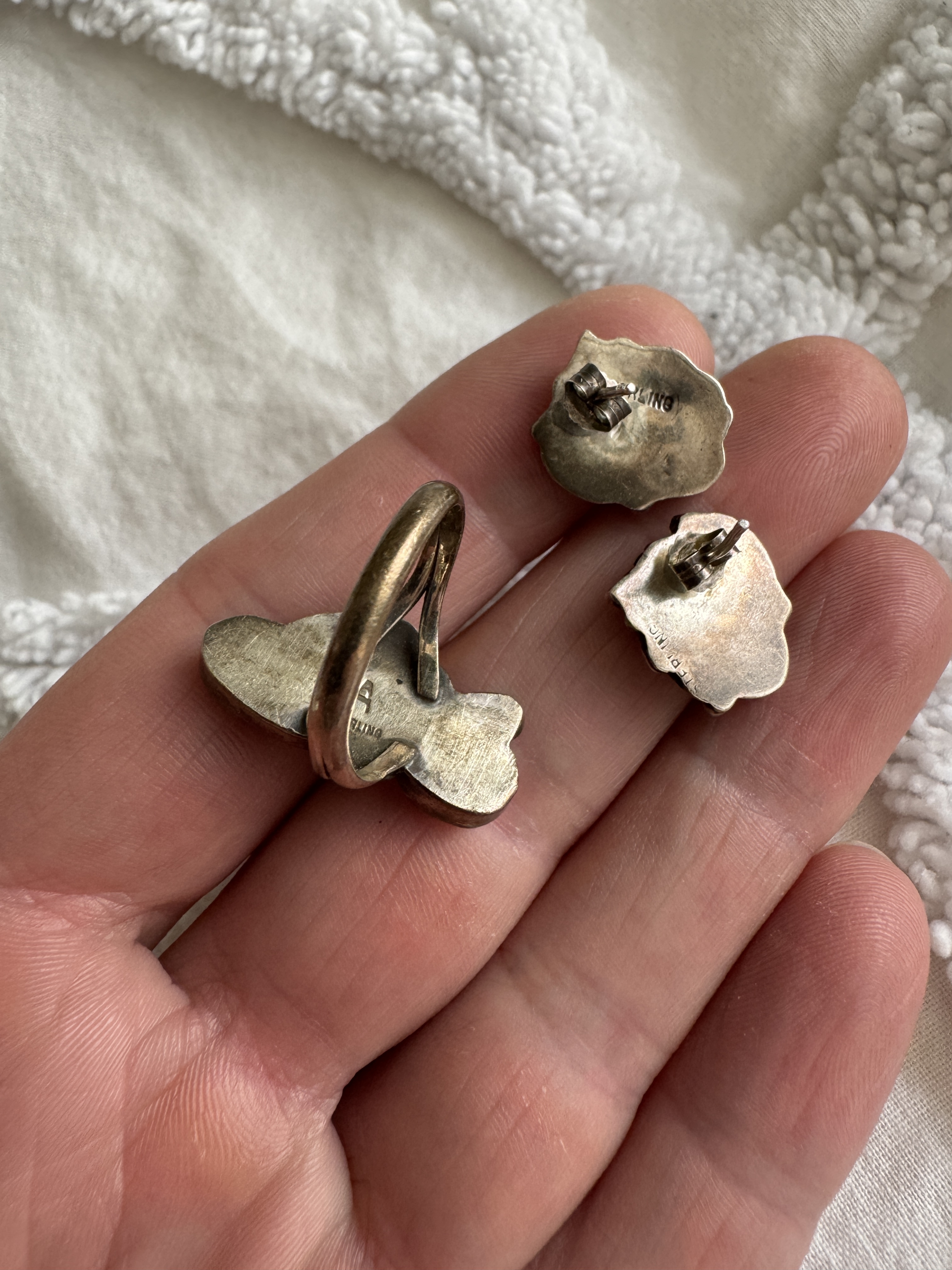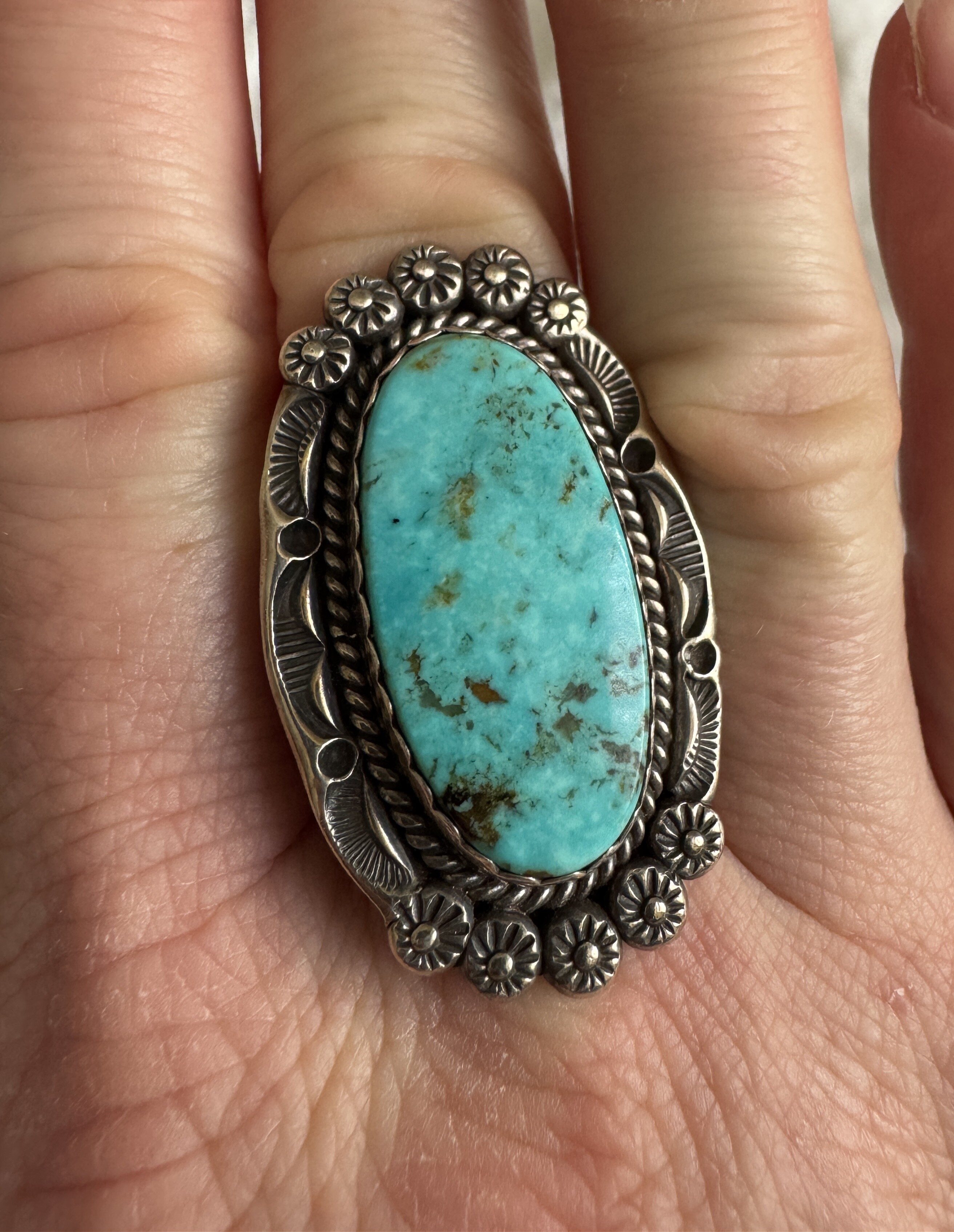 The large turquoise ring and chunky turquoise nugget earrings from my grandmother. I think the earrings are unique due to the use of sterling on the post and what I’m guessing is brass to hold the nugget.