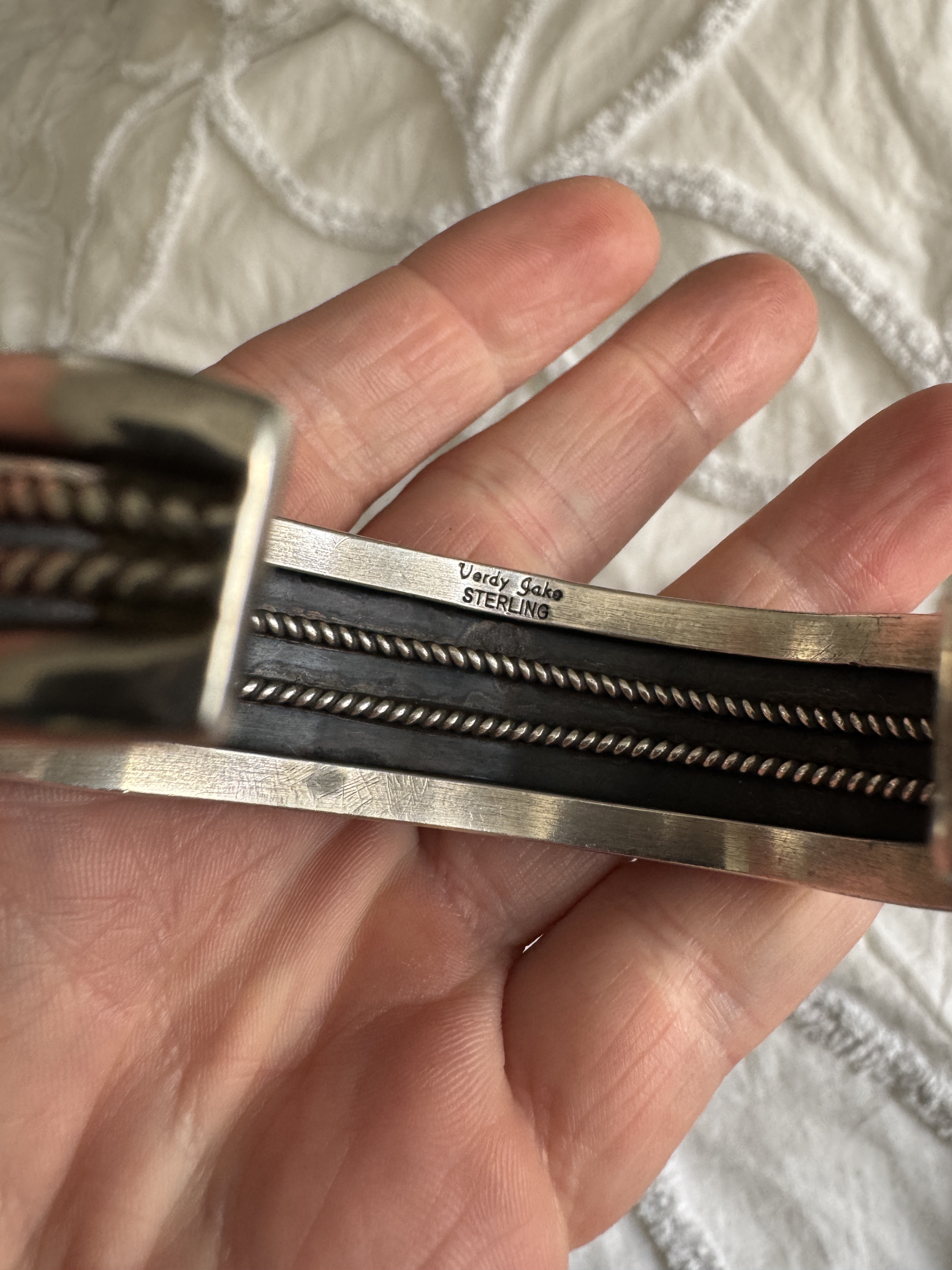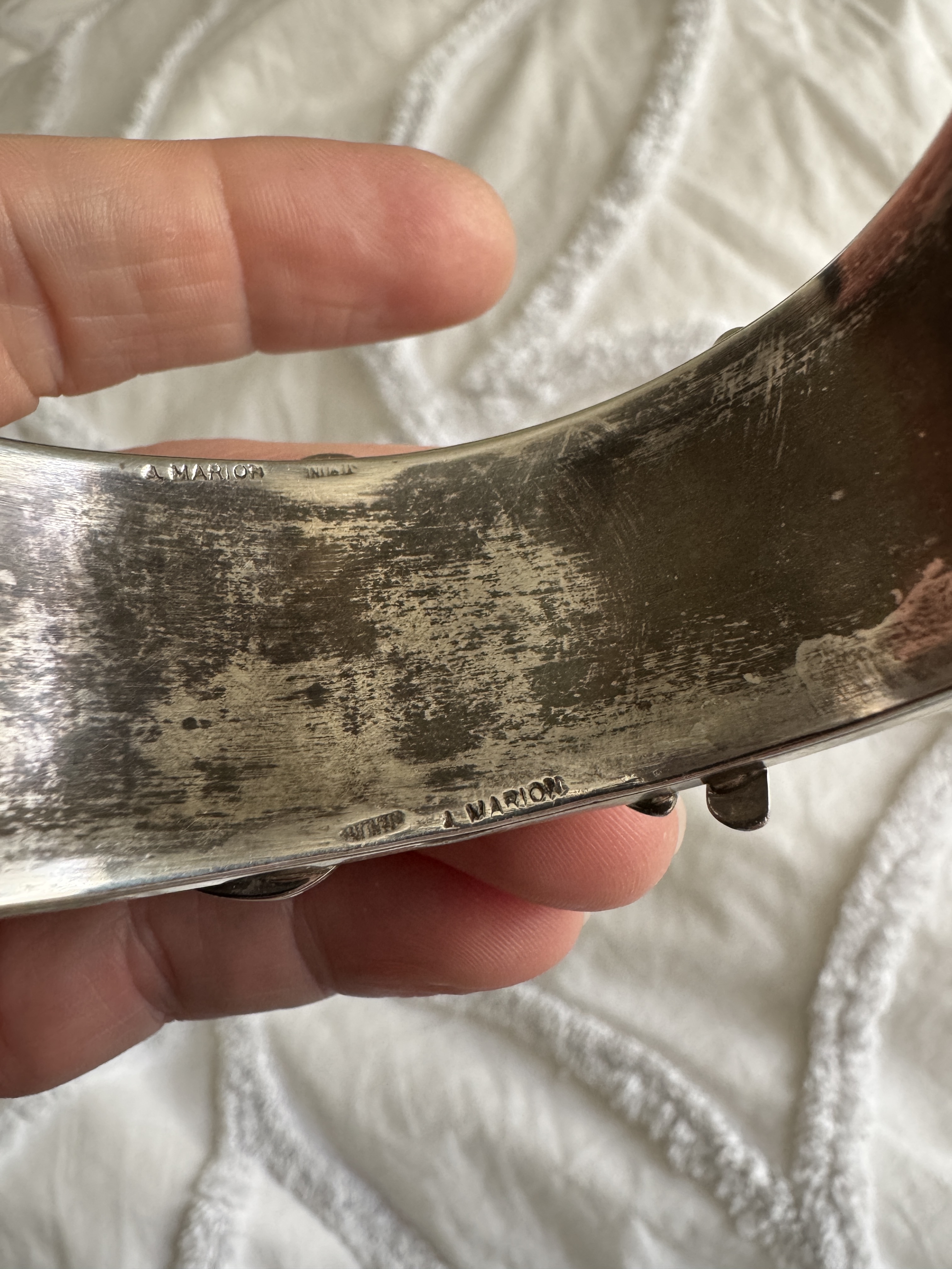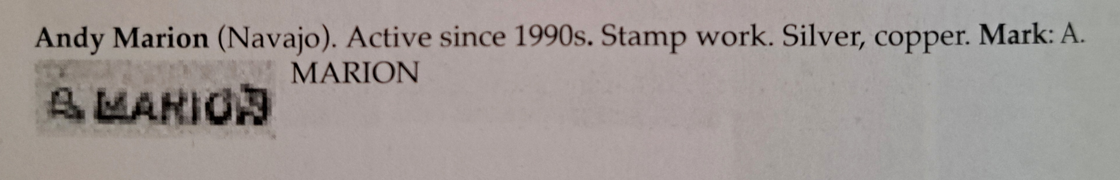 @BlytheEcho Very nice collection of turquoise jewelry. Your dragonfly cuff stands out to me - it’s wonderful! This hallmark info is from Hougart’s 3rd edition book of NA/SW Silver Hallmarks. Just sayin’, the hallmark for Andy Marion looks like a match to your cuff’s hallmark. You may want to research Andy Marion’s other work to see if there are similarities.