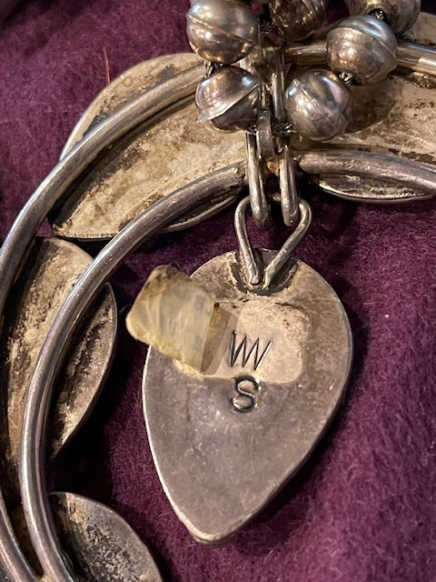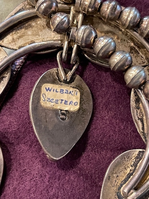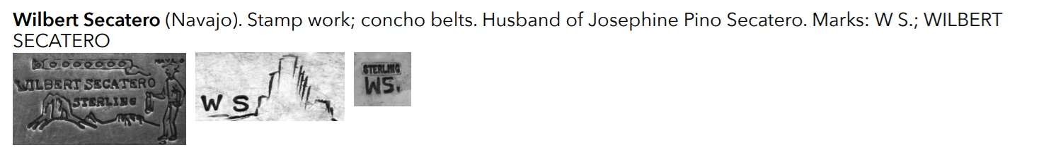 This doesn’t look like his hallmark IMO. I’m not sure who’s mark this is. And when I look for Wilbert Secatero items online I don’t see any squash blossoms; they’re mostly conchos/concho belts, and some of those seem to be questionably attributed. They might be getting WS (Willie Shaw) mixed up with the Wilbert Secatero mark. This hallmark doesn’t look quite like either of these to me. What is that first mark anyway - a V and W attached (or vice versa)?