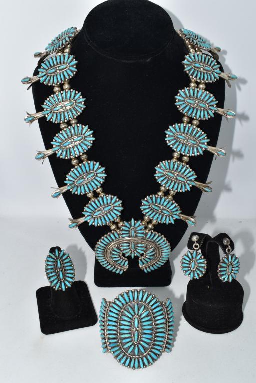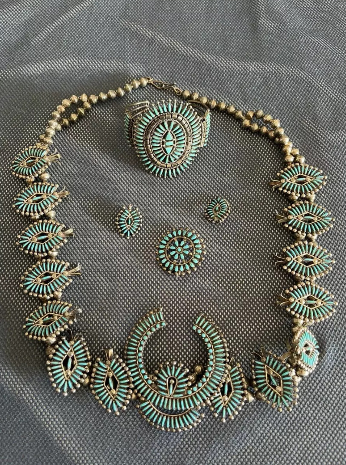 That is one very nice Zuni needlepoint set! I only have one or two pieces of Zuni Jewelry so I’m sure some of the others can give you much better information.
