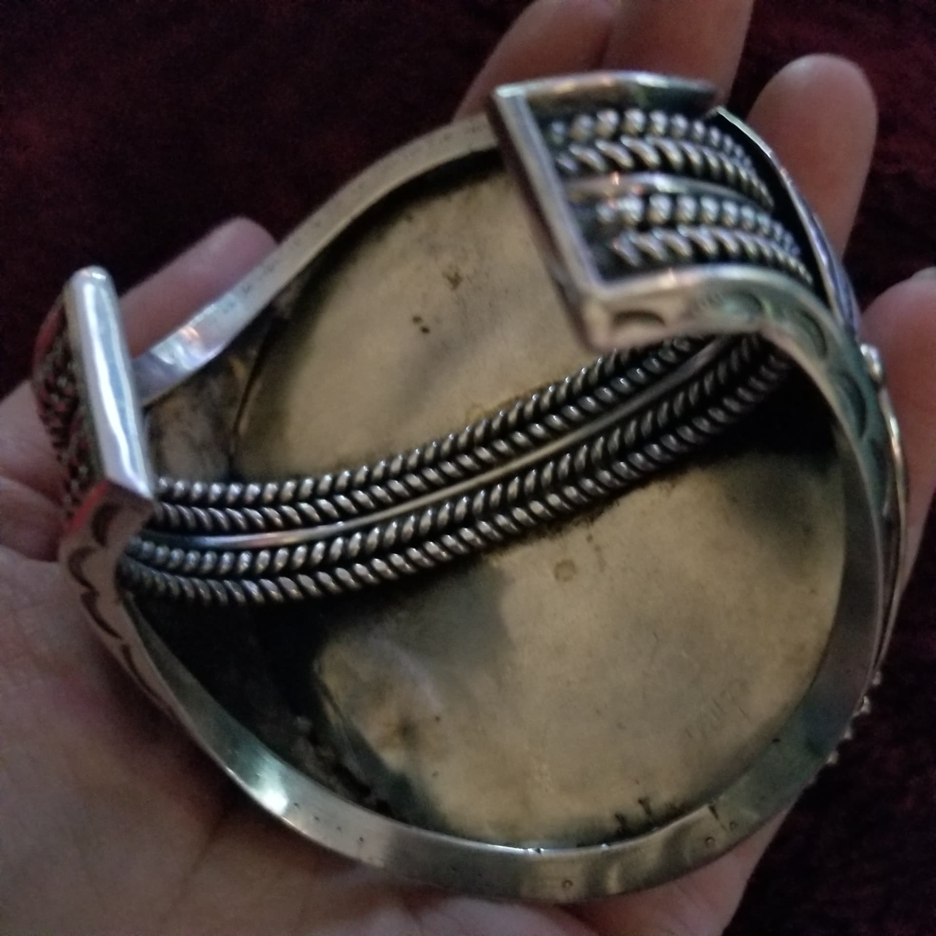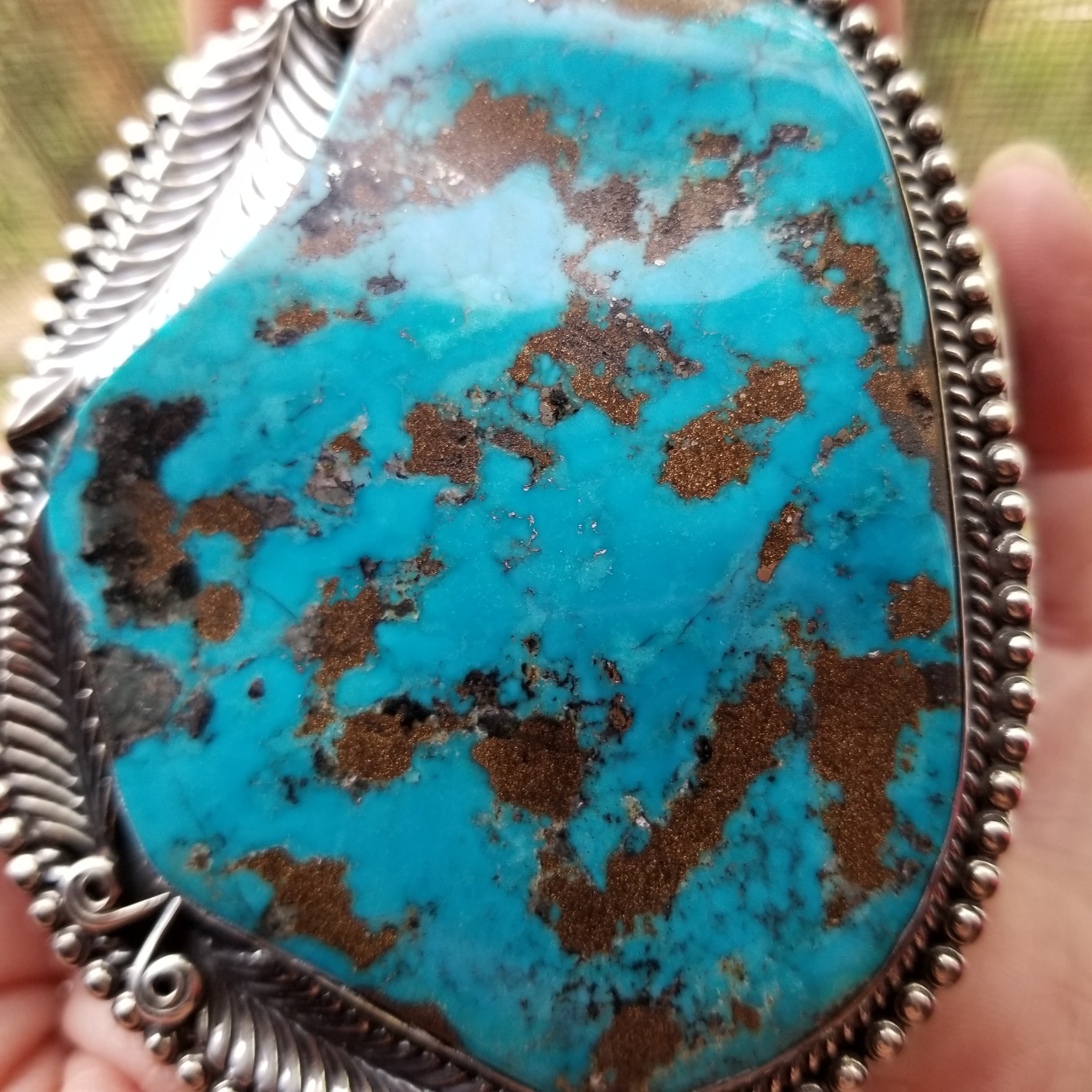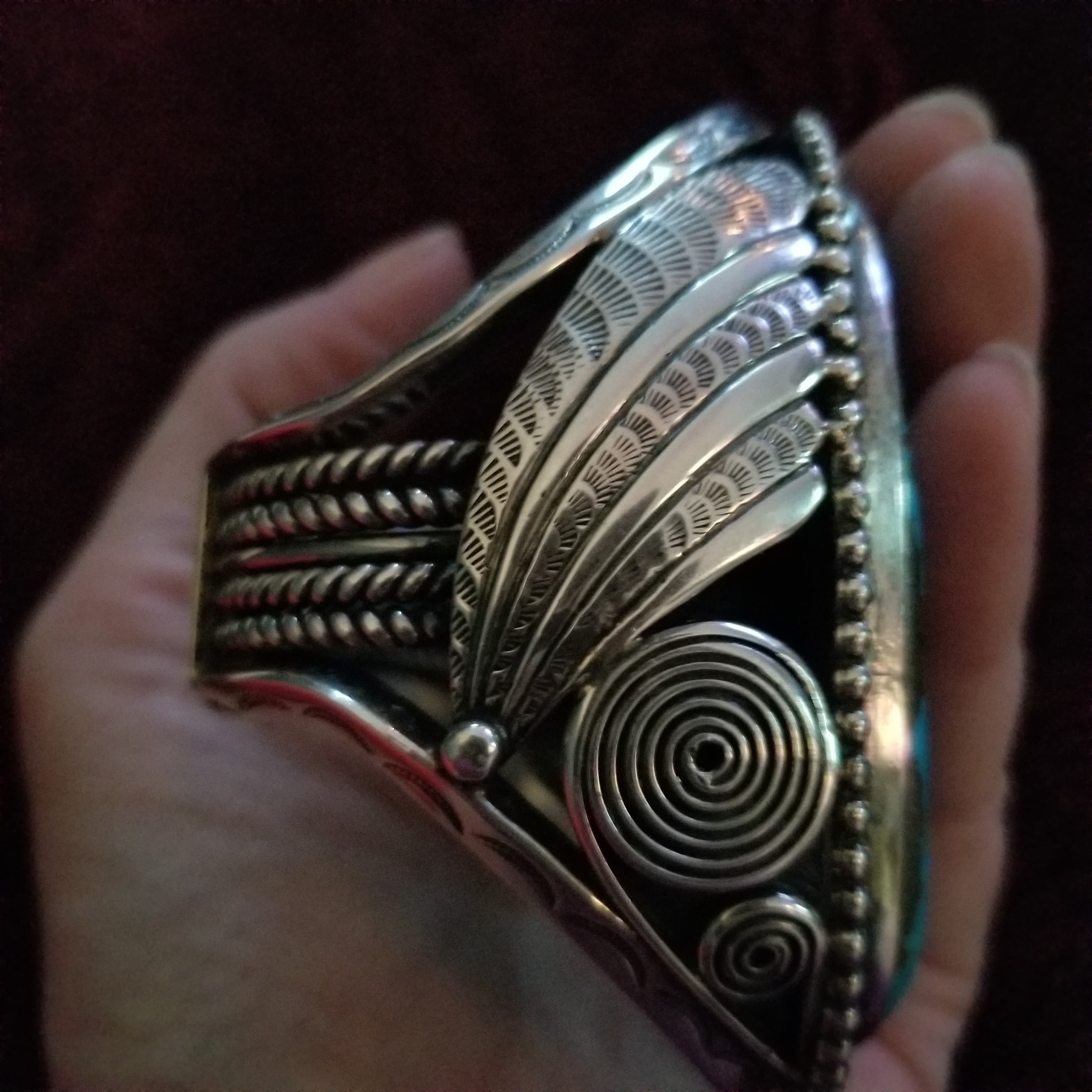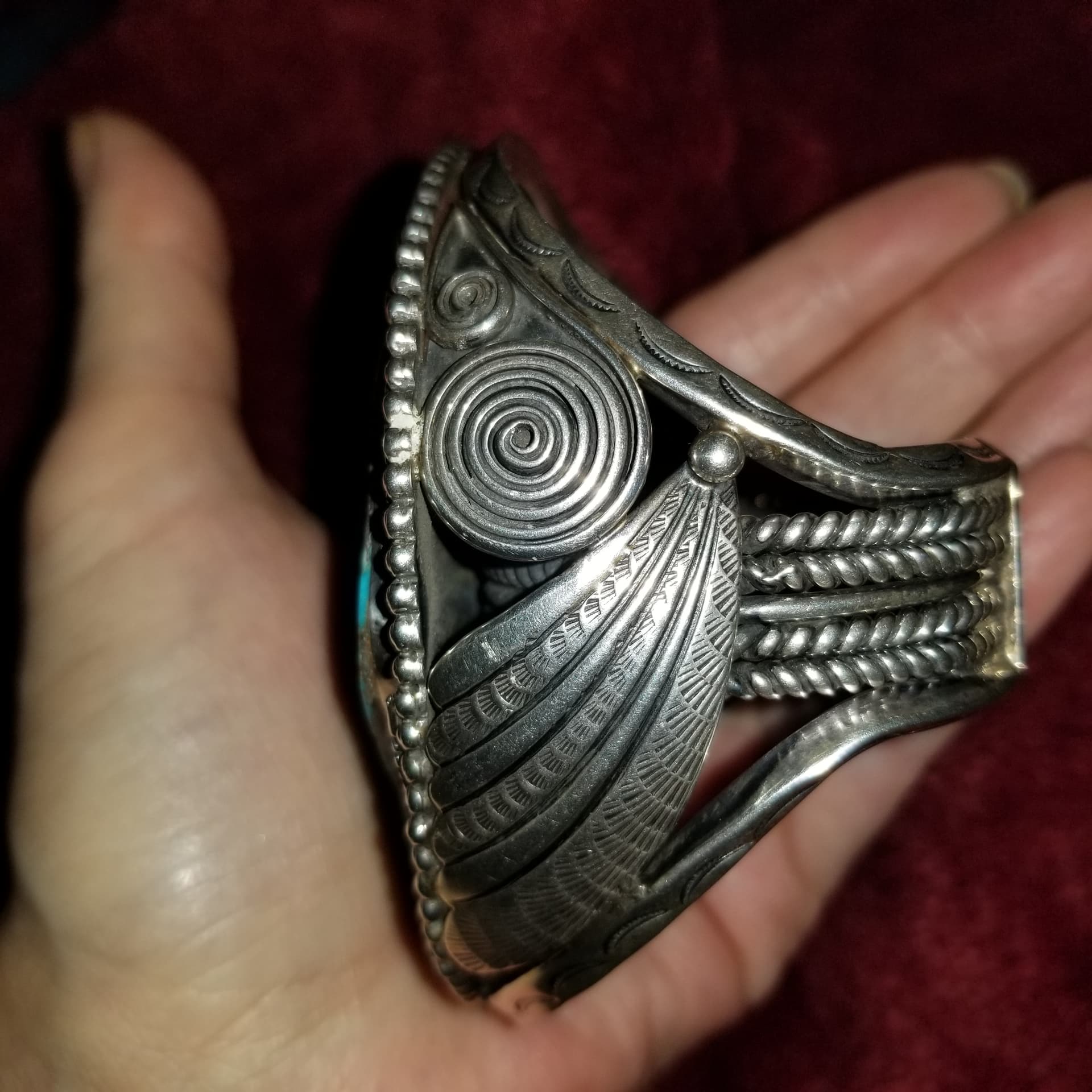 I am unsure of the age of this piece, and all I really know about it is that the turquoise is Ithaca Peak mine, and that it’s sterling, and incredibly heavy.