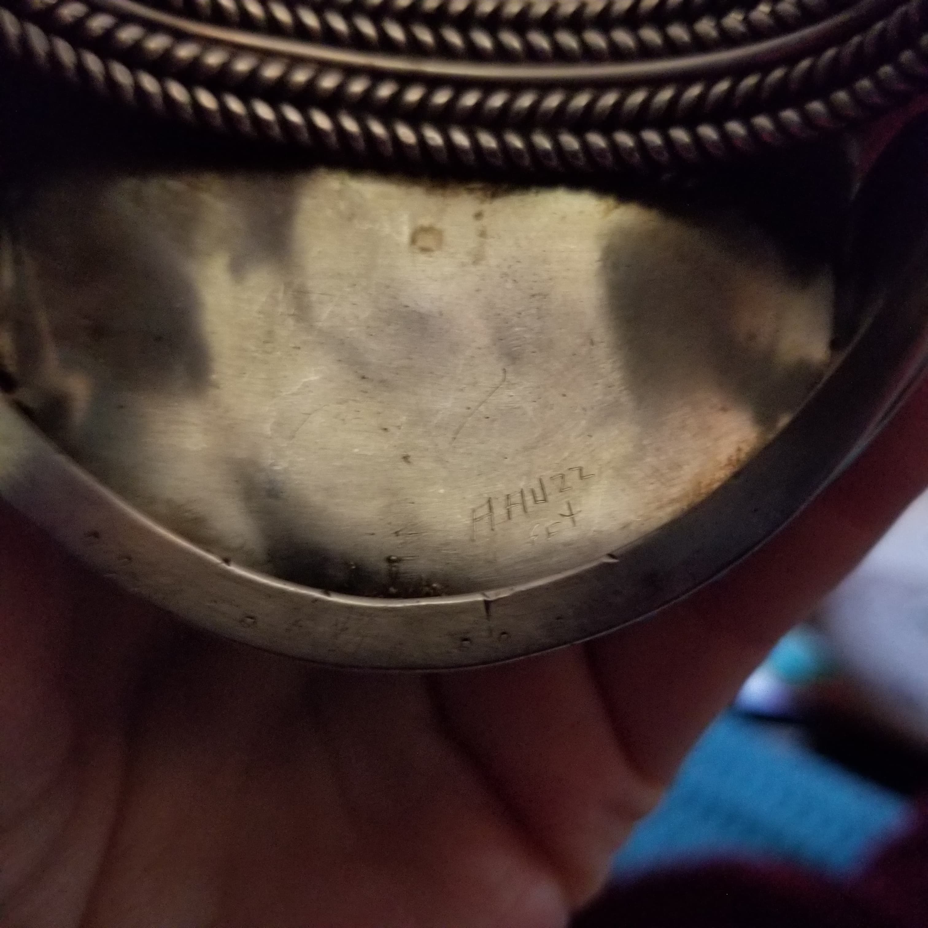 Beautiful cuff! I don’t think the letters and numbers are a hallmark. They’re probably a shop/trading post code.