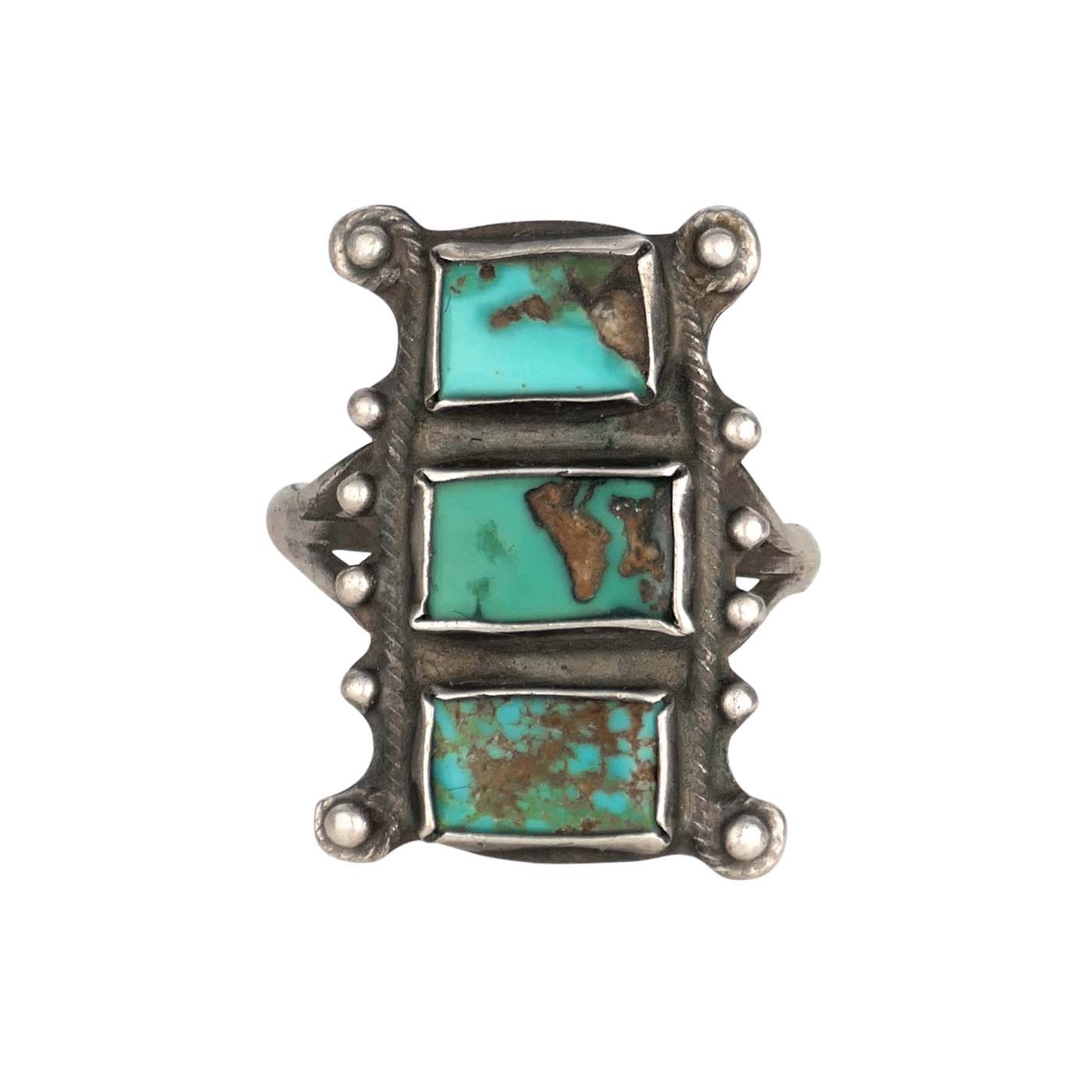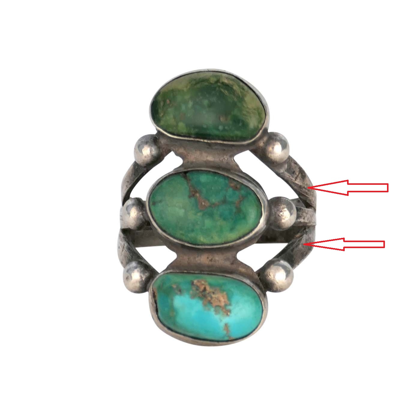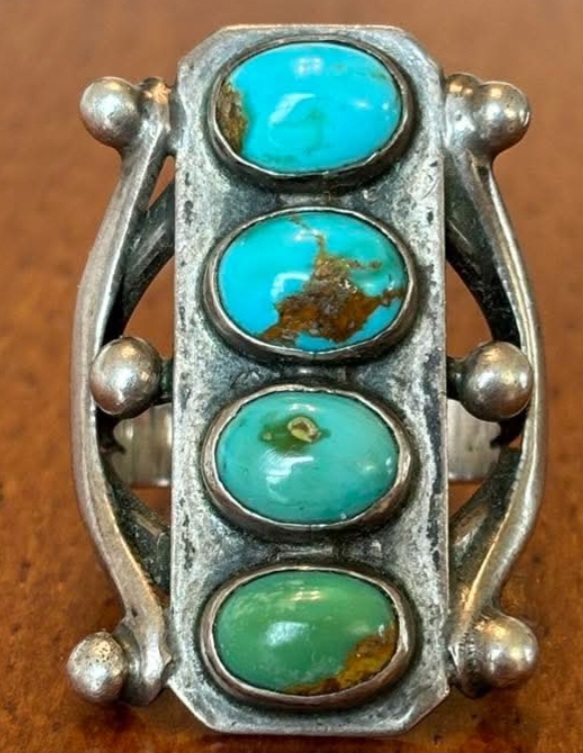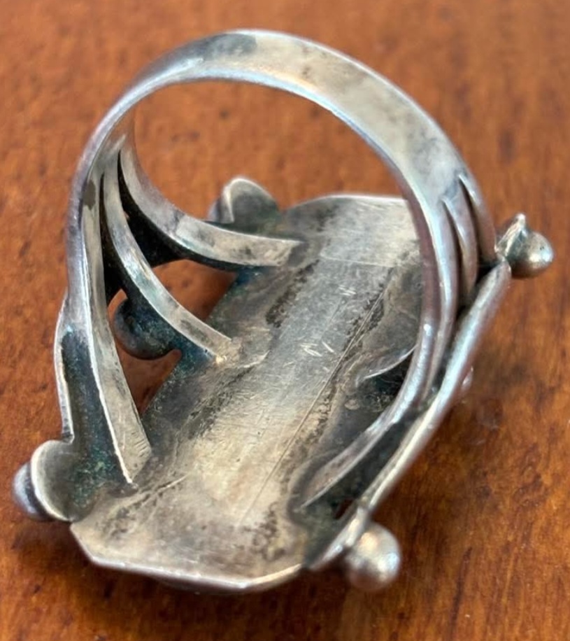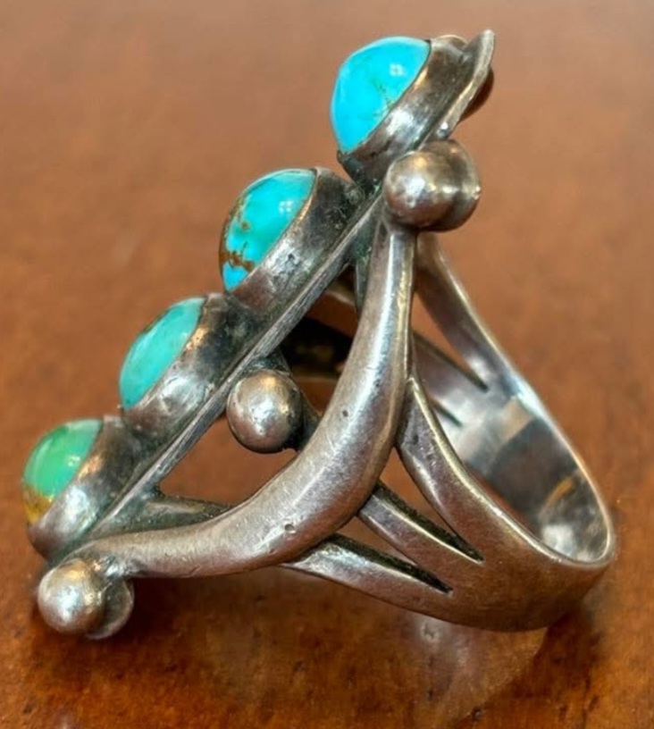 For me, the overall design doesn’t look particularly Native American. For example, those long crescent elements on each side. And, that “stoplight” design with the turquoise. The raindrops don’t look all that well made to me, either. And, the band. Is that a good example of a 1900-1930 ring band? IDK, was this design & elements commonly used in 1930s NA jewelry?