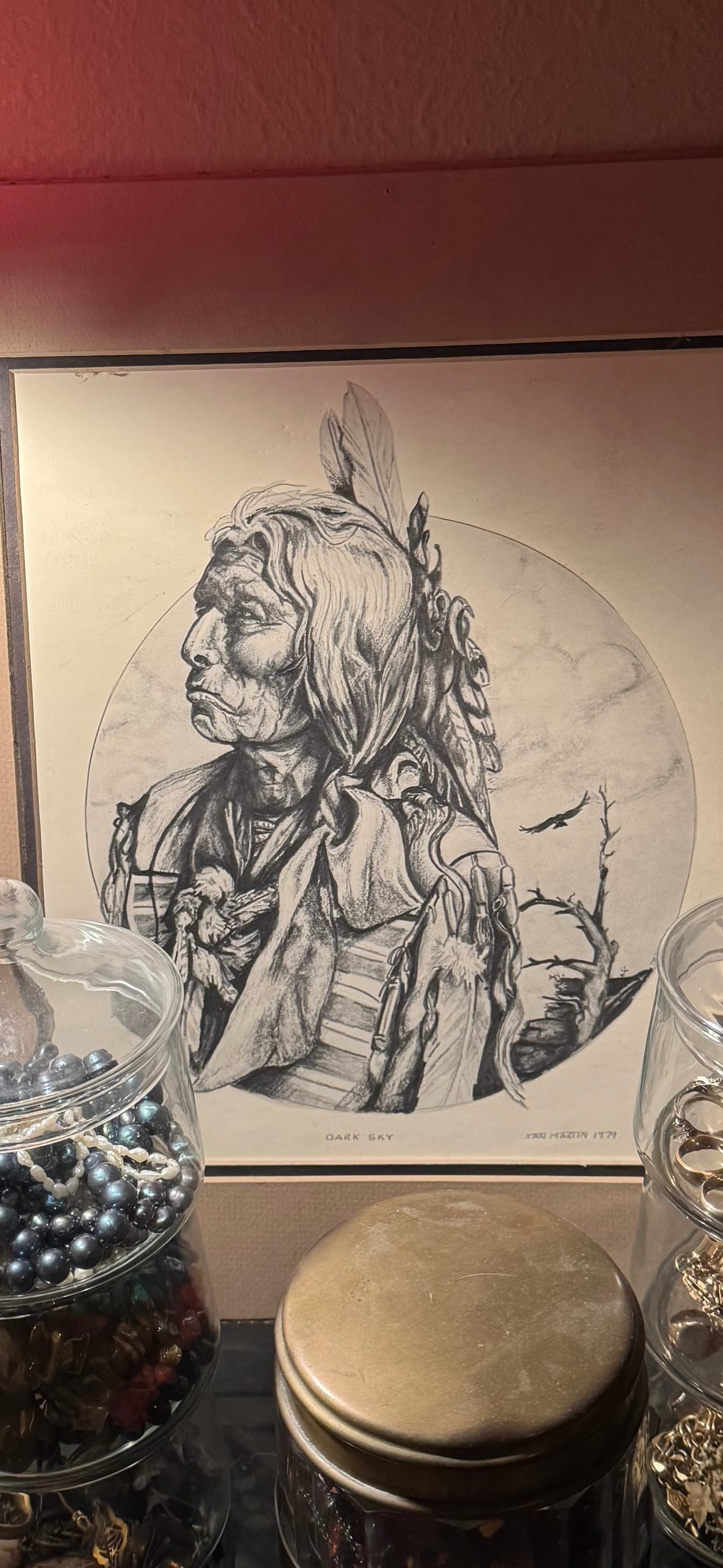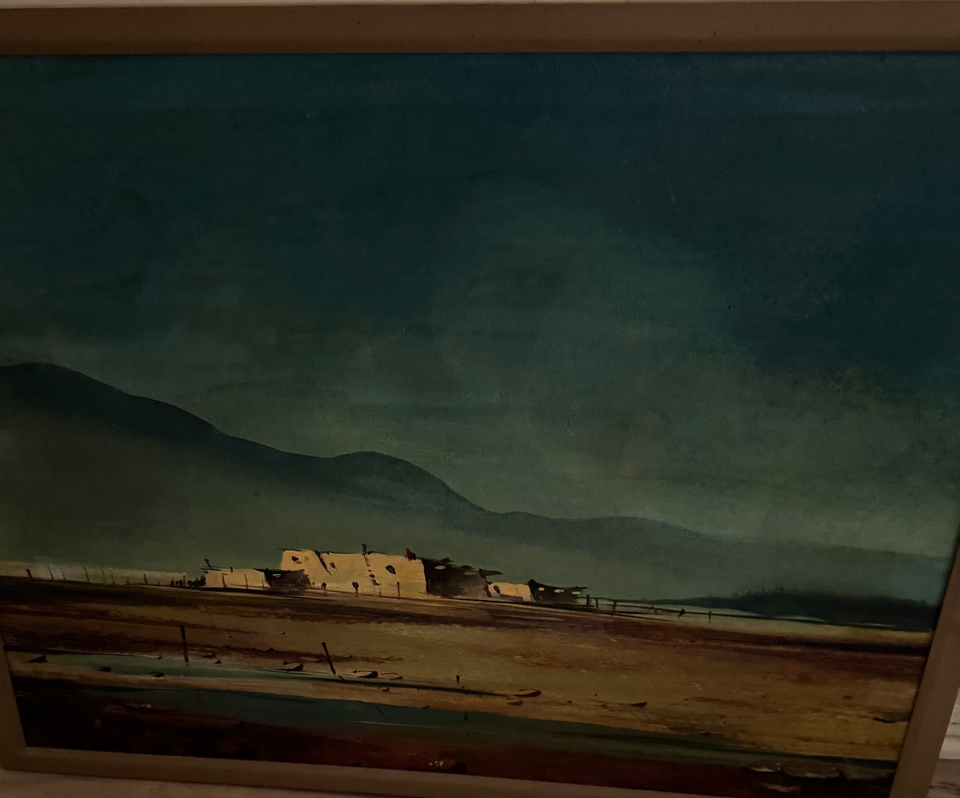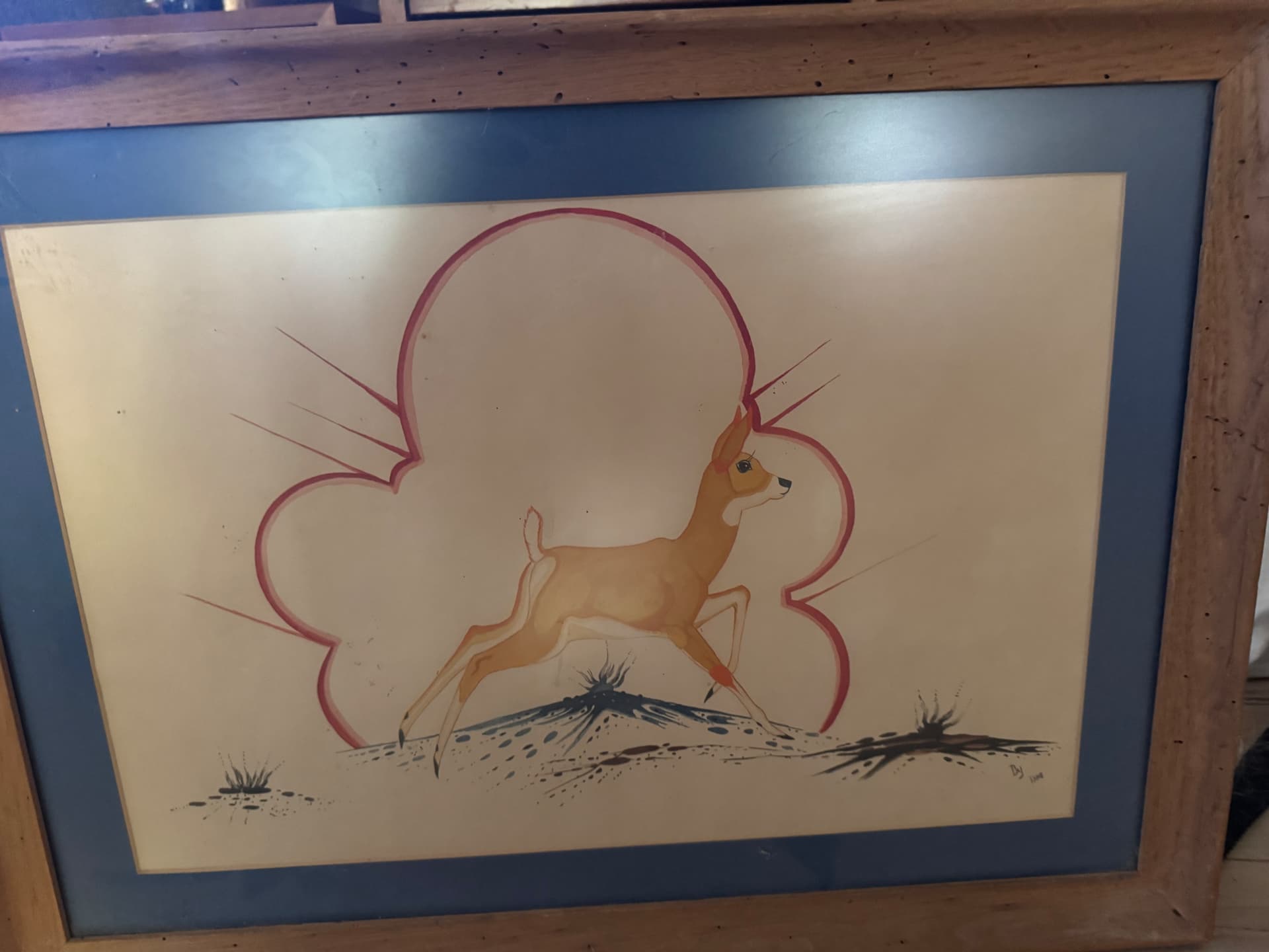 I know nothing about art, including Native American art. So any of your thoughts and comments are well appreciated as always. The first print is labeled “Dark Sky”. The artist is San Martin (sounds more like an island) and it is dated 1979. The second appears to be a watercolor deer signed Tahe. That is a common Native American name I think. The last is an oil or maybe acrylic. There is no signature but it kind of reminds me of New Mexico.