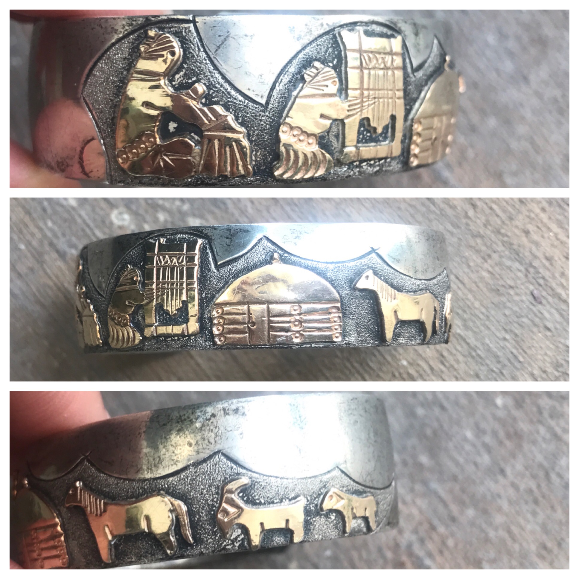 I picked up this sterling & 12K GF storyteller cuff and I’m really excited about it because I’ve never owned one before. I was hoping for some assistance with this one. I was curious about the hallmark which looks very familiar to me. I was also curious about a price range for a cuff like this. Also, does the cuff actually tell a story? Or is it just a cumulation of images? Thanks!