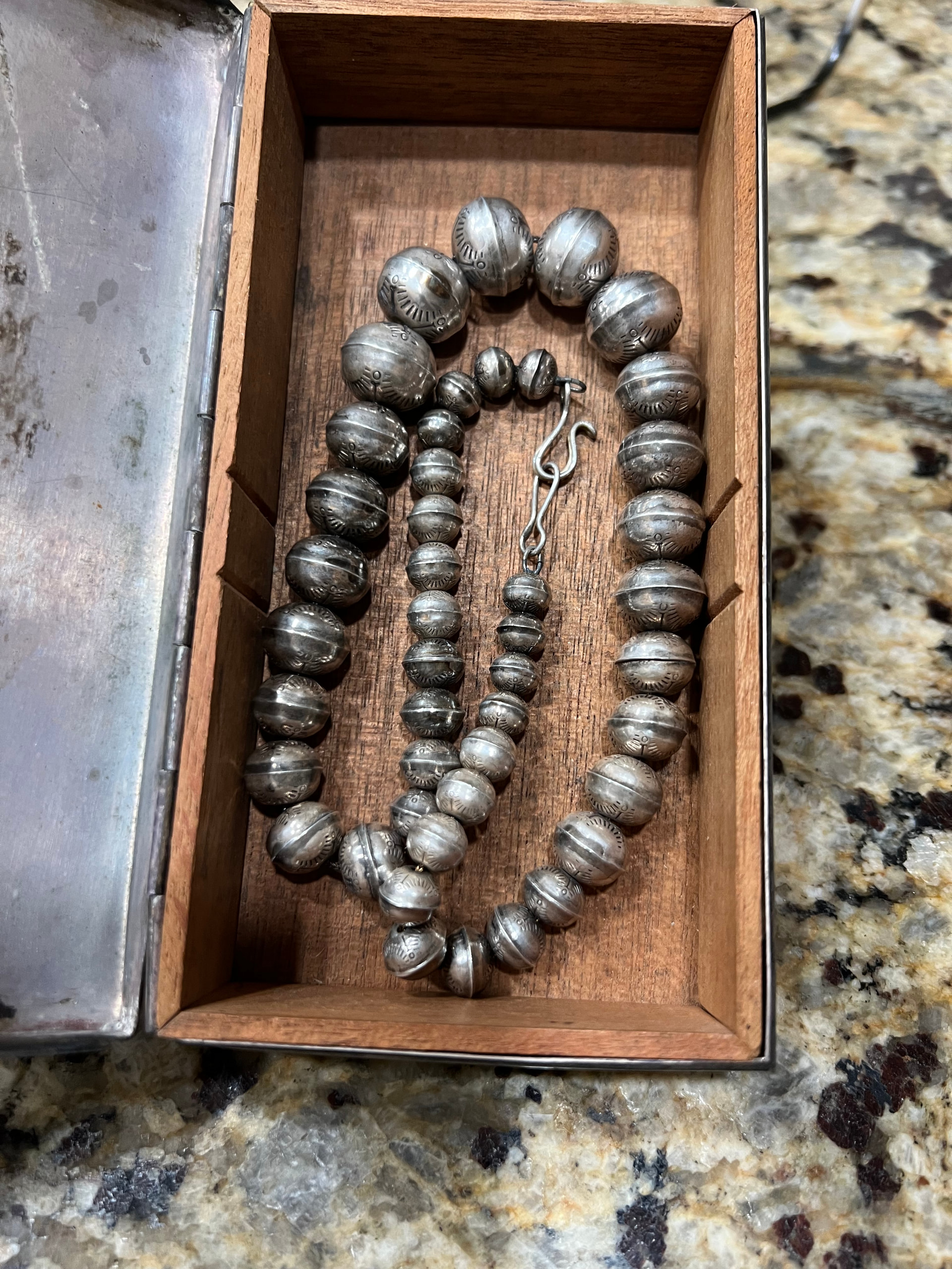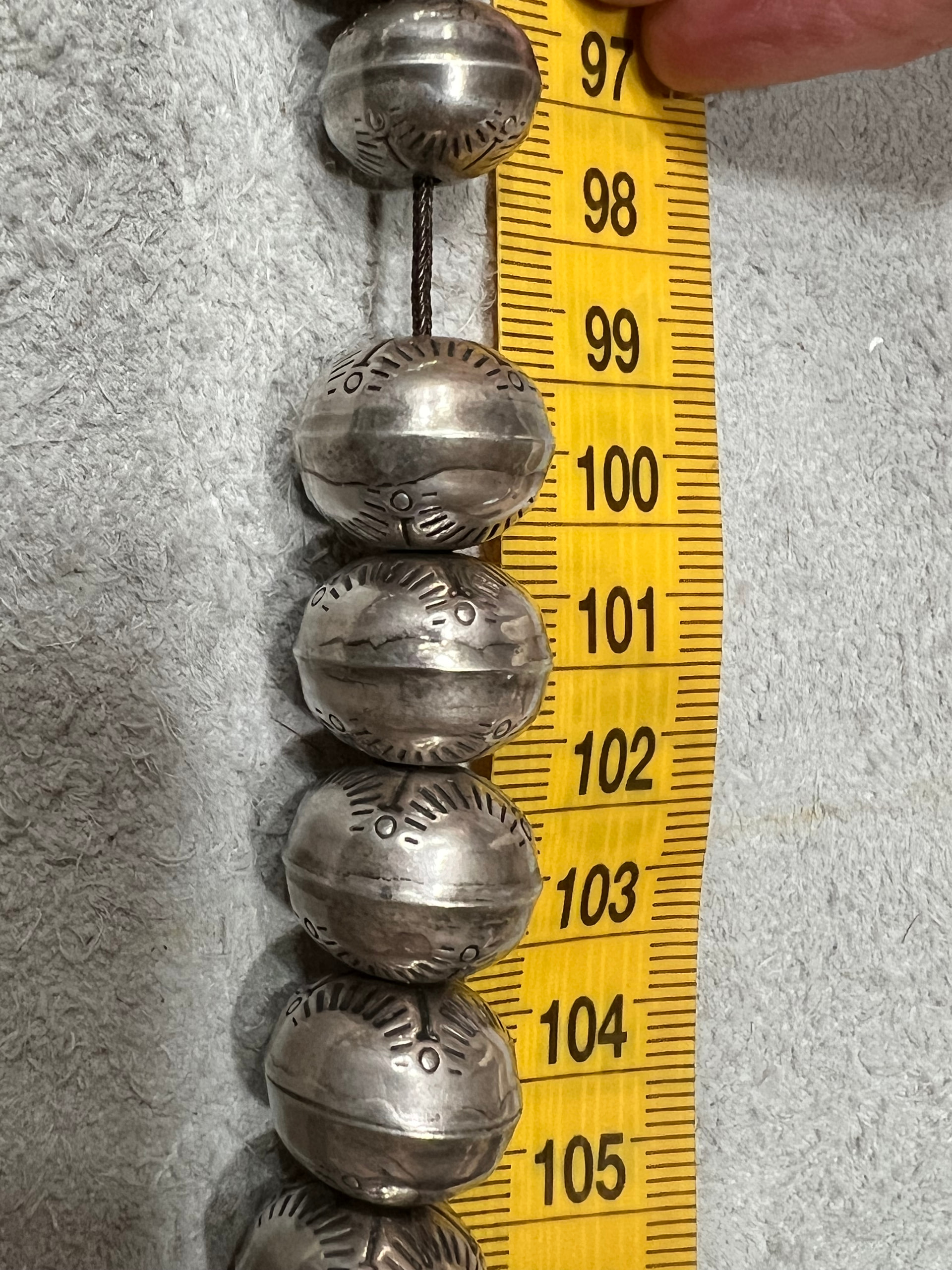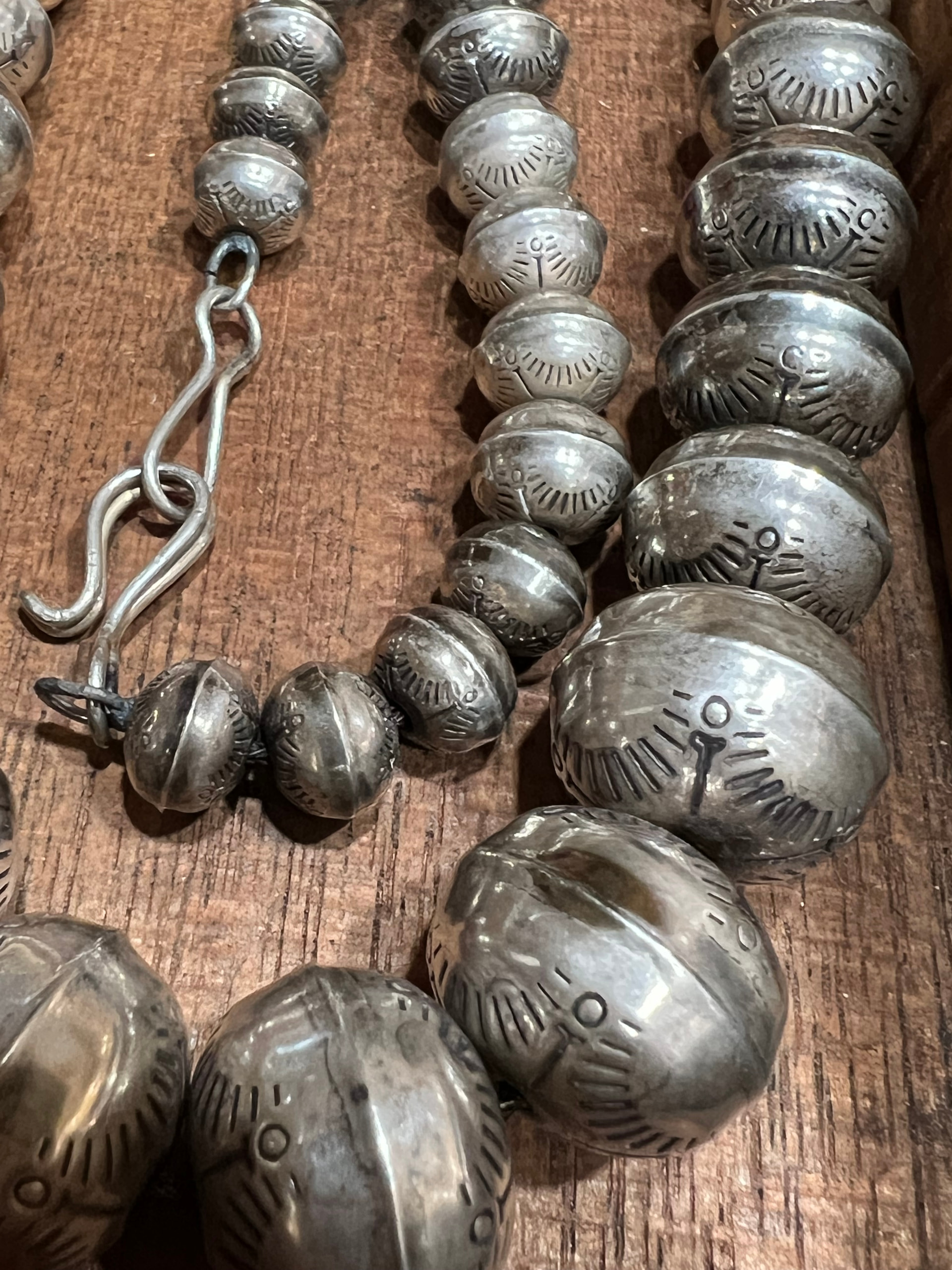 This necklace just came to me from a friends mom who passed last year. I believe it to be a Navajo stamped sterling silver pearl bead necklace (my silver guy confirmed silver) It has a drop length of 9” and a total length of 18”. Beads go from 15mm down to 5 mm. Do dents and has good tarnished wear. Unsure of age. Maybe 60’s…. I have more photos, but this should show most of details. I’d love to know age and worth as this will determine if her my friend keeps it or sells it