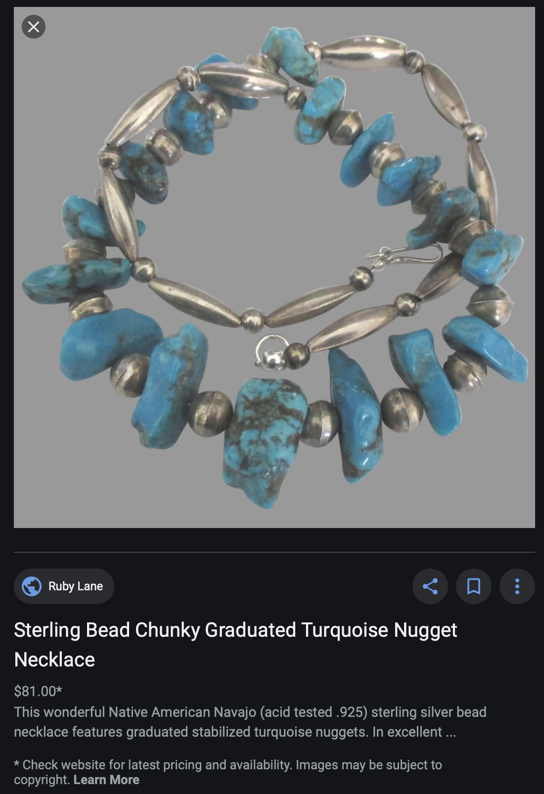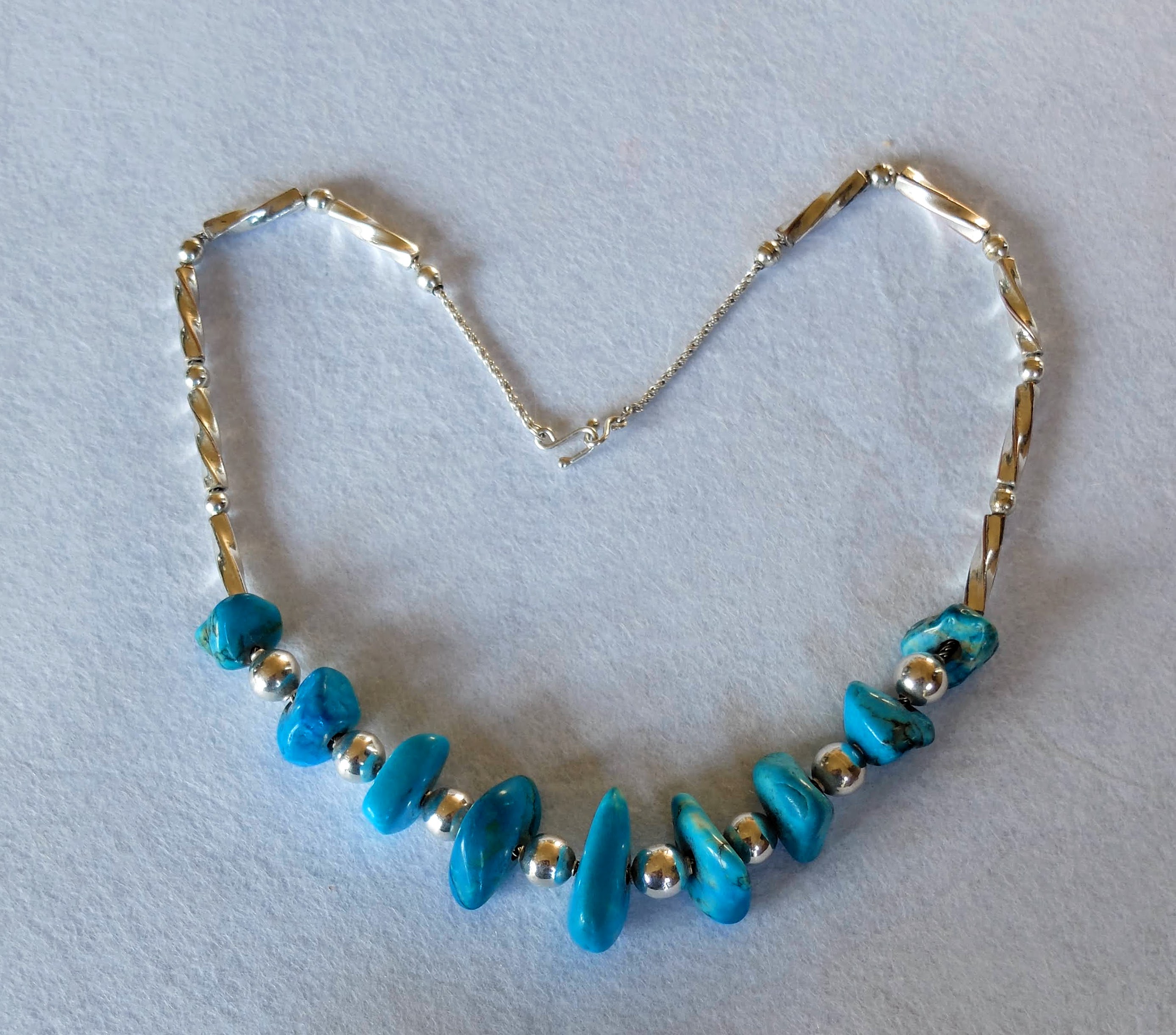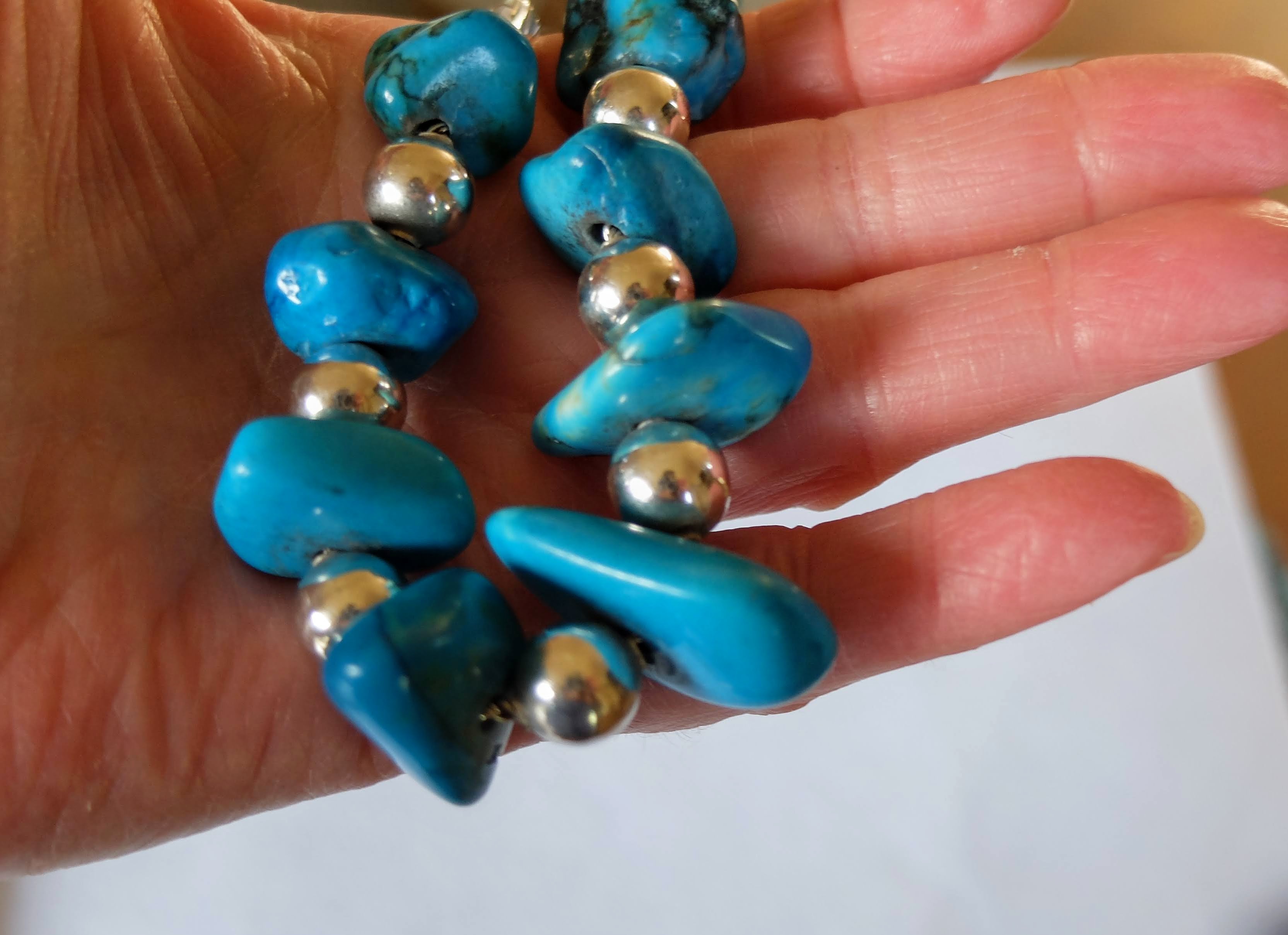 I picked up this up at a flea market today for $20. There are no markings but it tests as sterling silver. The turquoise measures from about 1.5" to 1" long . I can just barely see a horizontal line on the round beads. I polished the metal. It’s really lovely; when I first saw it, I thought it would cost A LOT more.