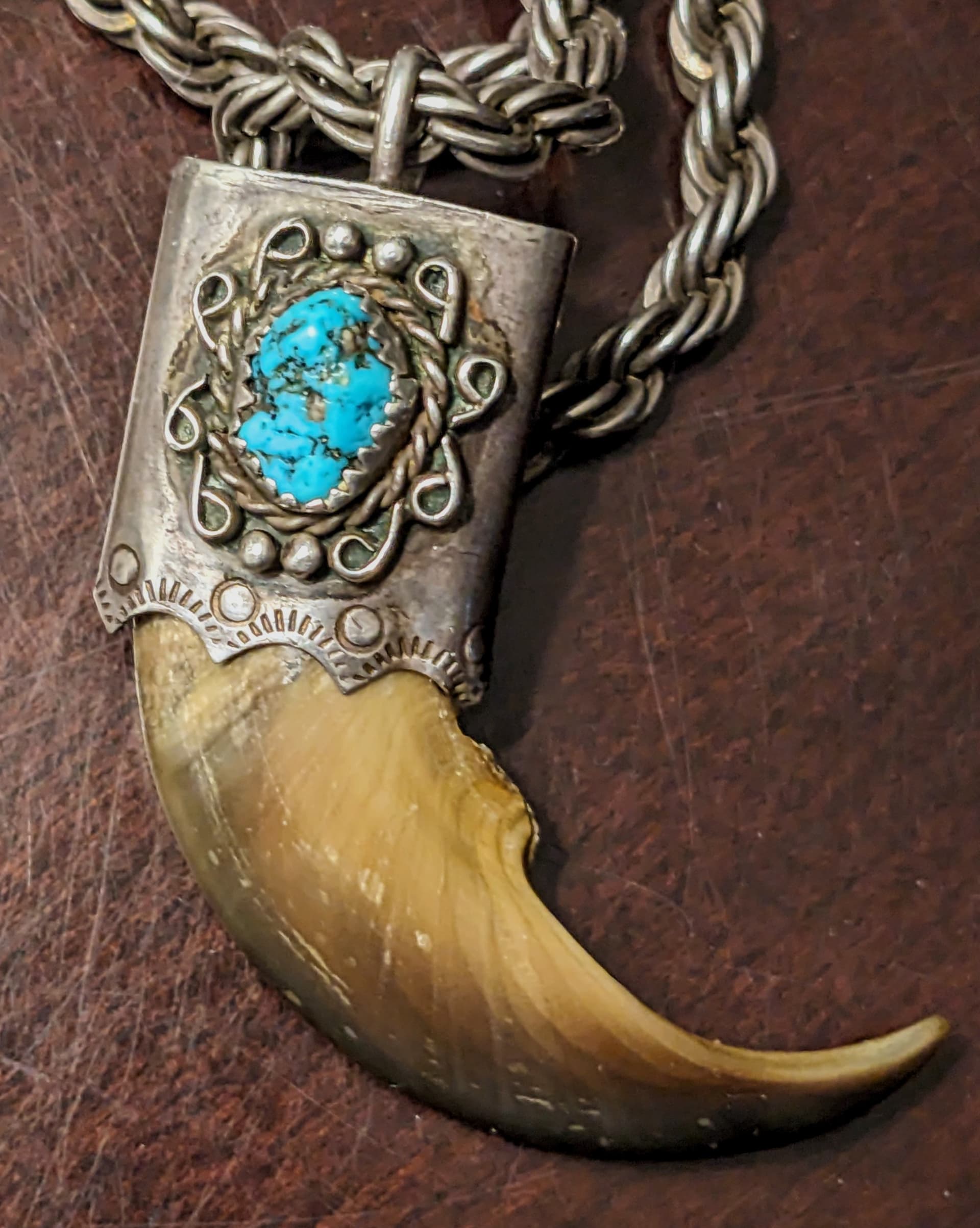 Agree. This is Kingman nugget. Additionally, I think looking for a Native American maker for this is unlikely to yield results. Bear claw everything was wildly,virally popular from 73’ -74’ on, and there were many, many non-native silversmiths (including myself) producing bear claw pendants for orders from numerous trading companies like Running Bear in Gallup.