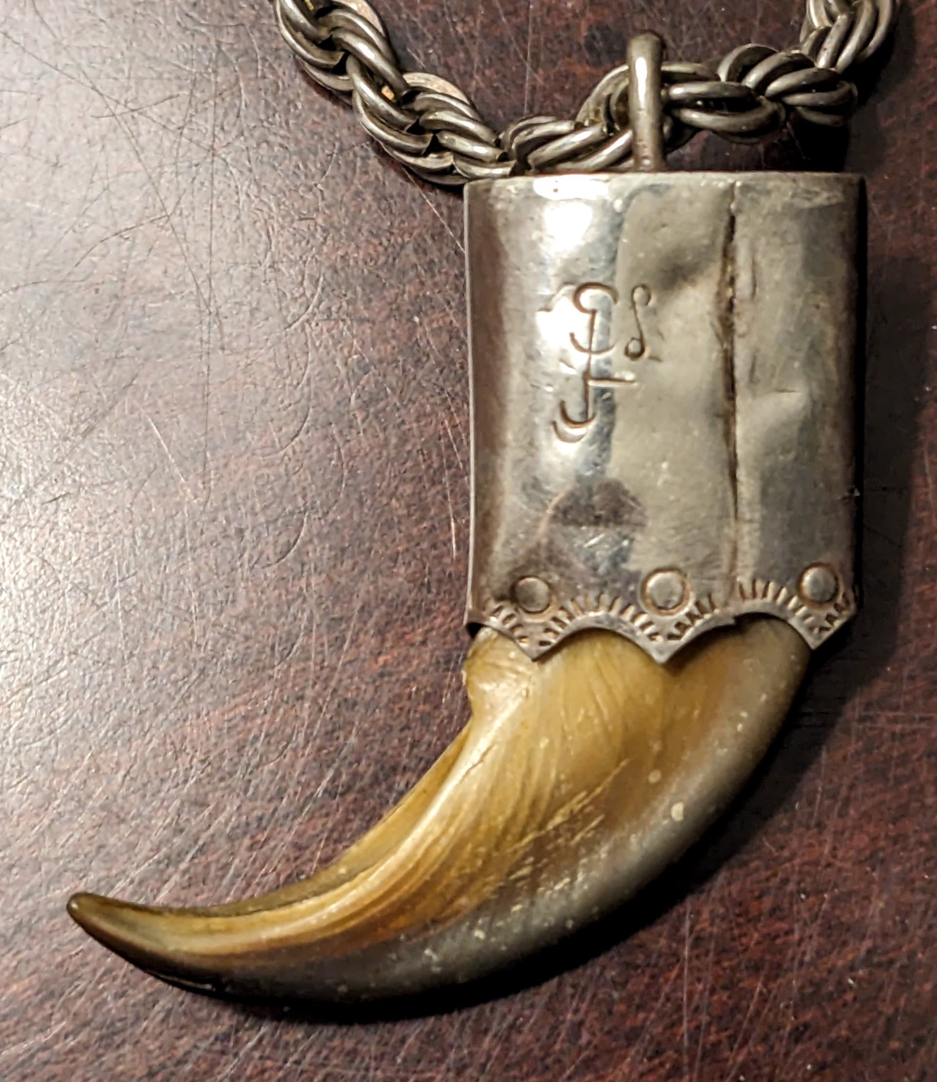 Yes, there are many restrictions when it comes to selling real bear claws. This piece was created long before artificial bear claws hit the market and at a time when there were far fewer laws prohibiting the sale of certain animal parts. Were this shop still in business in Kentucky, they could no longer sell this piece, but we’re talking about 50 years ago. That said, when I acquired the pendant the claw was loose and I was able to examine the end and inside. It has since been re-set by a Navajo silversmith.