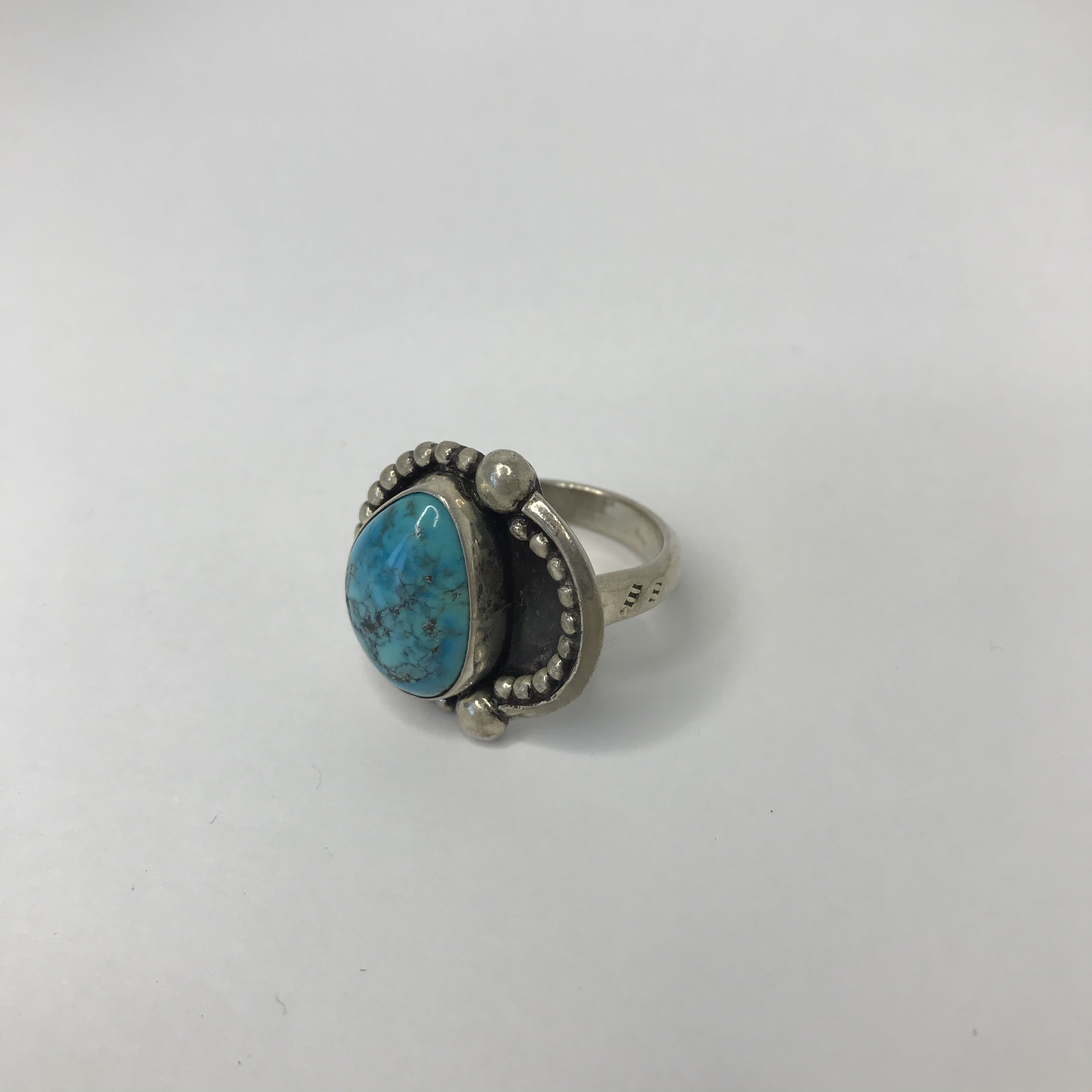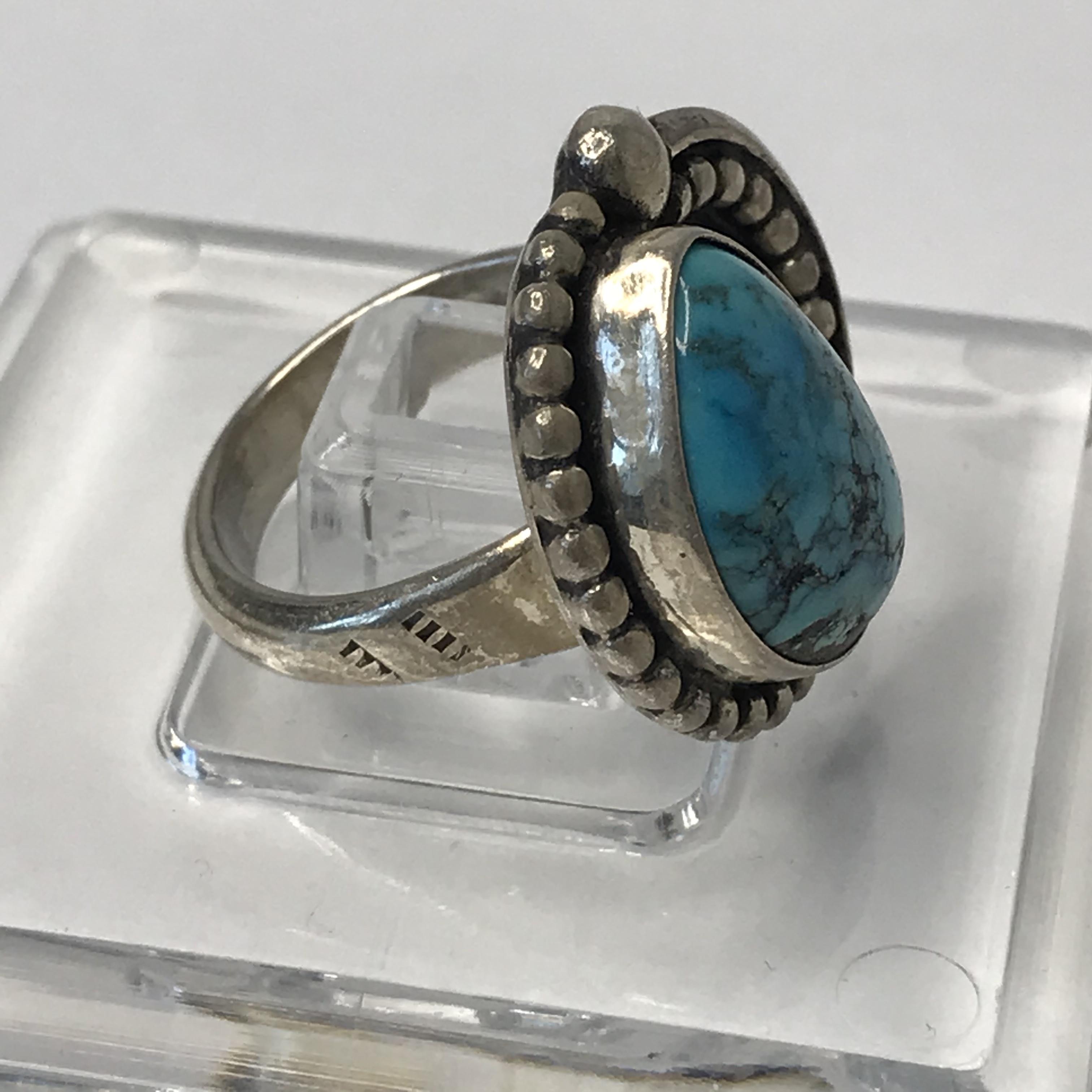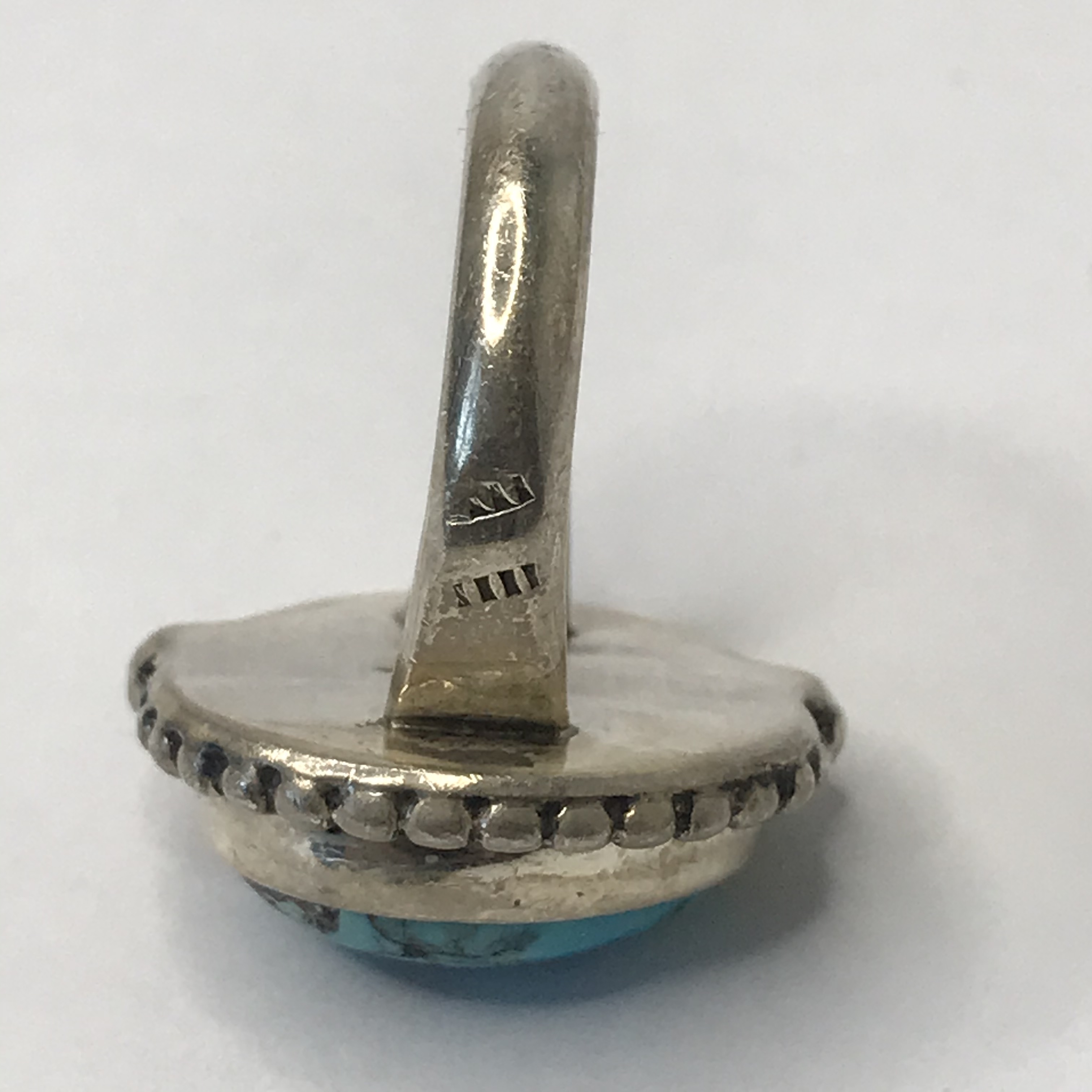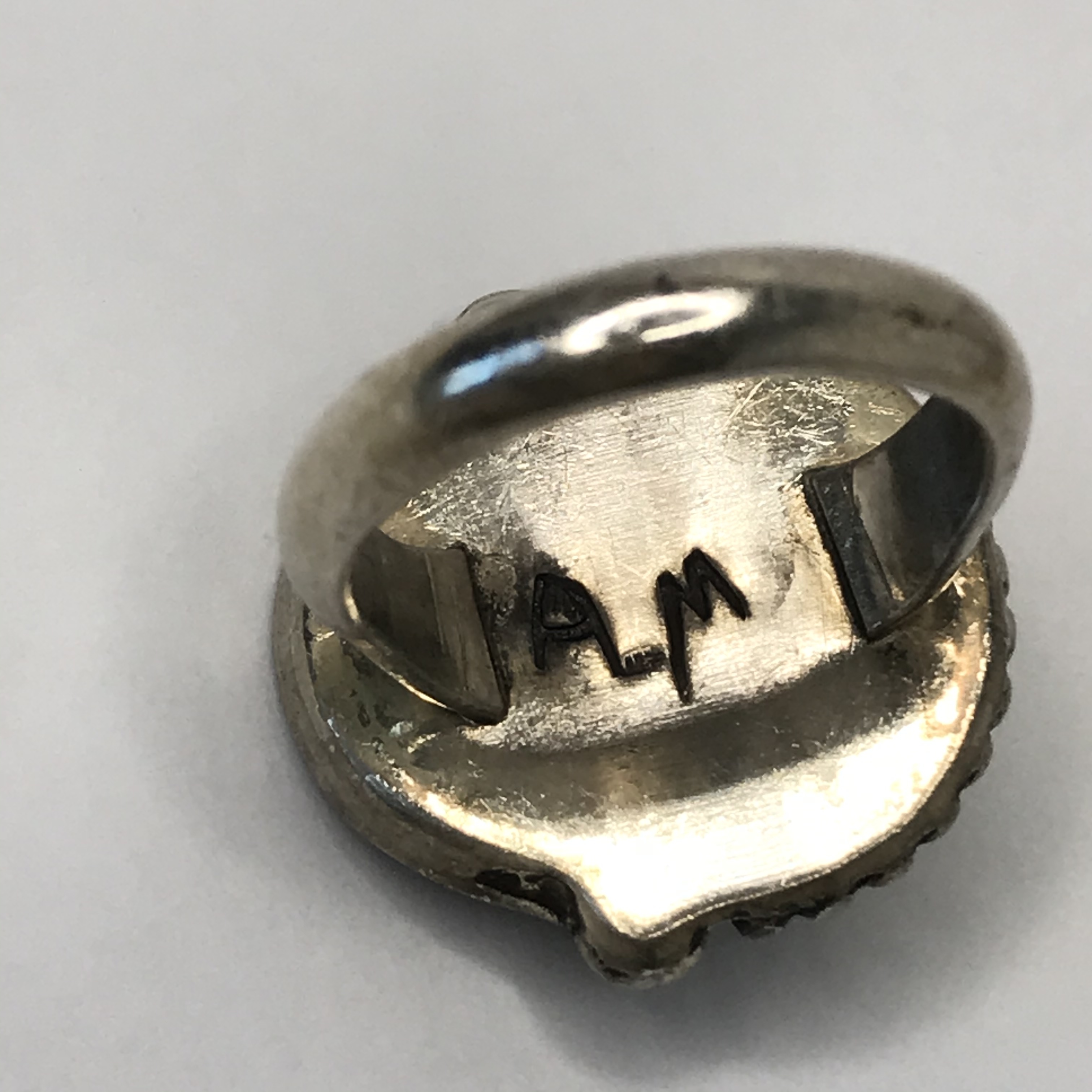 The ring is really nice. Navajo with a piece of Morenci Turquoise. Can you tell me if that mark is stamped or etched into the silver? Also, do you read it as ALM?