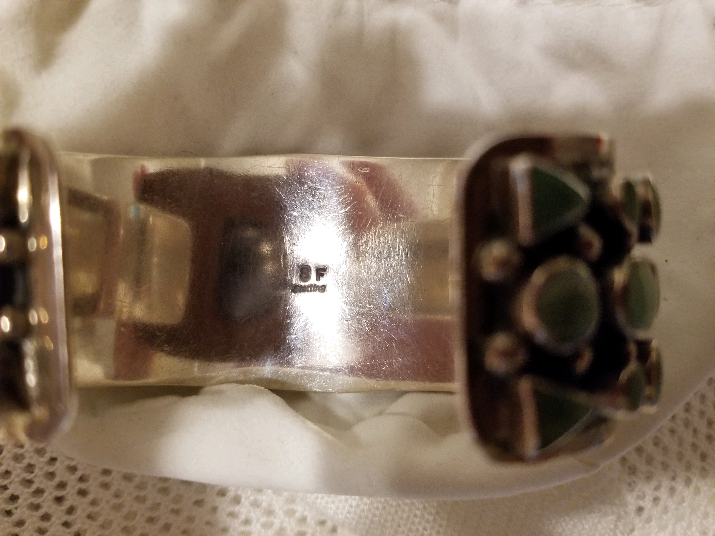 I purchased this cuff a few years ago in San Antonio. It has 60 stones and stamped Sterling with hallmark SF. Possibly Steve Francisco?