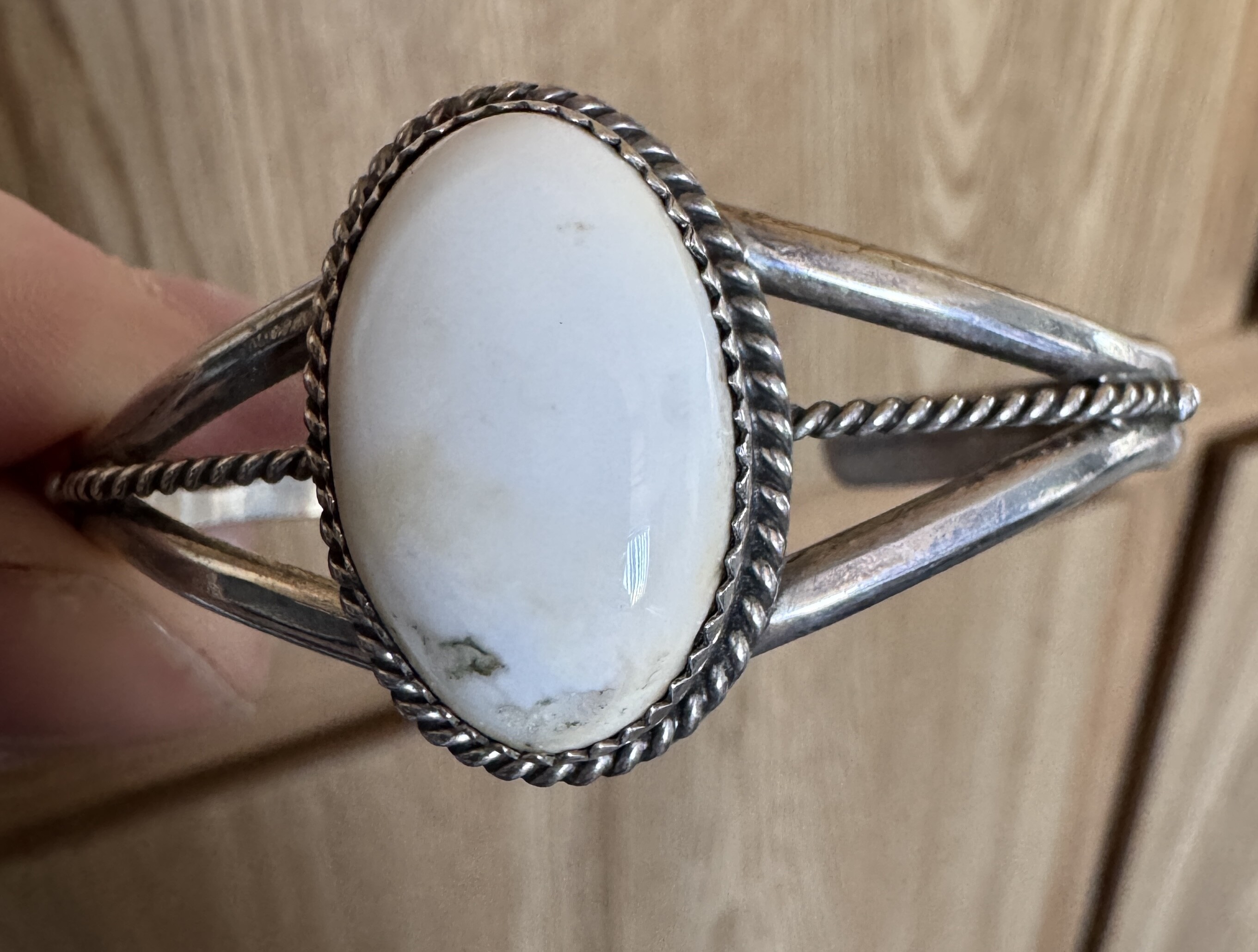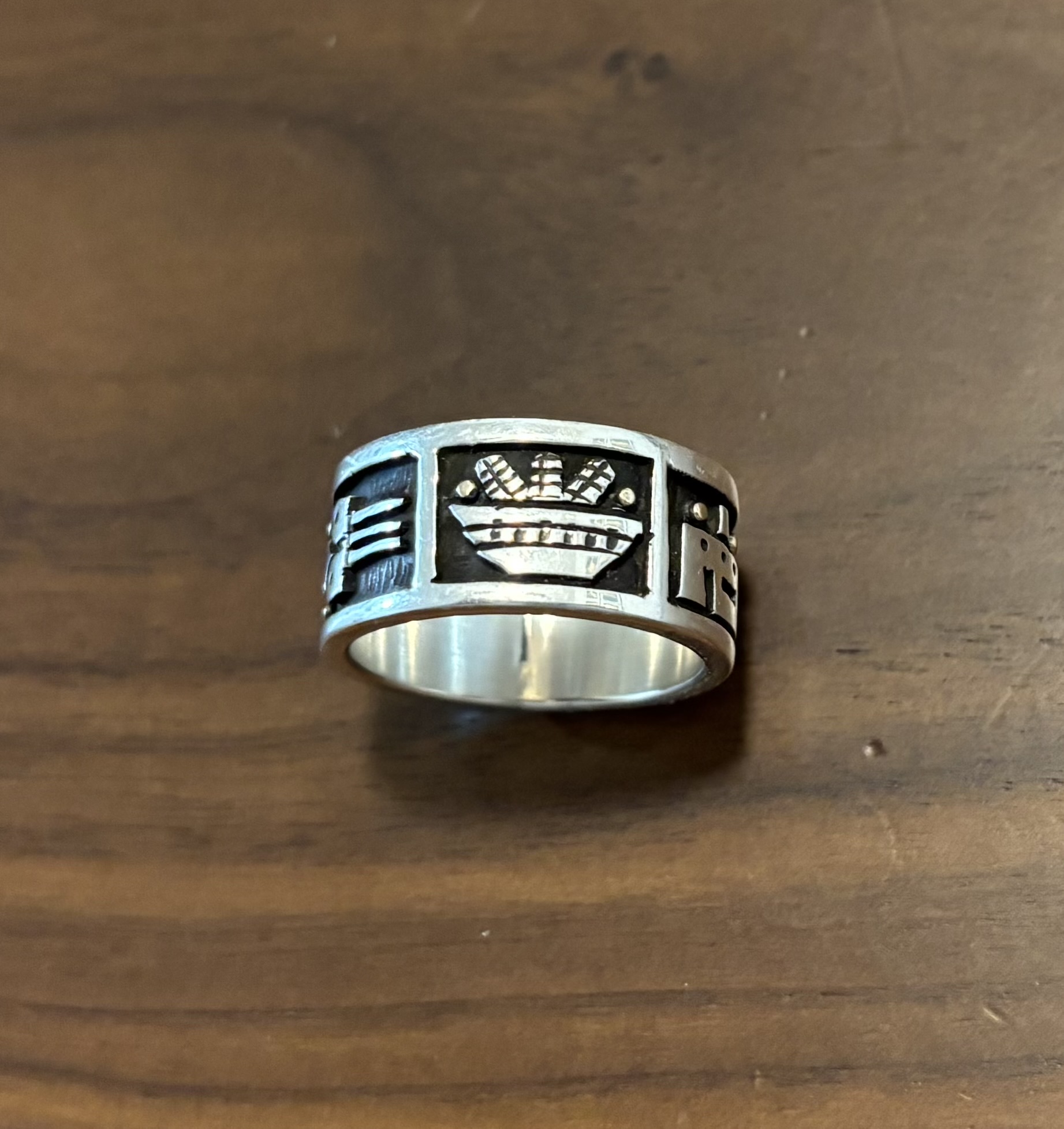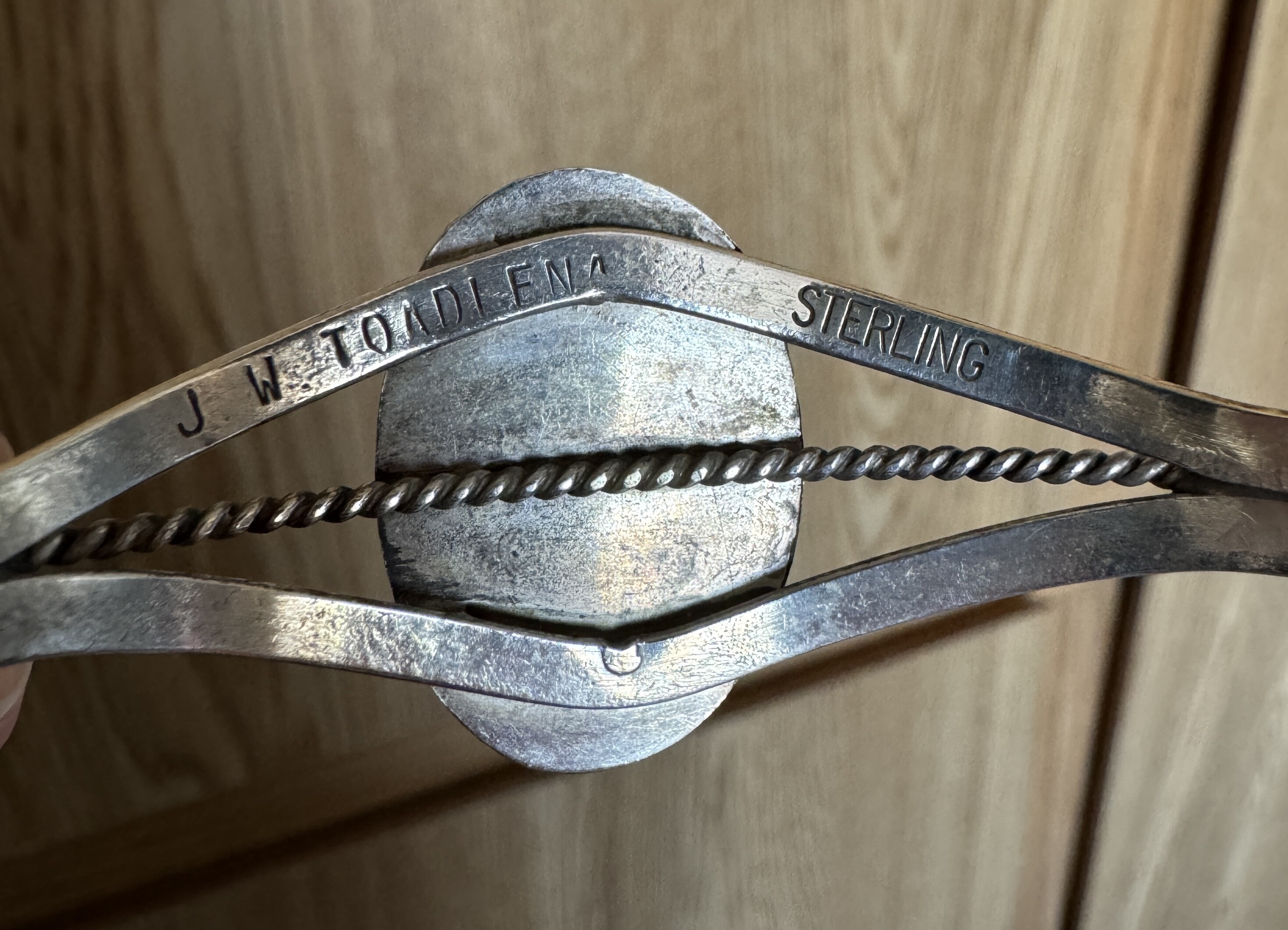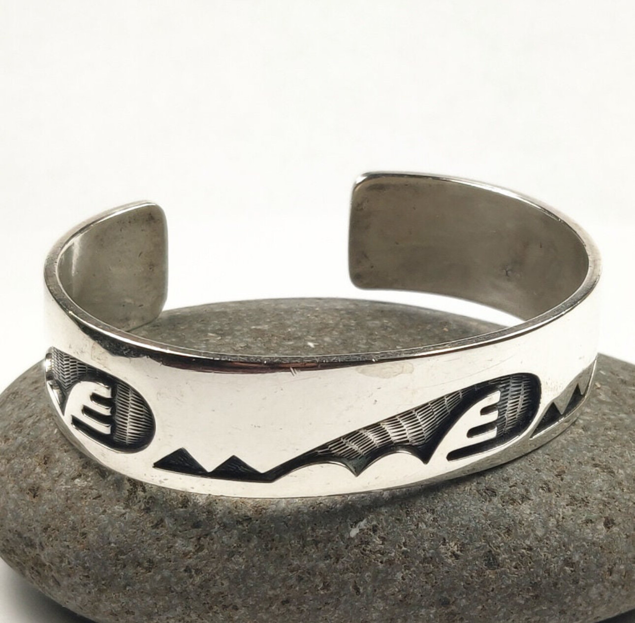 Just got this Hopi bracelet. Has the Hopicraft mark but no maker mark. Maybe made by Wayne or Emory? Either way, I love the simplicity of the design. Looks like Hopi symbols for rain, clouds (sky band), and water.