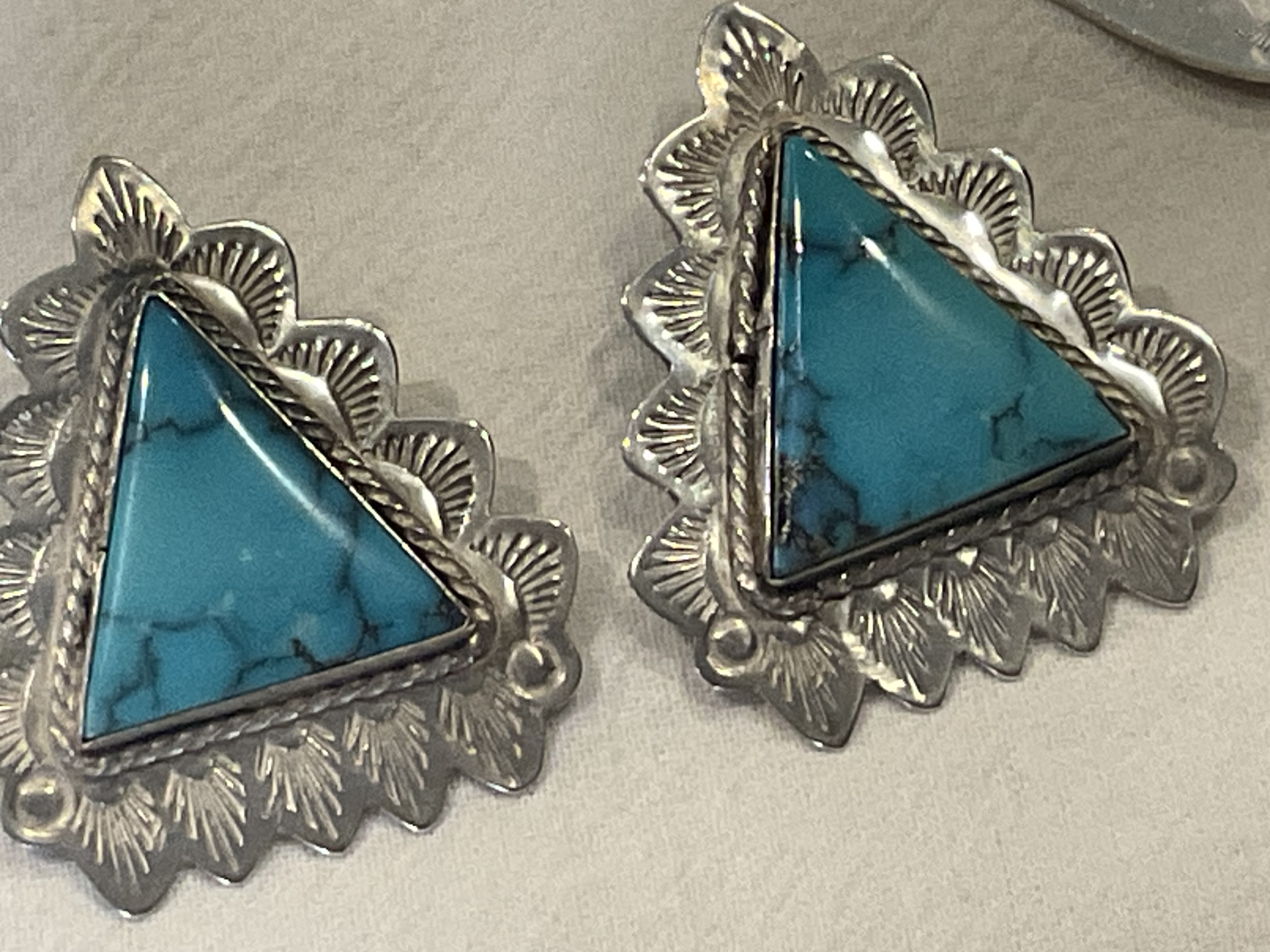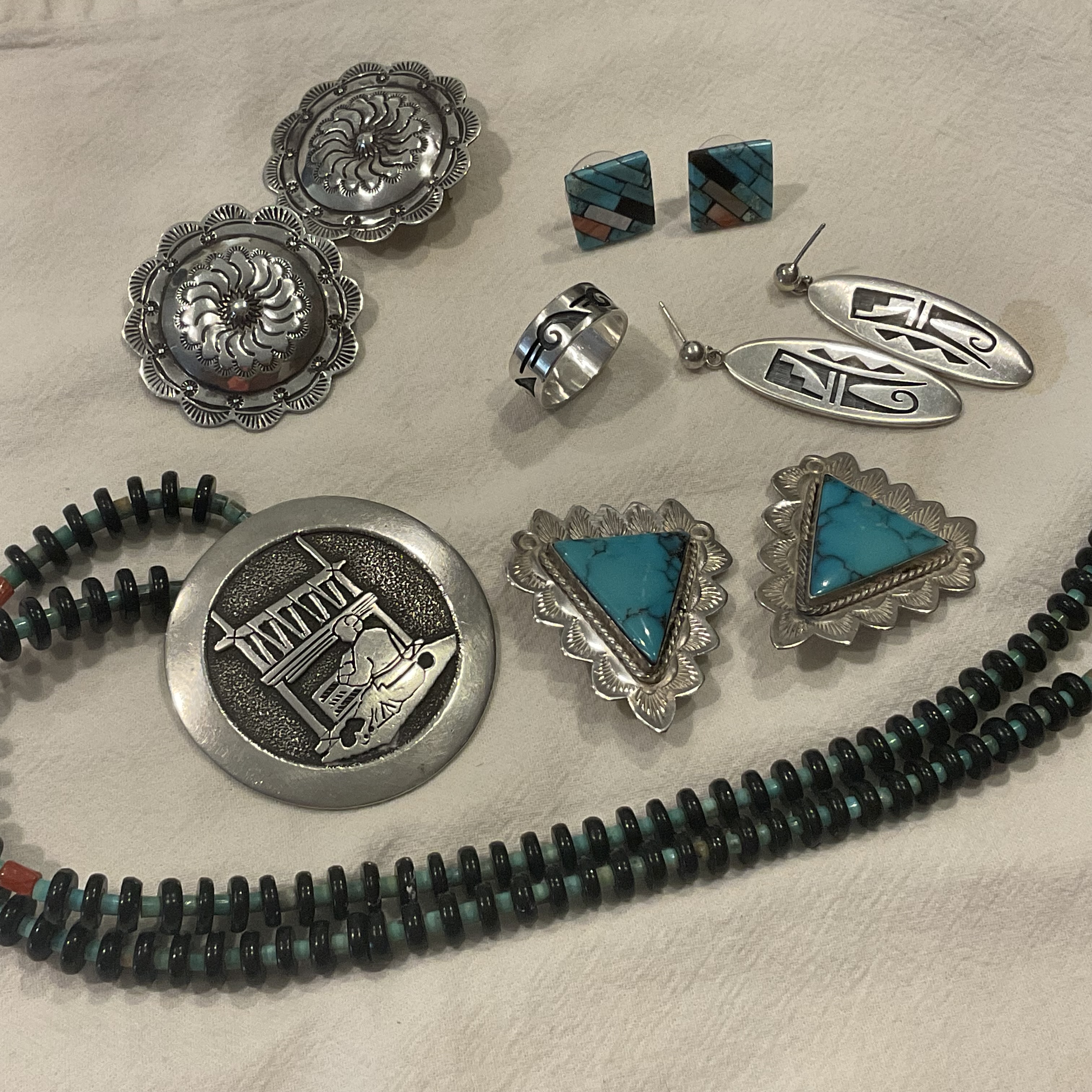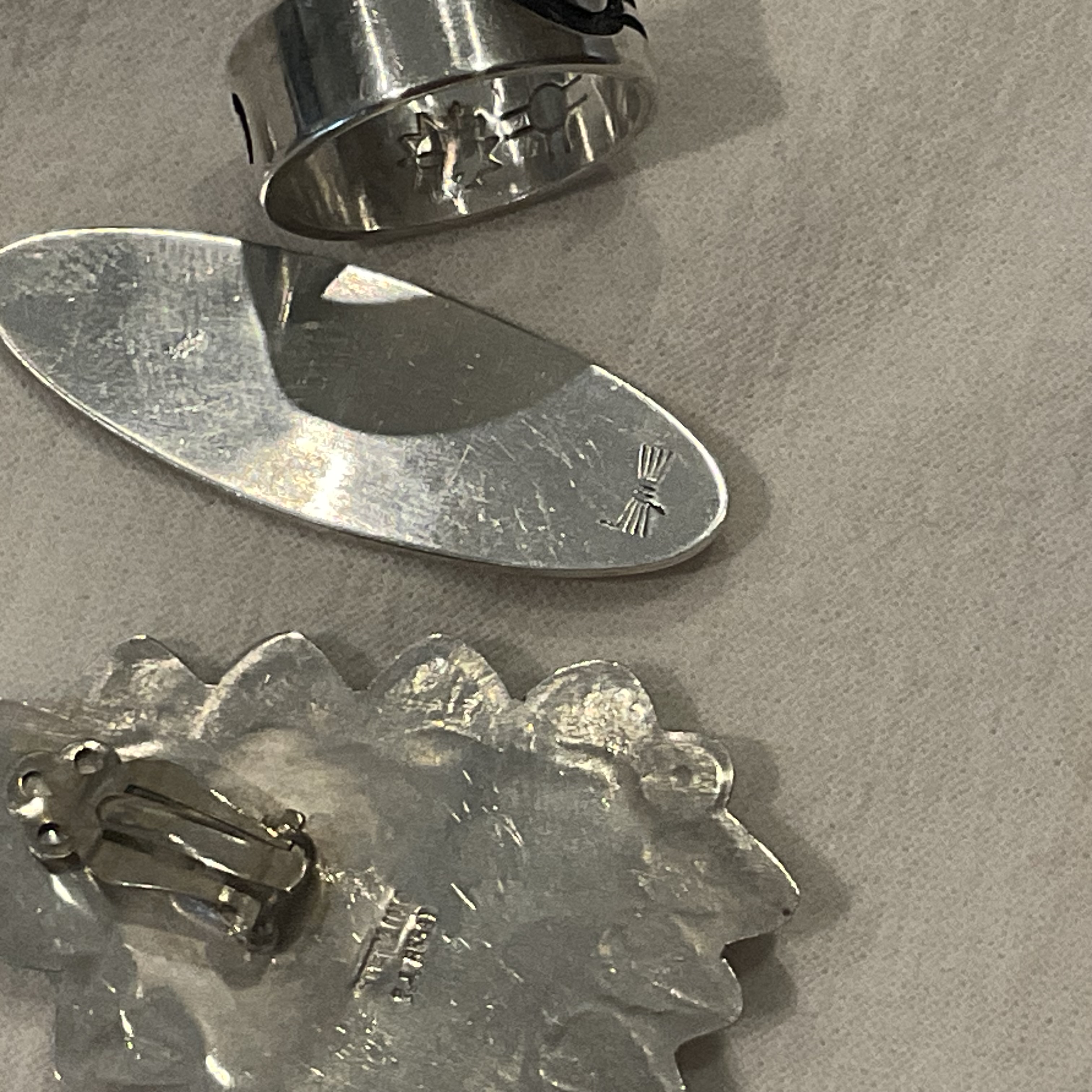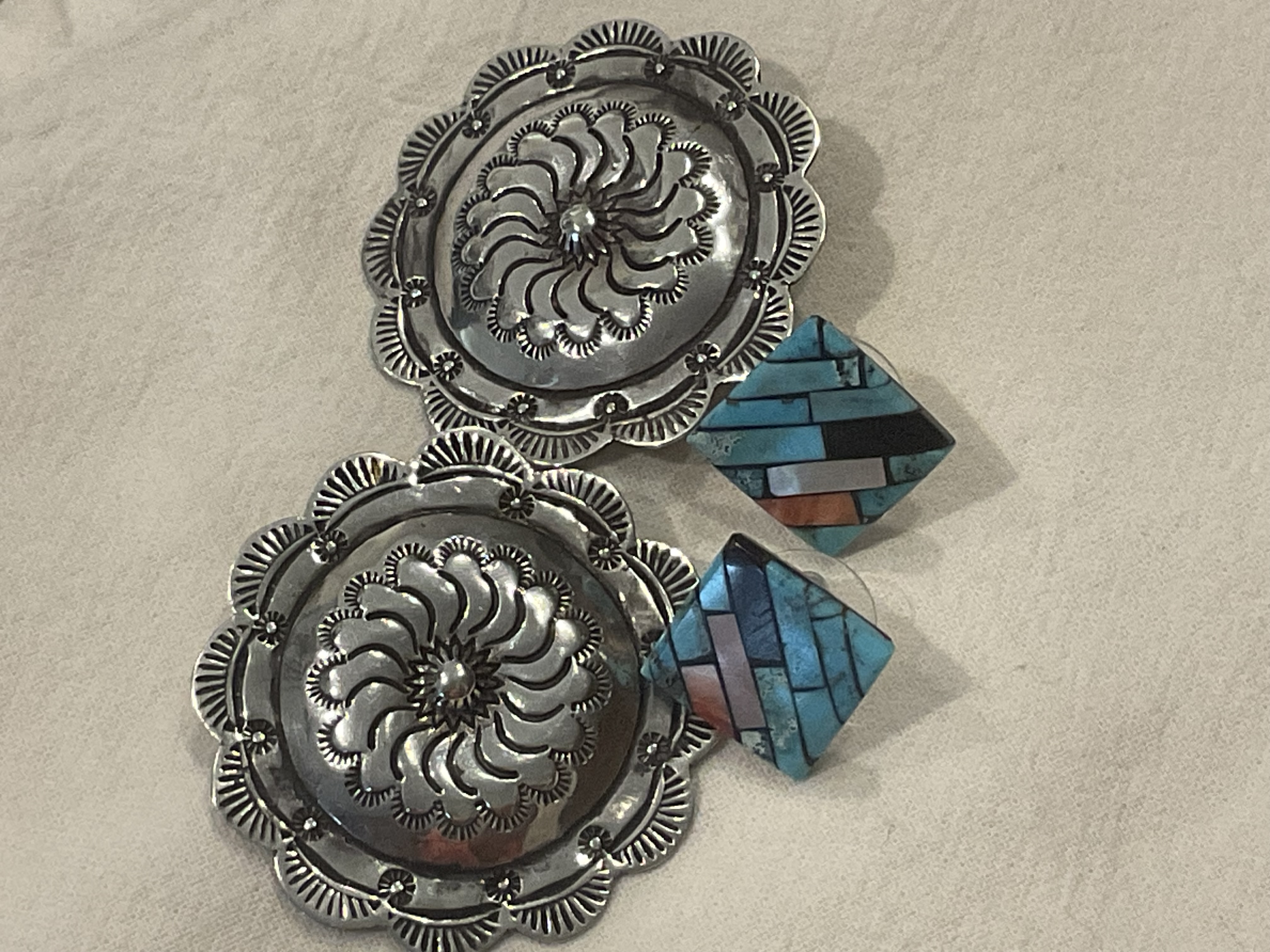 I have some new additions I bought over take course of the month. Small item purchases but for a good price. What are your opinions of the Paquin pendant and necklace? Also…what can one put over a hallmark so it doesn’t wear down…tape? Clear Fingernail polish? Thank you! Second photo is pendant and necklace by O. Paquin. Third photo shows turquoise earrings by P.J. Begay. Hopi earrings by Alvin Taylor and Hopi ring by Milson Taylor. 4th photo has no hallmarks on two earrings. I like the conchos. Does the stamping look to be quality work? Last earrings by Begay were marked howlite but they were wrong so I got them for cheap. ![]()