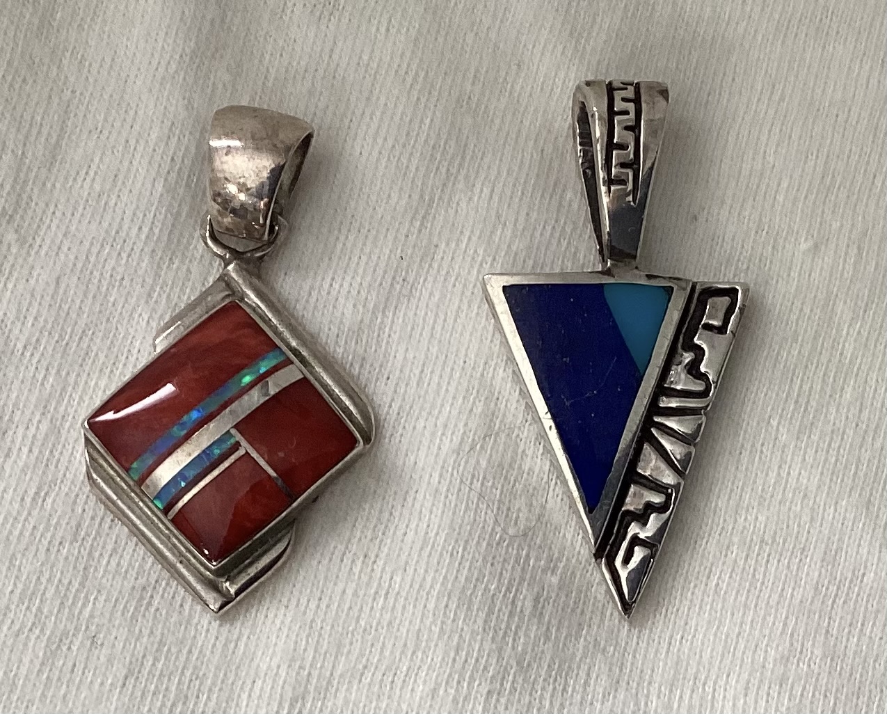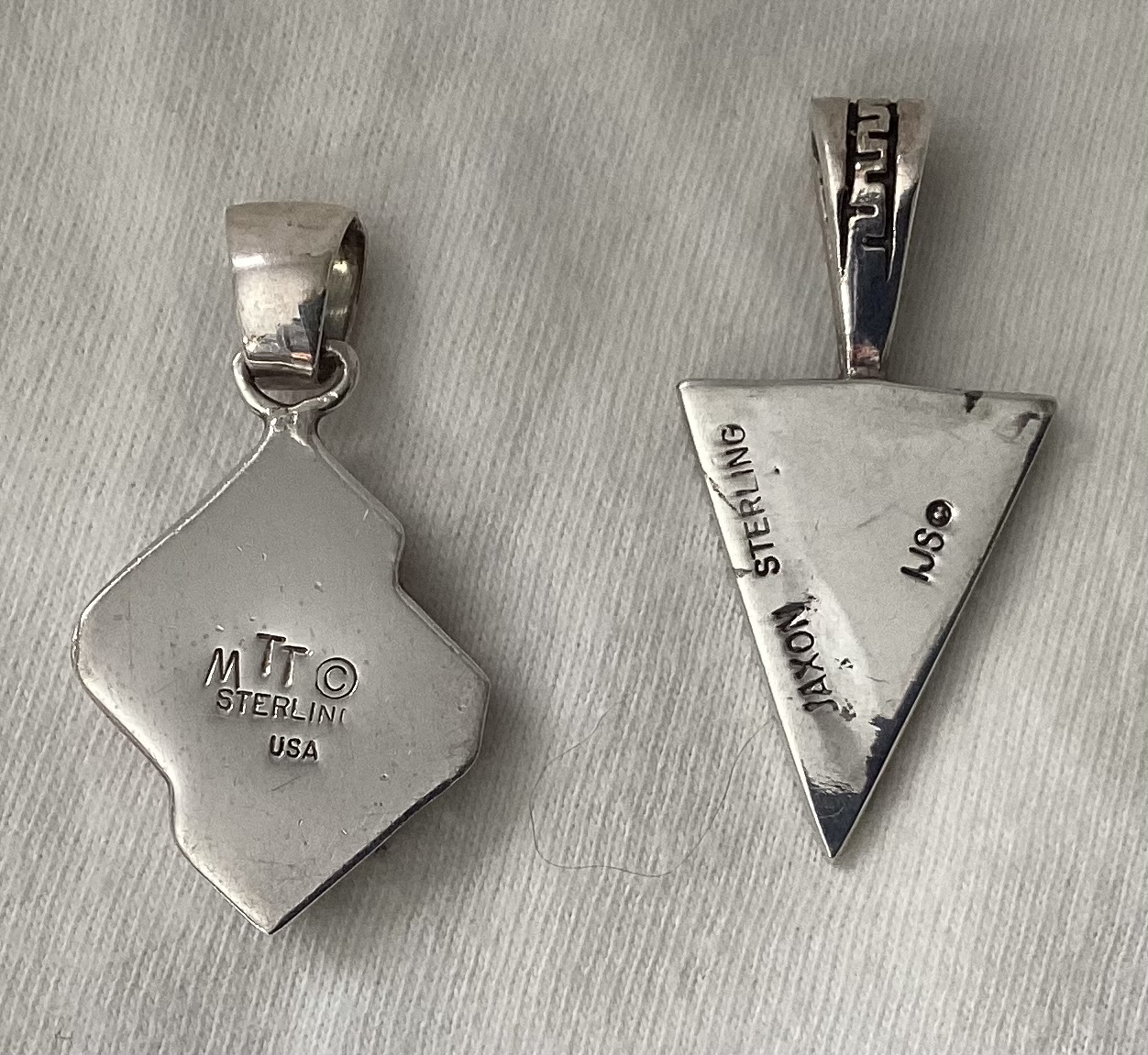 Picked up these pendants yesterday in a costume lot: one by Marie Tsosie and the other by Jaxon. The only reference to Jaxon I found was that he allegedly was a silversmith at Indian Jewelers Supply.