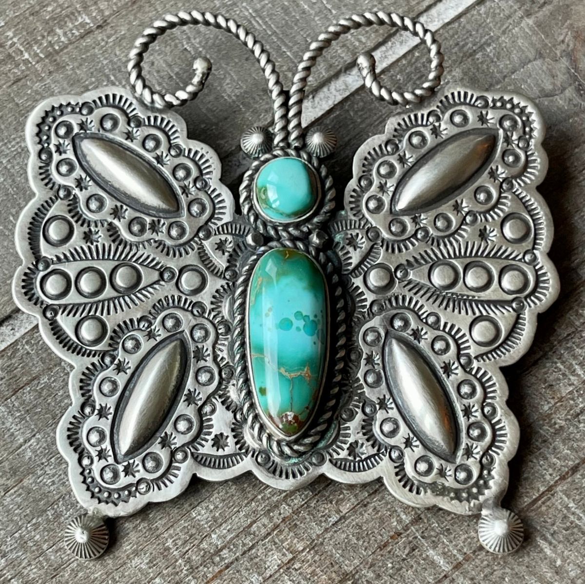 Unfortunately I don’t have any history on it beyond the proprietor saying that the consignor originally bought it in New Mexico (IIRC). However, I’m wondering if it might be a slightly earlier piece, as I looked through several online listings for Herman Smith’s butterflies and they typically seem to feature (1) less elaborately curved antennae and (2) no eye dots, such as this one. In fact, I found only one other by him with those features (it was auctioned on estatesales-net in 2023.) But that’s just a guess, and it may have nothing to do with a shift in style.