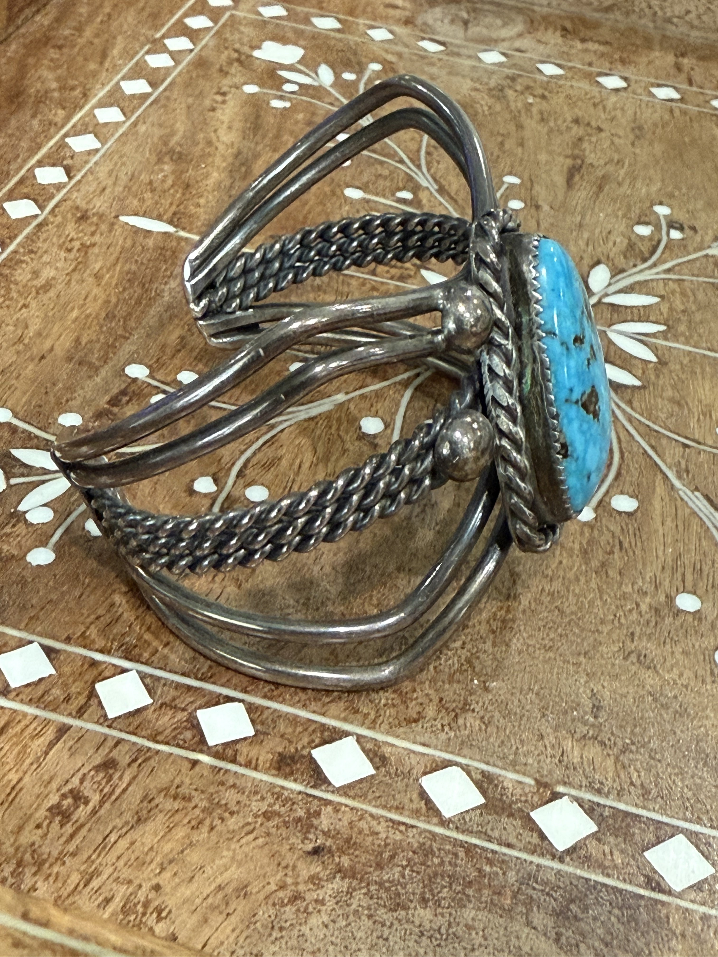 Spider, but not itsy-bitsy! The turquoise is beautiful, and I also love how the cuff sides include so many diagonal angles. It looks like the turquoise is radiating energy!