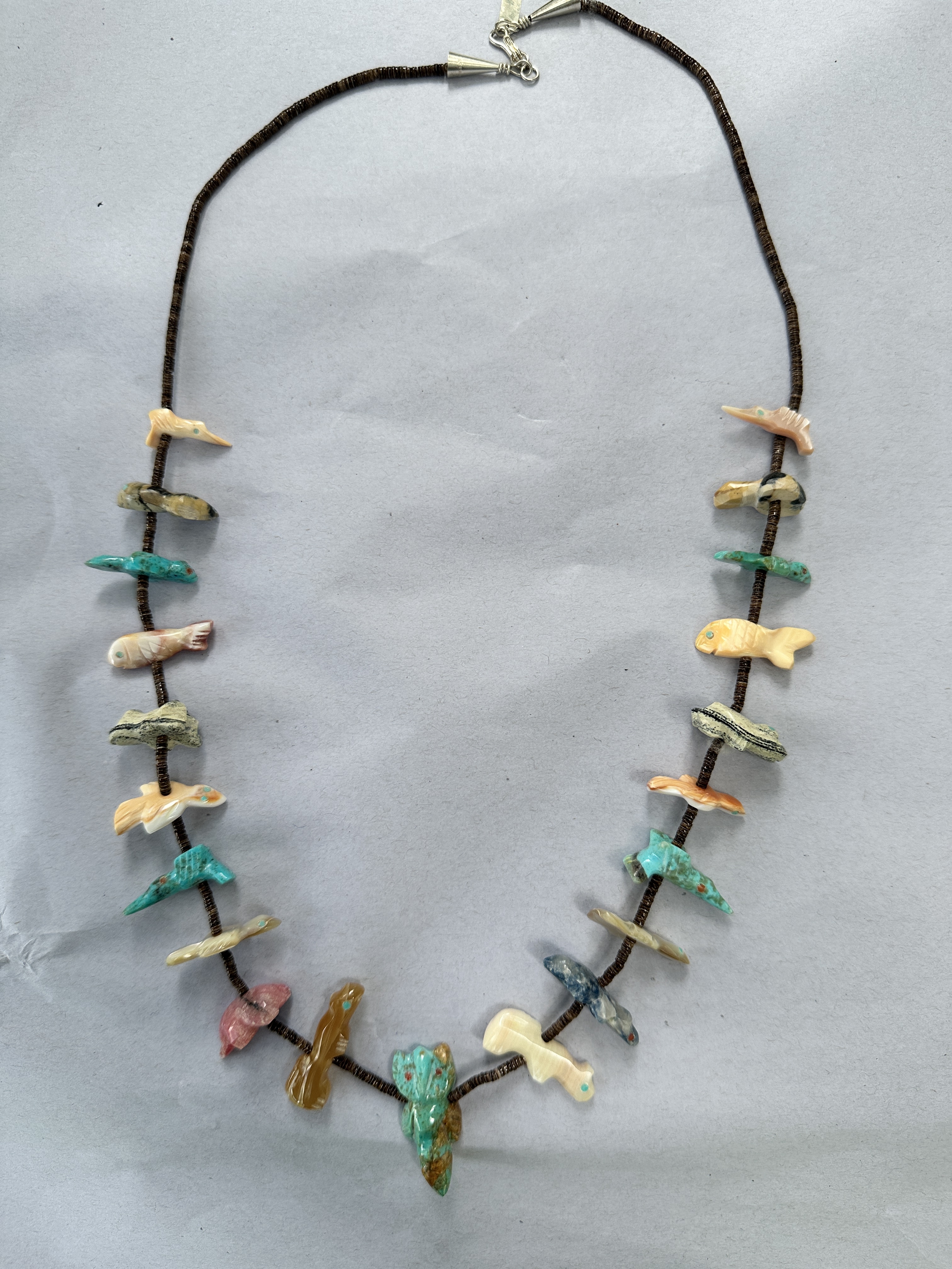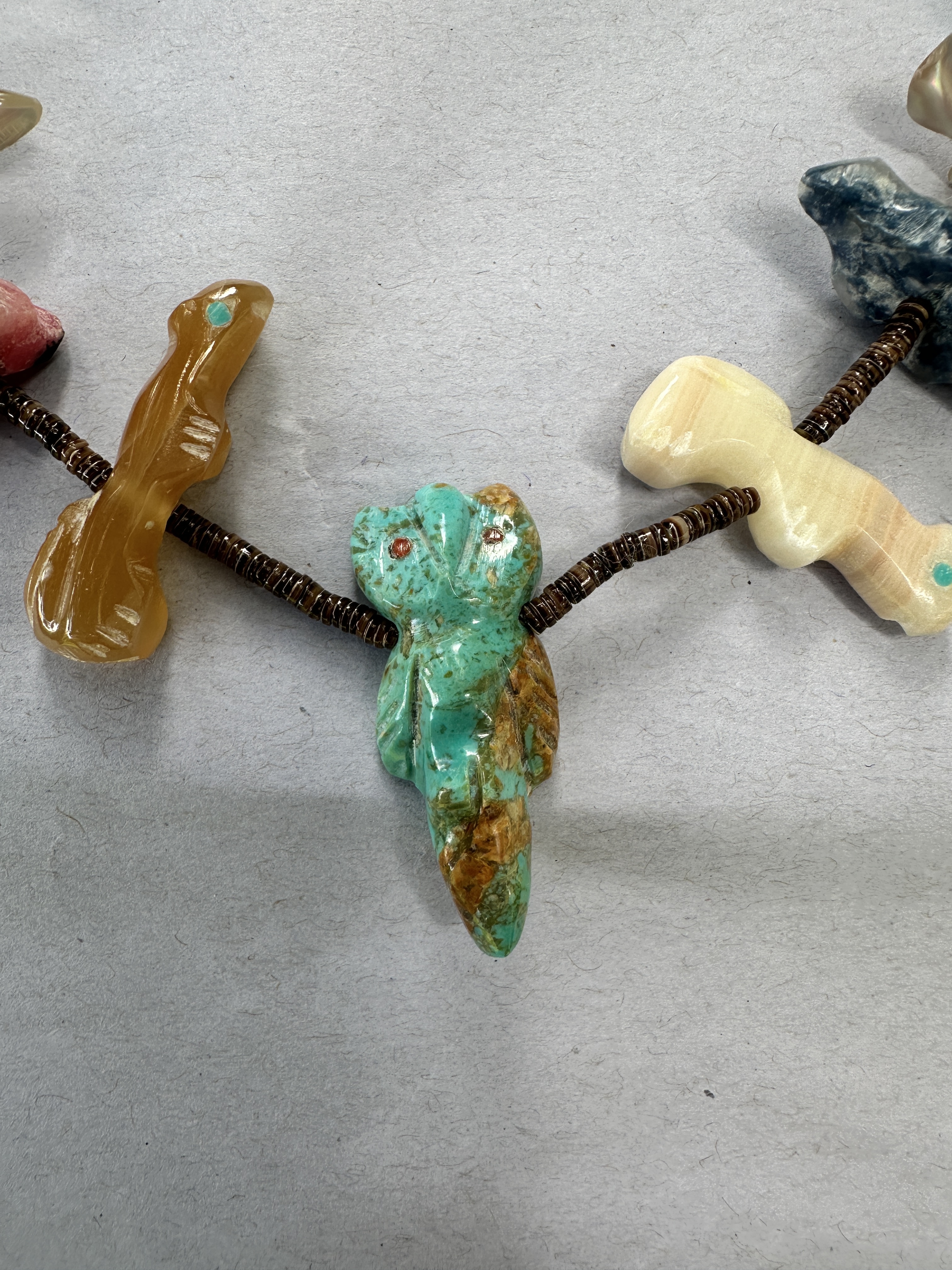 I’ve waited to purchase a Zuni fetish necklace until just the right one came along. This is the one that captured my heart. It’s by Lena Boone. The anchoring owl especially speaks to me but each little animal is endearing.