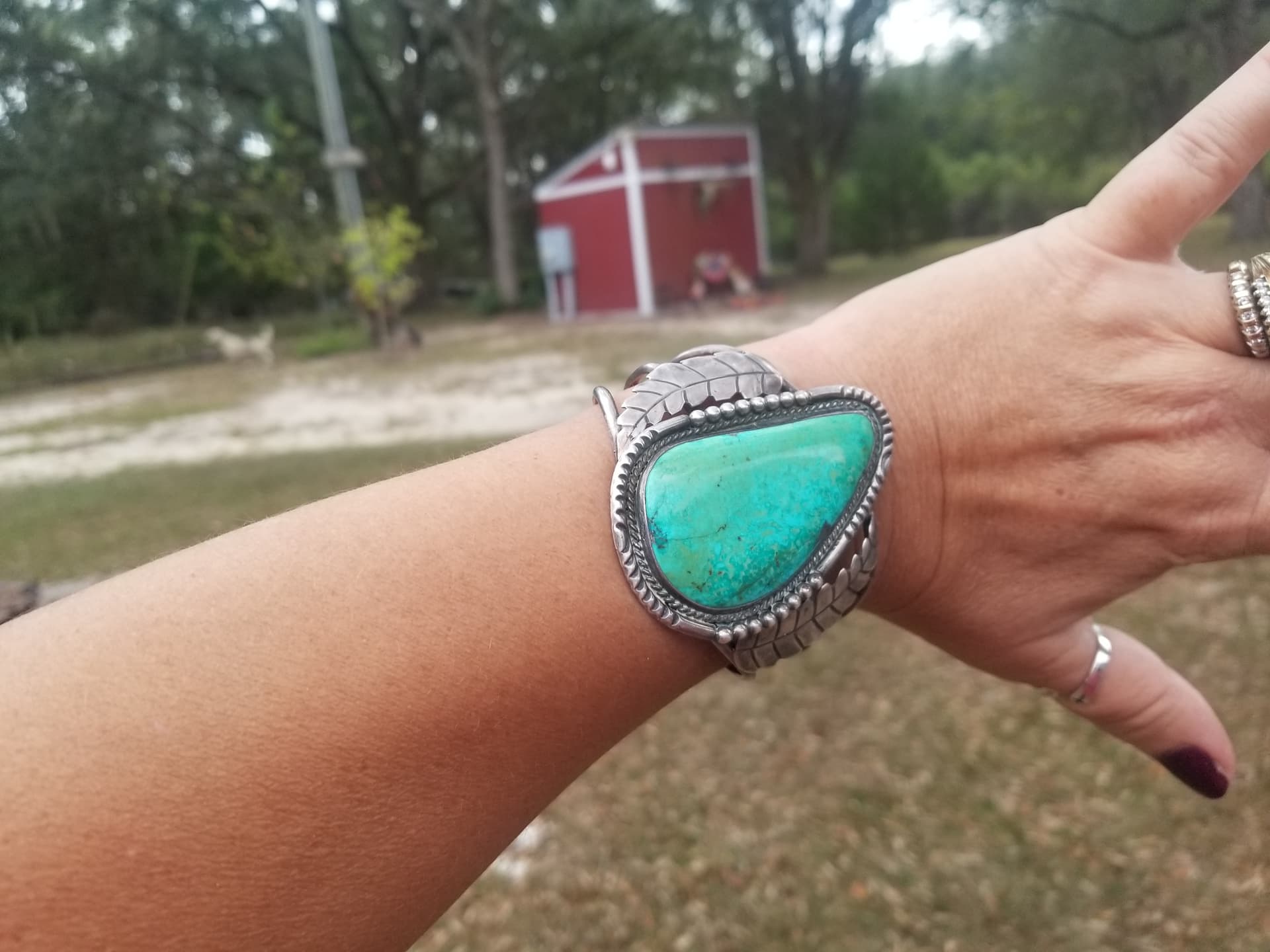 Trying to figure out info on this cuff I recieved as a gift. It is not stamped sterling or 925. I believe it may have a little age to it. The turquoise is a captivating color.