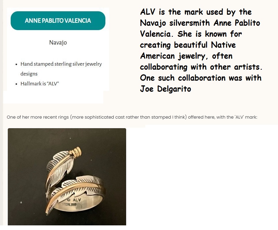 ALV is the mark used by the Navajo silversmith Anne Pablito Valencia . She is known for creating beautiful Native American jewelry, often collaborating with other artists. One such collaboration was with Joe Delgarito